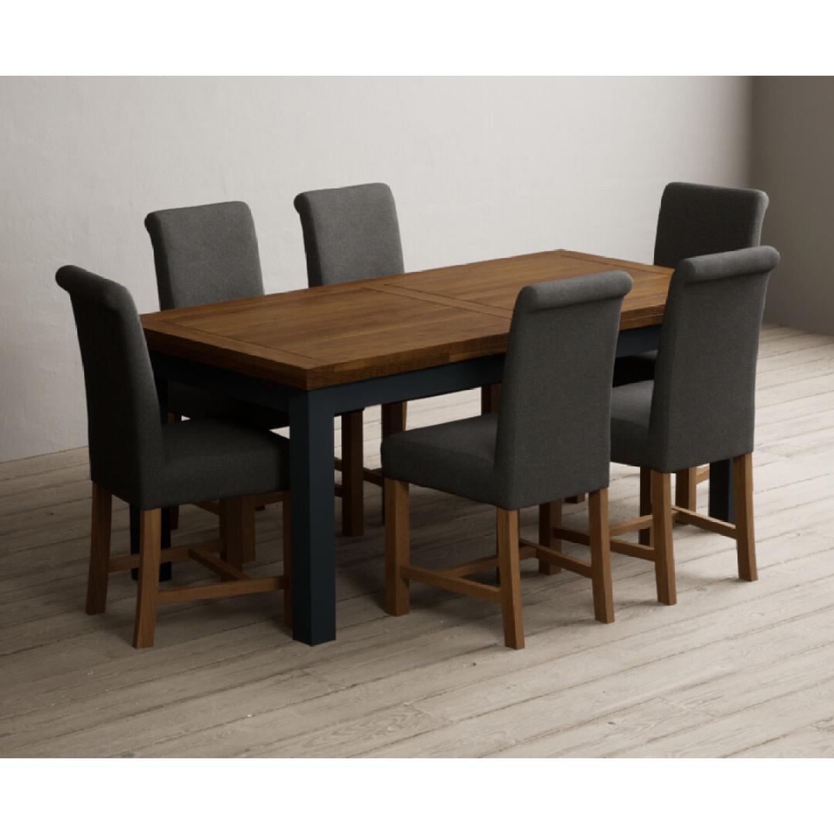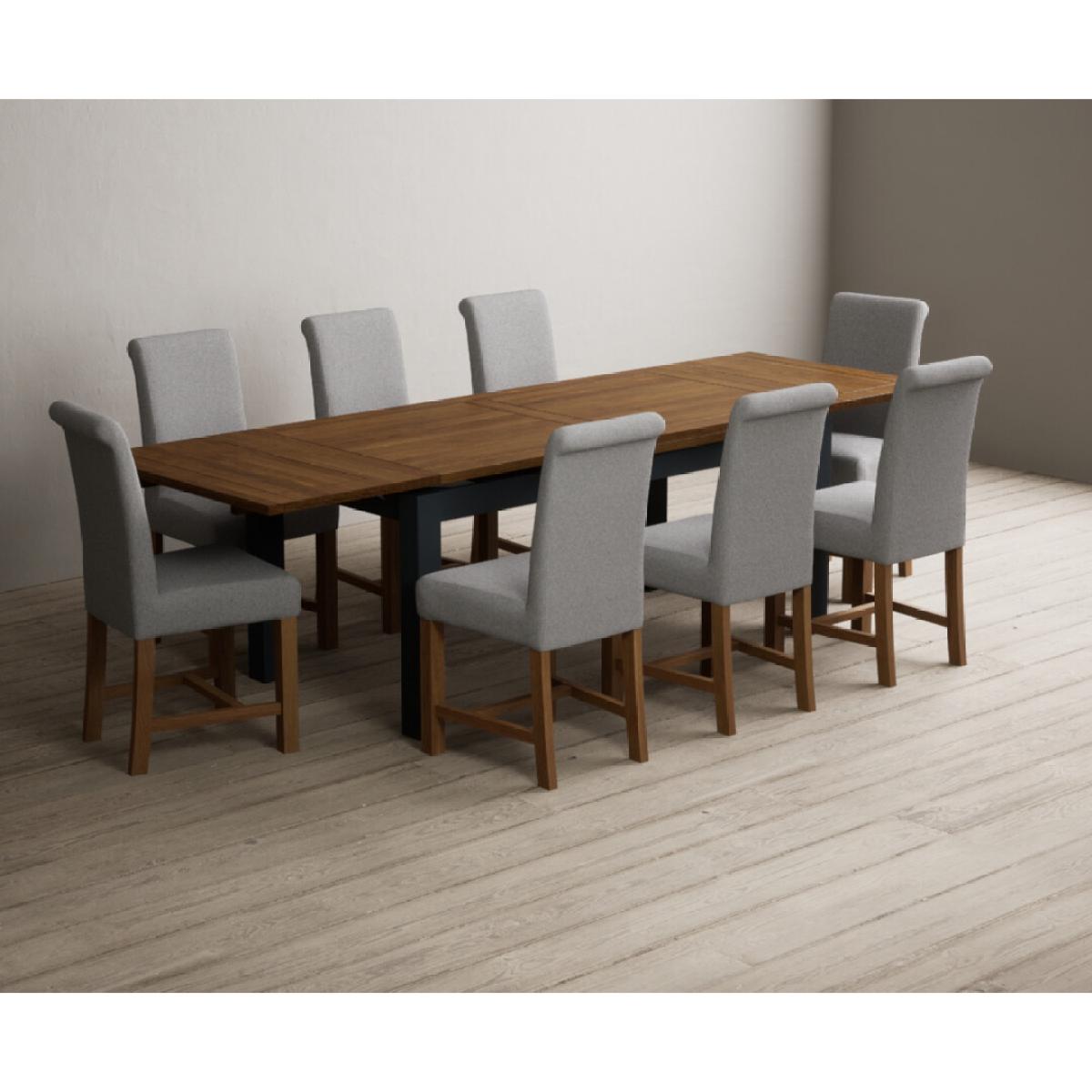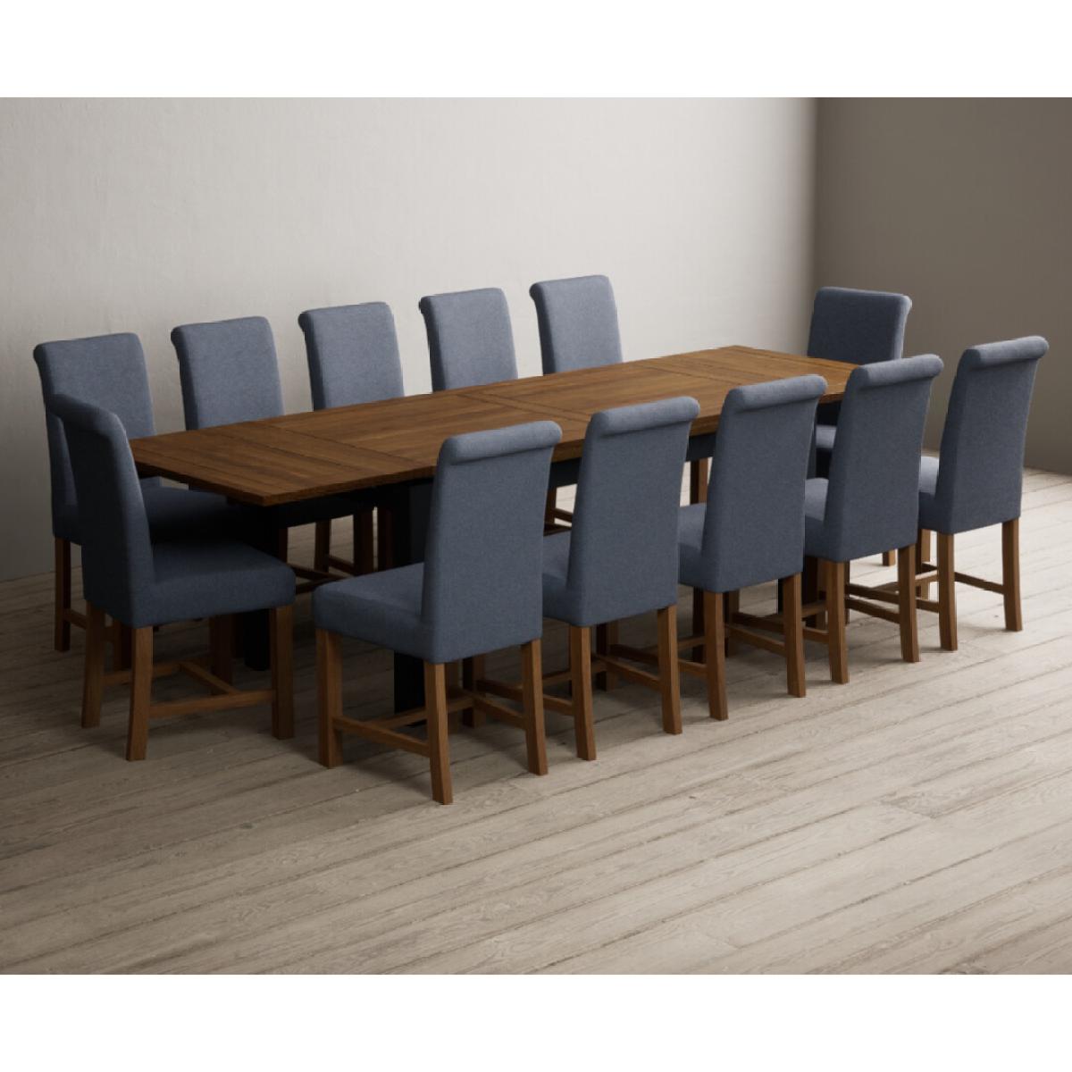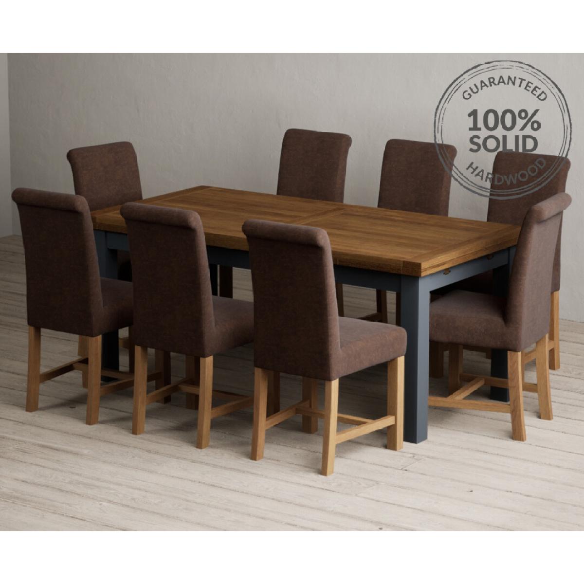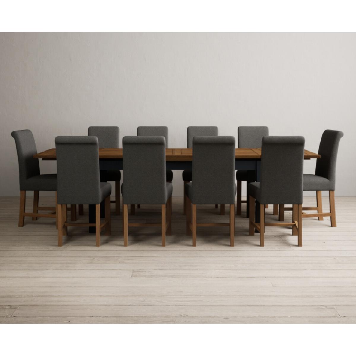 Extending Buxton 180cm Oak and Dark Blue Painted Dining Table with 8 Blue Scroll Back Chairs
