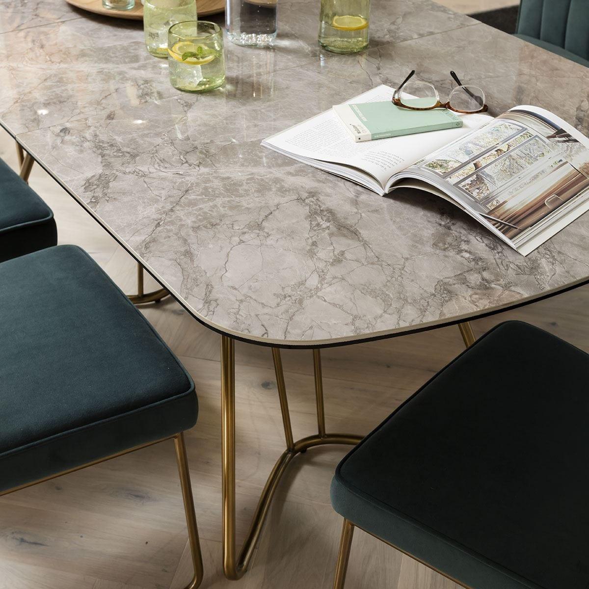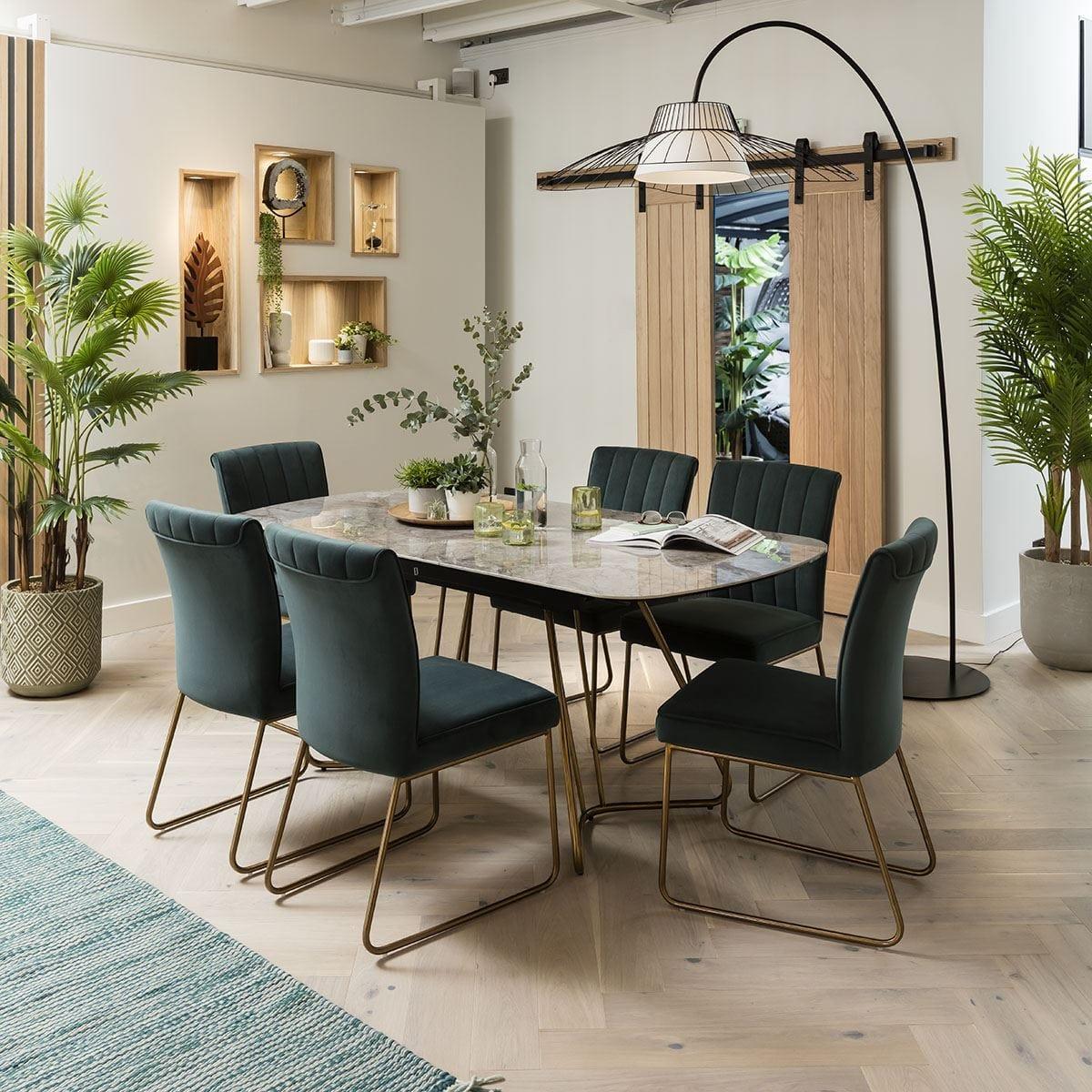 The Deco Dining Table and Chairs Set is a versatile and stylish seating solution for any dining space. This dining set can comfortably seat up to 6 people. Extendable dining sets offer a perfect gathering spot for friends and family. The premium teal velvet upholstery is luxurious in its richness and vibrancy. Crafted with the utmost care, the chairs are upholstered in teal velvet, adding a rich and inviting ambiance to your dining area. The plush velvet not only feels indulgent but also enhances the overall visual appeal, making every meal a truly delightful experience. The Deco dining table is a perfect blend of functionality and style. With its auto-lift feature, extending the table has never been easier. Simply pull one side, and watch as the extension effortlessly pops up into place, giving you extra space in a matter of seconds. Crafted with utmost precision, this table boasts a premium grey ceramic top with a captivating glossy marble-effect finish. Not only does it exude elegance, but it also offers remarkable durability. The scratch, heat, and stain-resistant ceramic ensures that your table remains in pristine condition for years to come, even with everyday use. Designed to accommodate your needs, this dining set comfortably seats up to six people, making it ideal for intimate family dinners or gatherings with friends. The extendable dining table features an auto-lift feature, extending the table has never been easier. Simply pull one side, and watch as the extension effortlessly pops up into place. Whether you're hosting a formal dinner party or enjoying a casual brunch, this dining table provides the perfect setting for memorable moments and engaging conversations. W180cm D90cm H76cm Auto-Lifting Extension Modern 6 Seater Dining Set with Extending Table