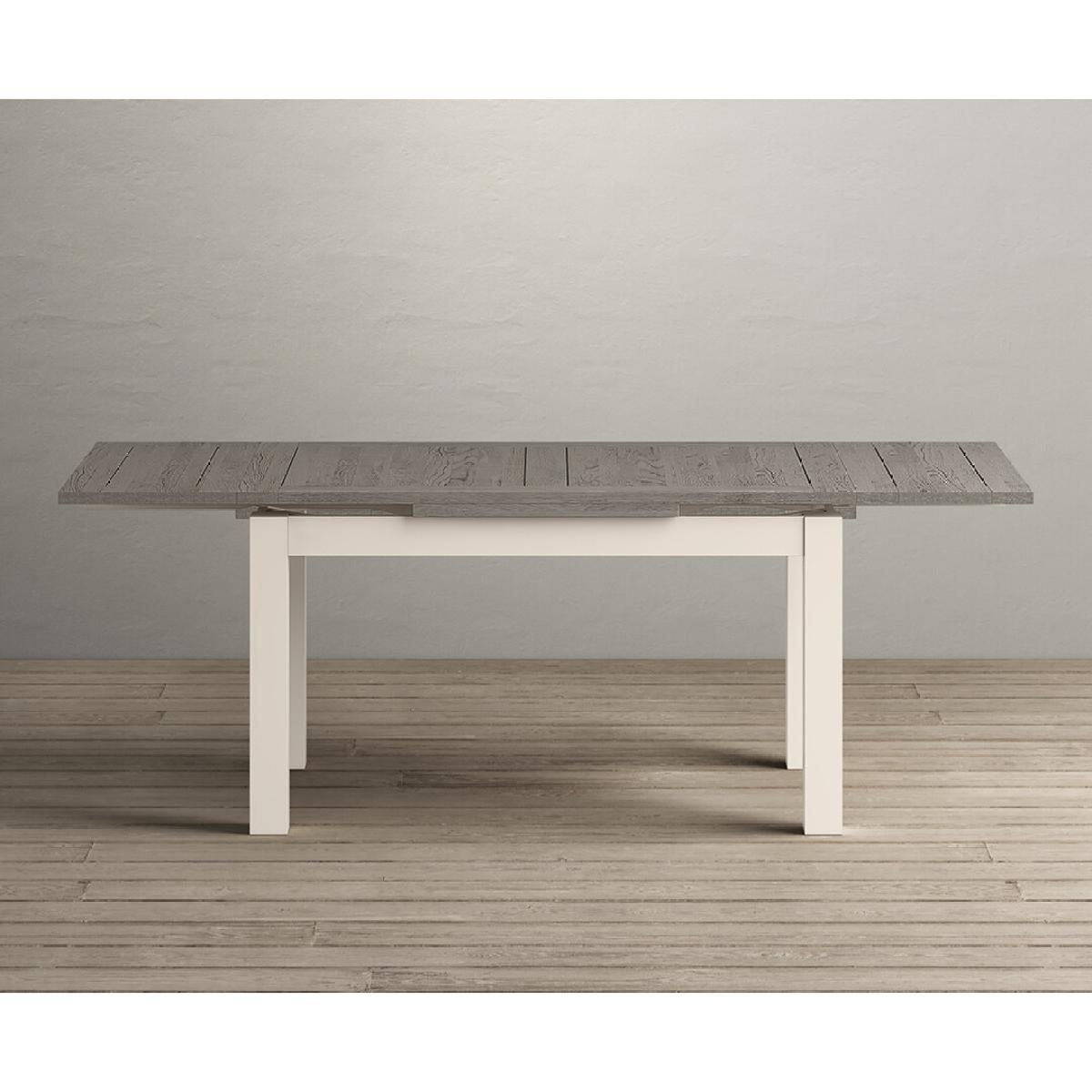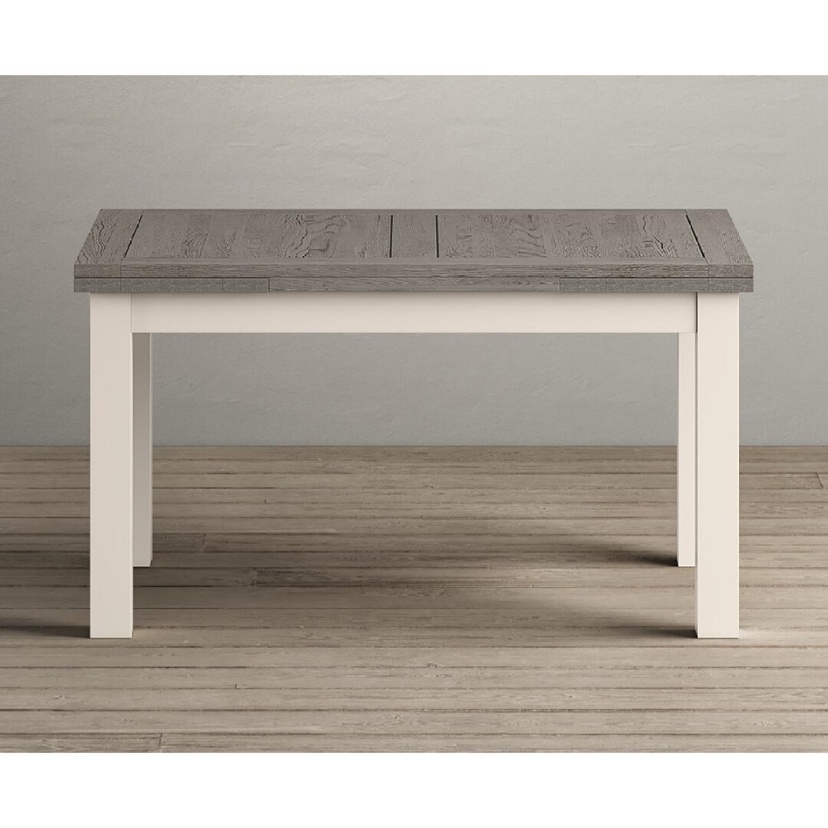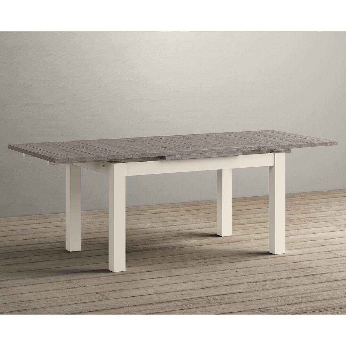 The Extending Dartmouth 140cm Oak and Soft White Painted Dining Table is a stylish extending dining table with a white painted solid hardwood frame and grey oak top.