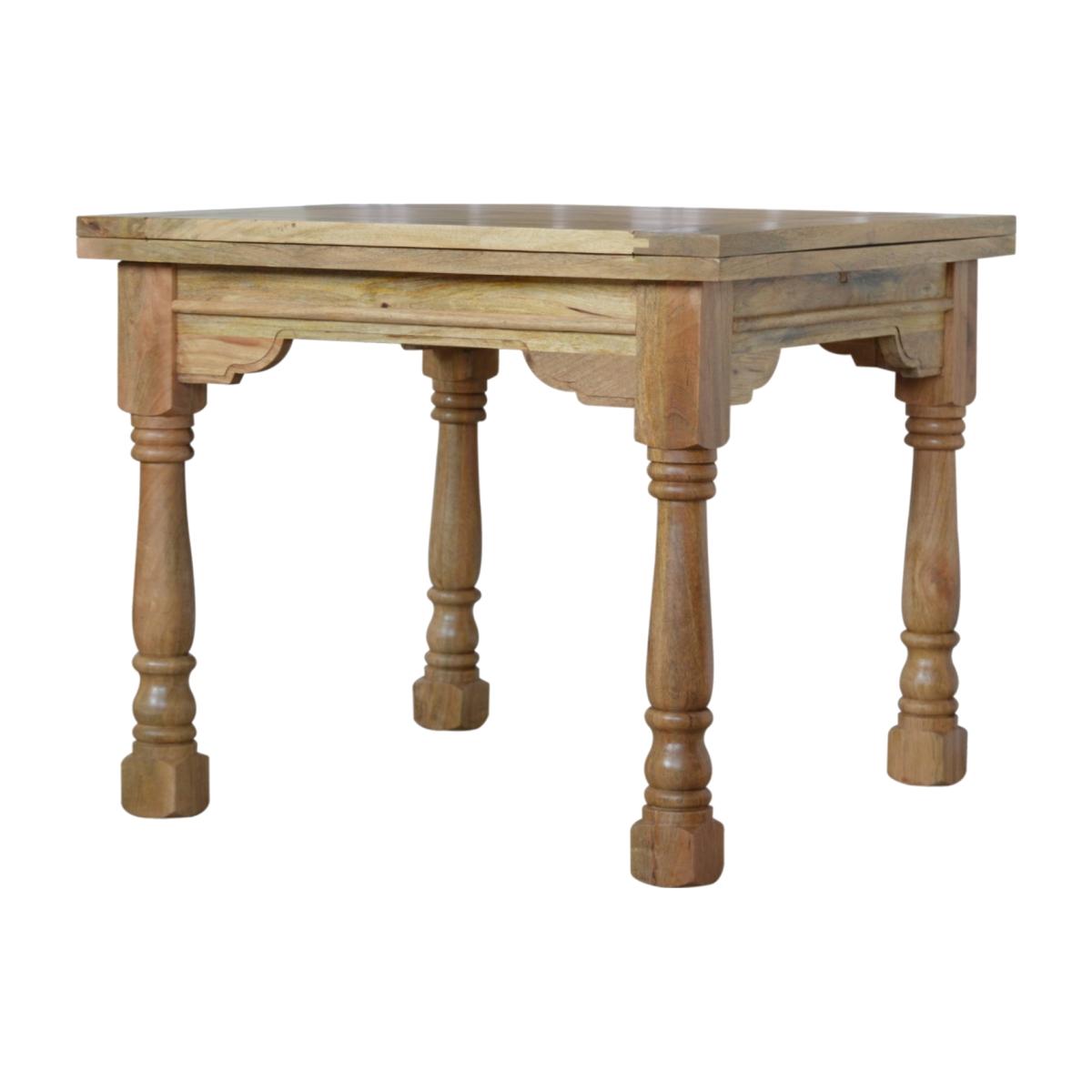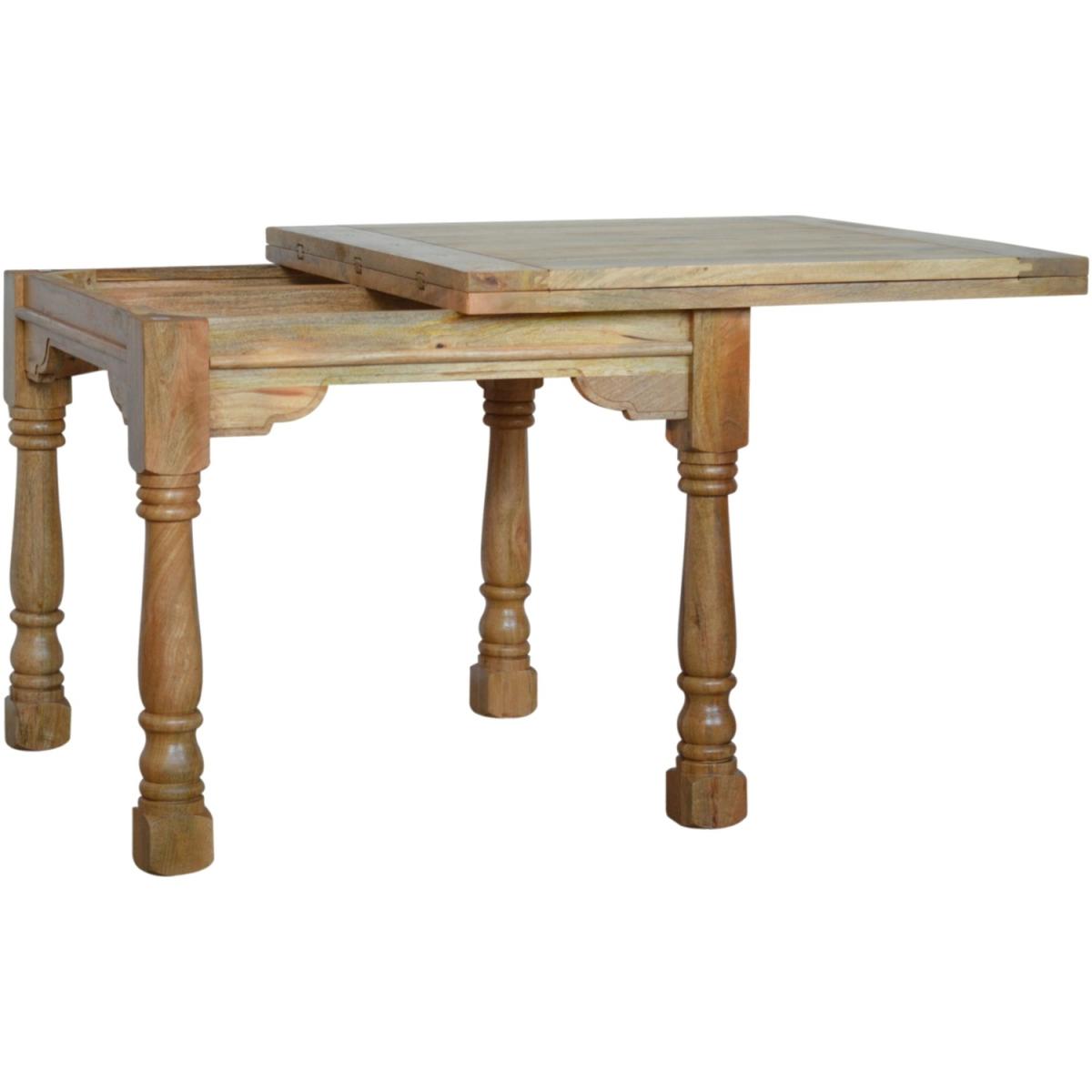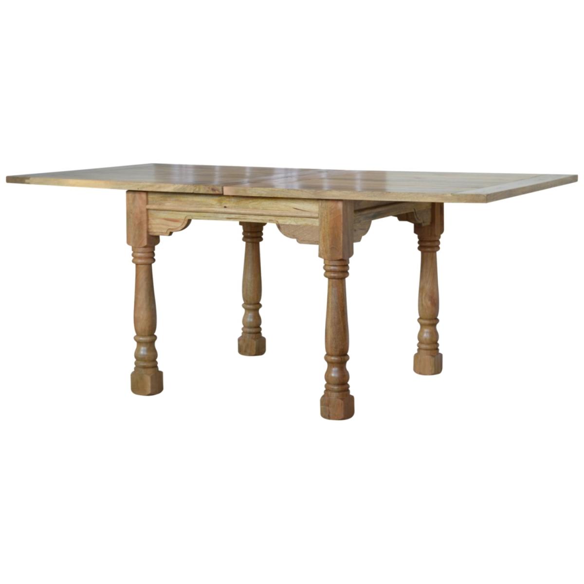 This charming butterfly table is excellent for intimate dinners for two in kitchen-diners or smaller dining rooms, but extends to seat four to six people when needed. This table has a butterfly extension that stores beneath the tabletop and is very easy to use. This piece has been built to last, with a simple functional design and hints of country charm made from 100 percent solid Mango wood with a fine hand-distressed oak ish finish.
