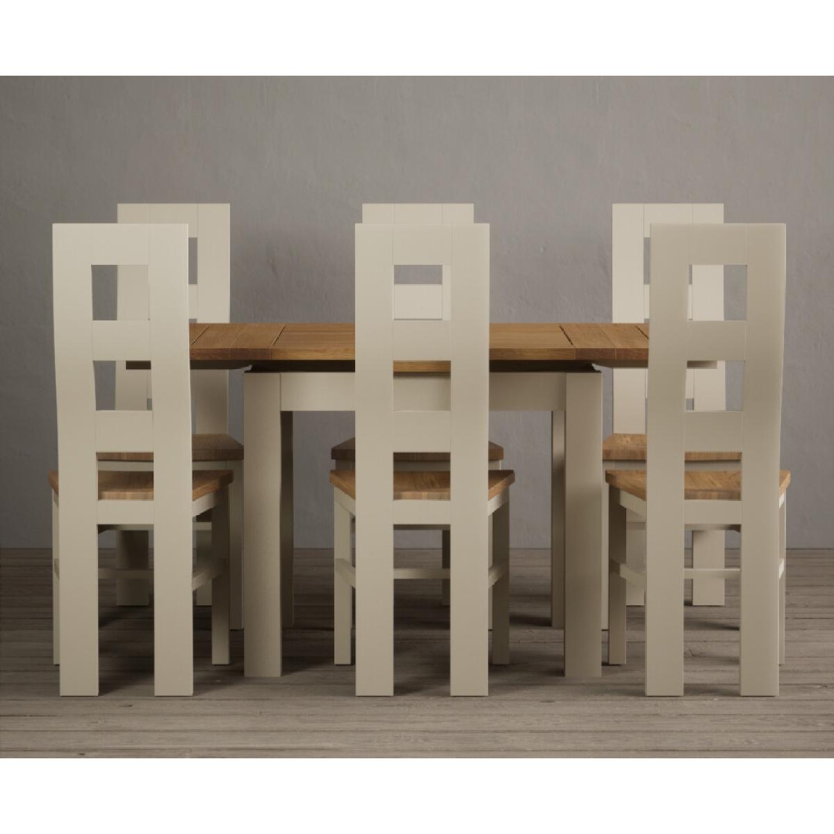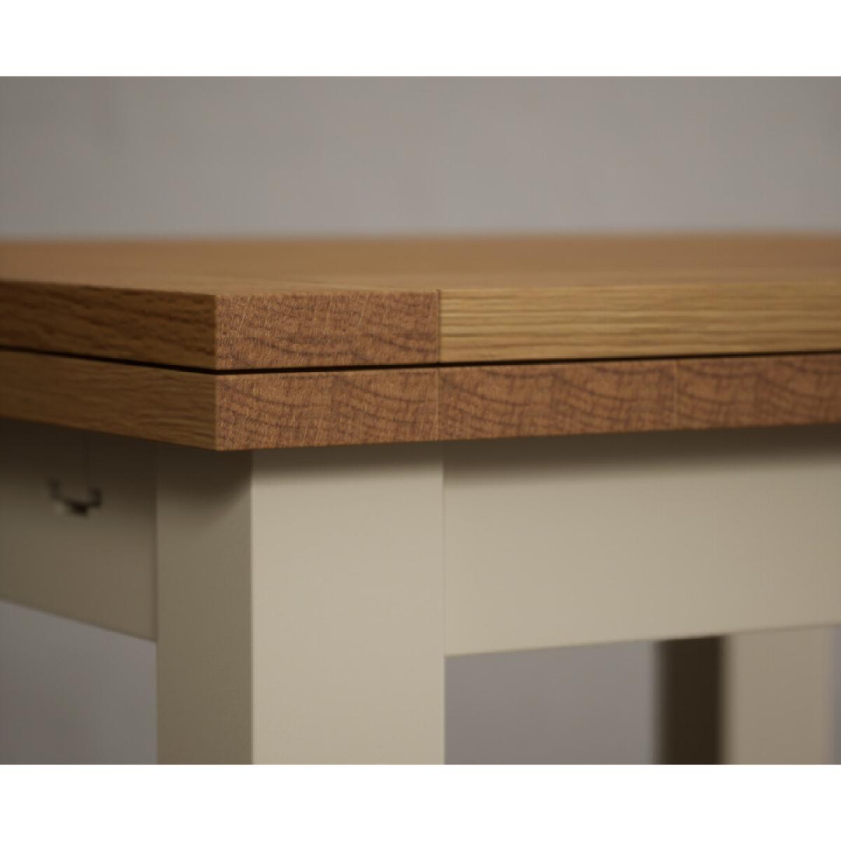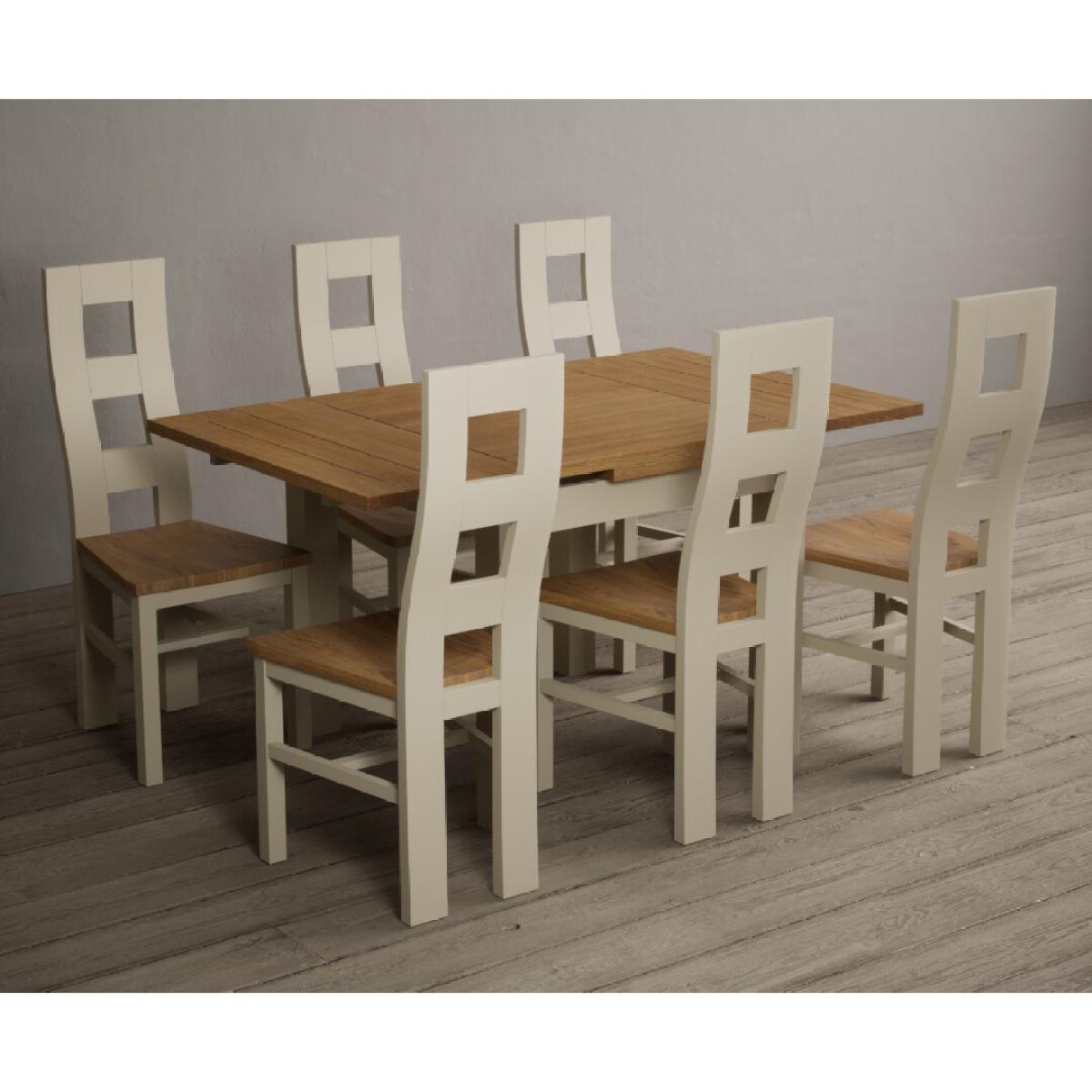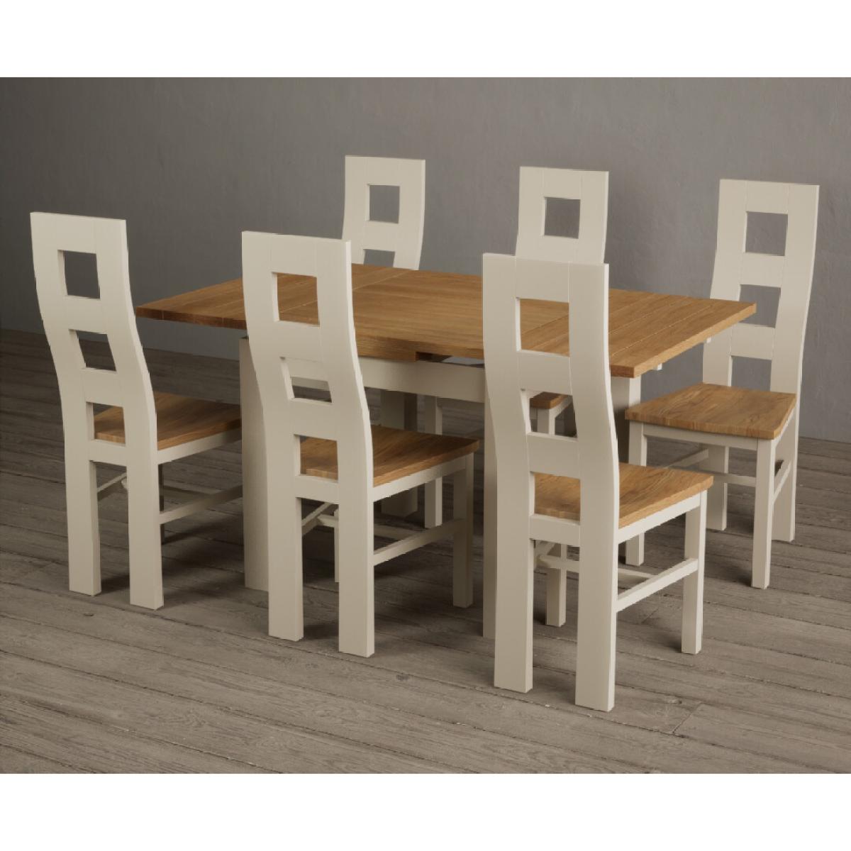 The Extending Hampshire 90cm Oak and Cream Dining Table with Flow Back Chairs is a space-saving dining set with an oak and cream painted extending table with matching hardwood chairs.