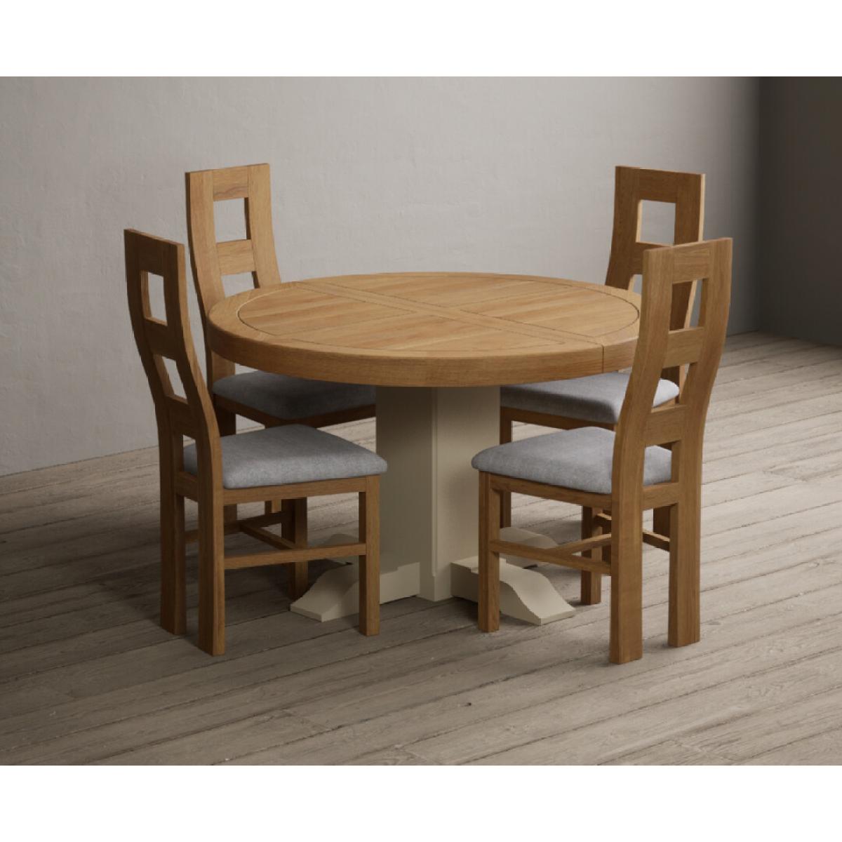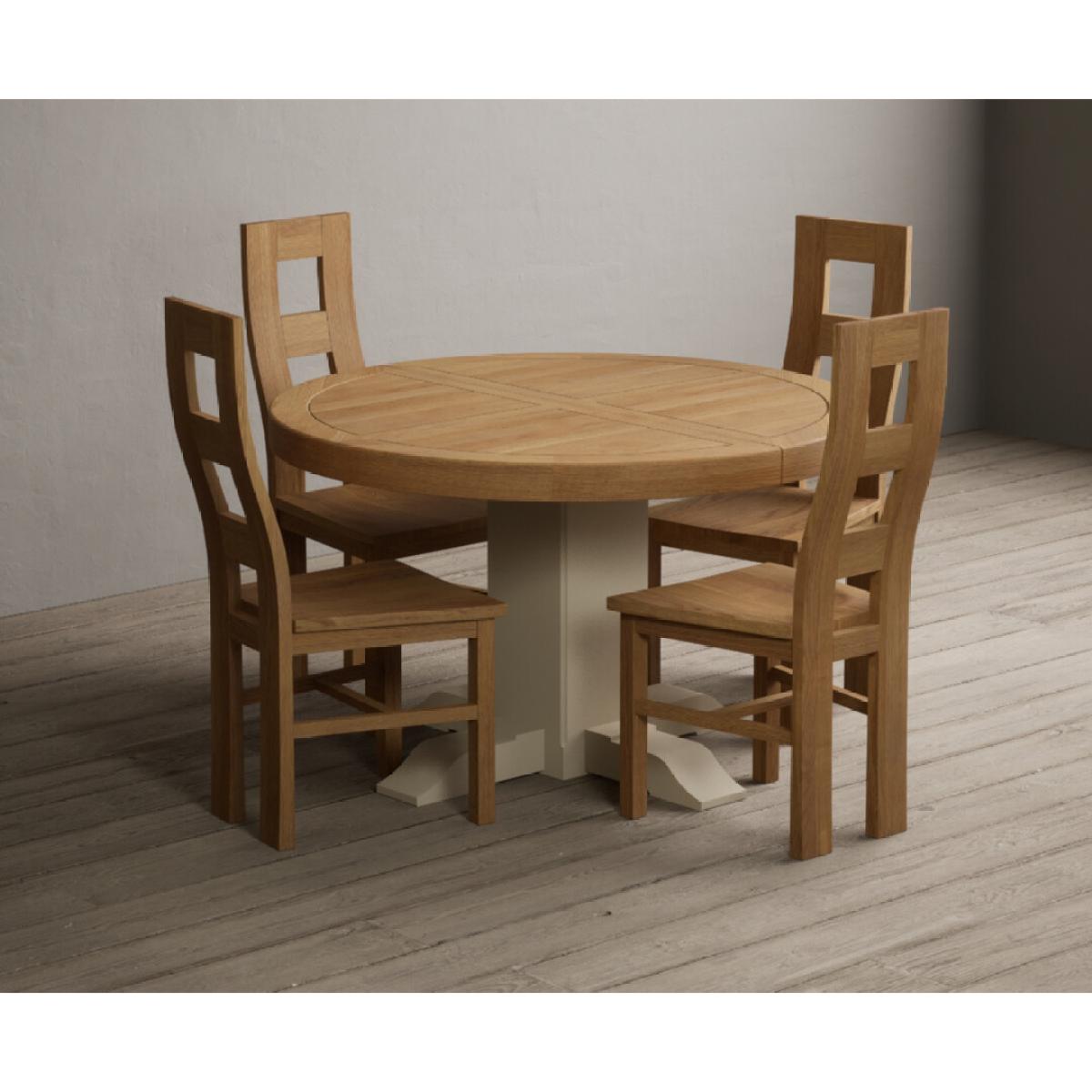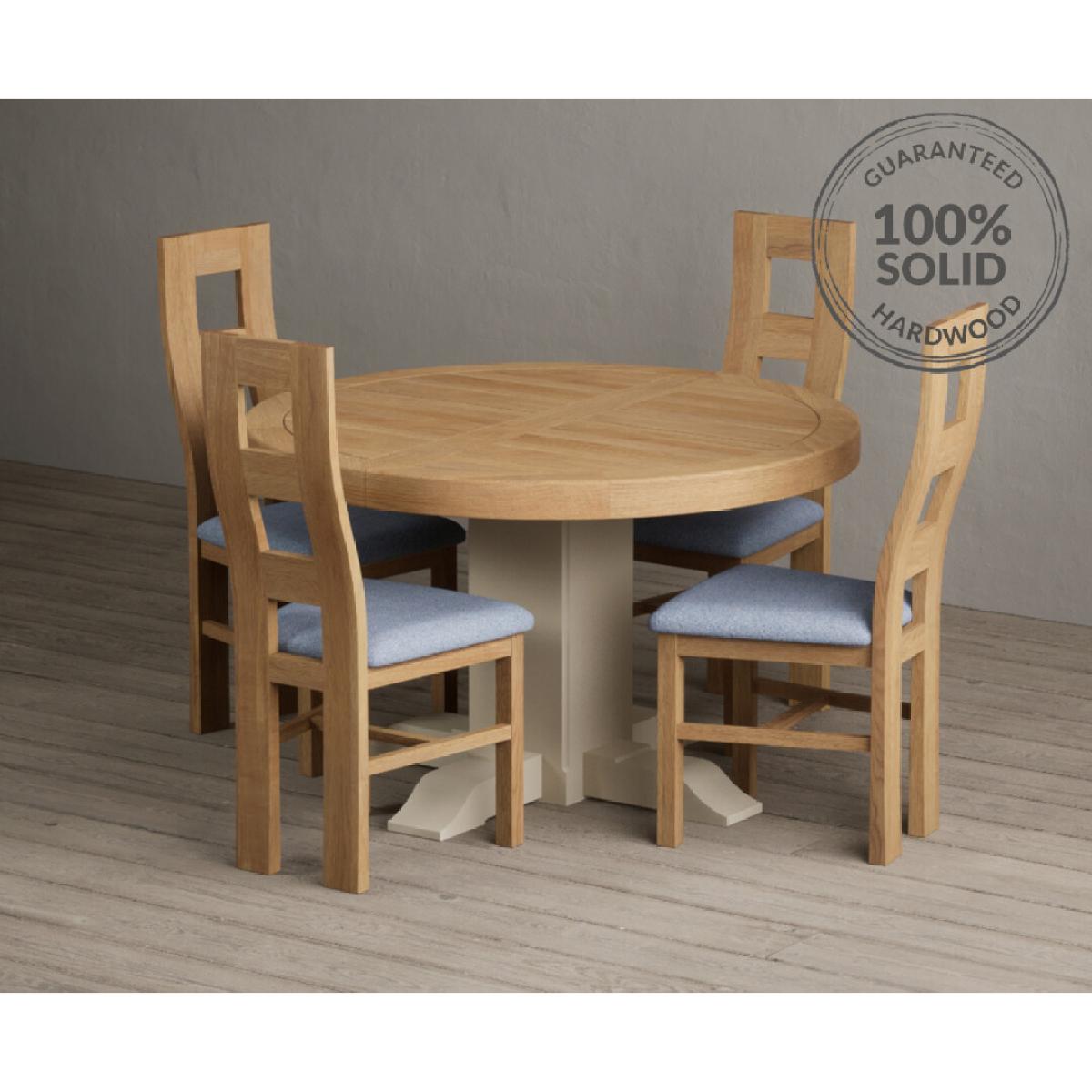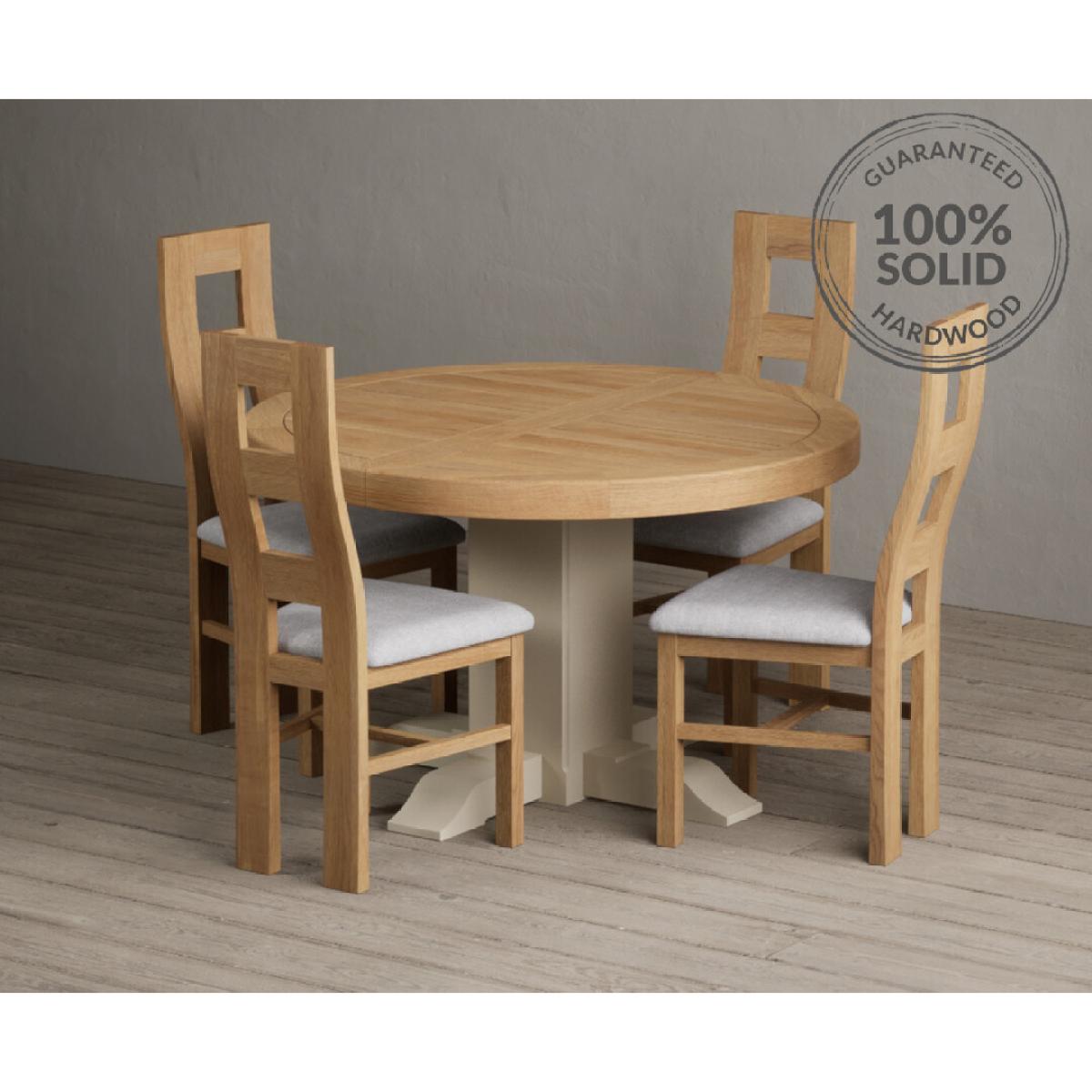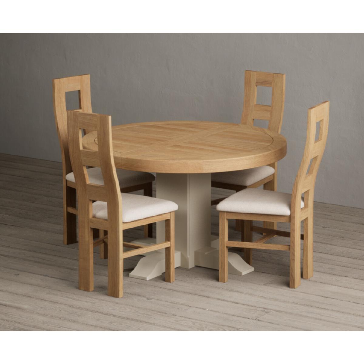 Extending Helmsley Oak and Cream Painted Pedestal Dining Table with 4 Linen Natural Chairs