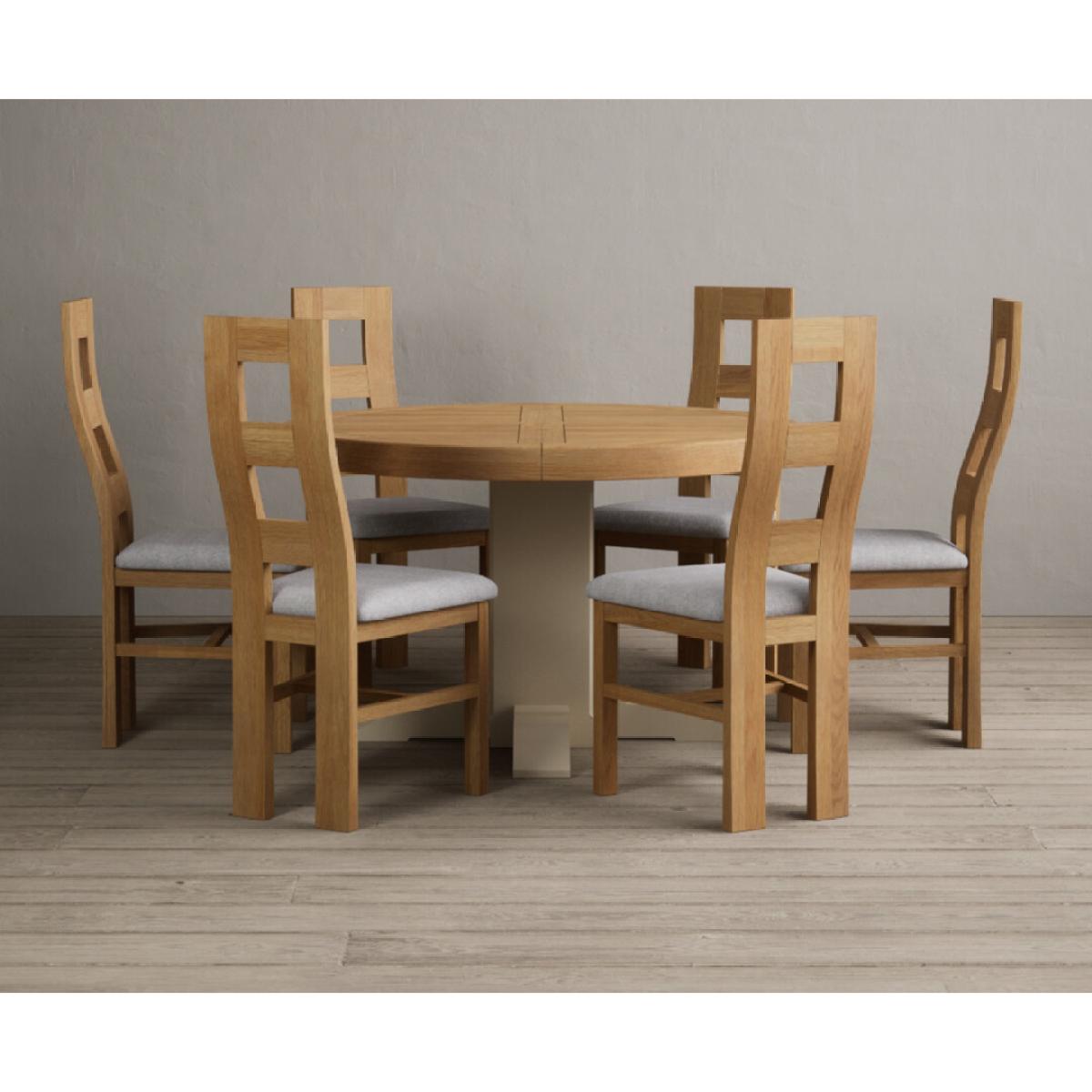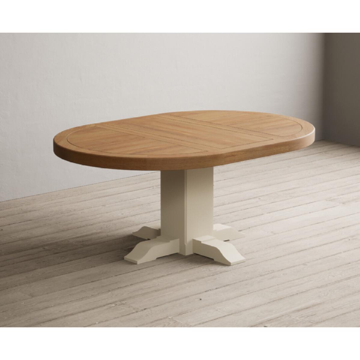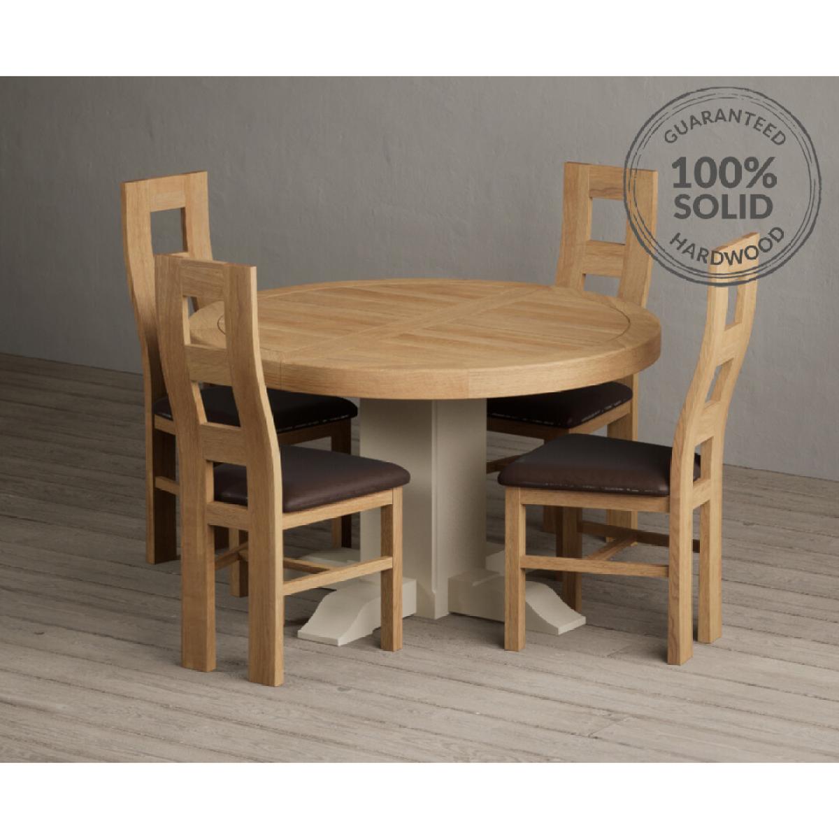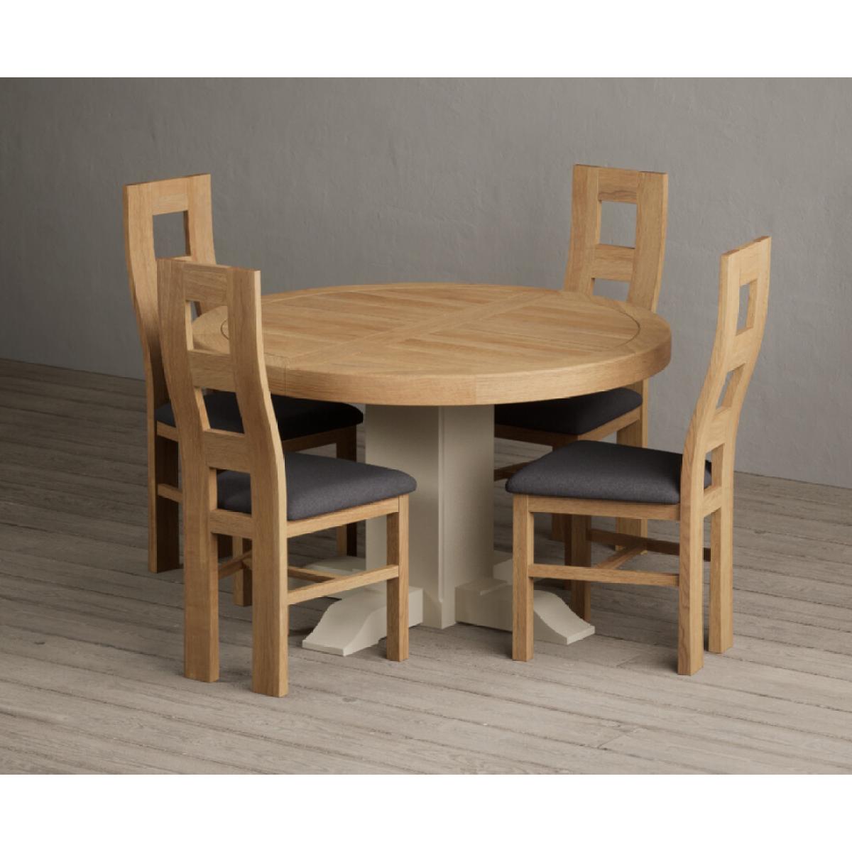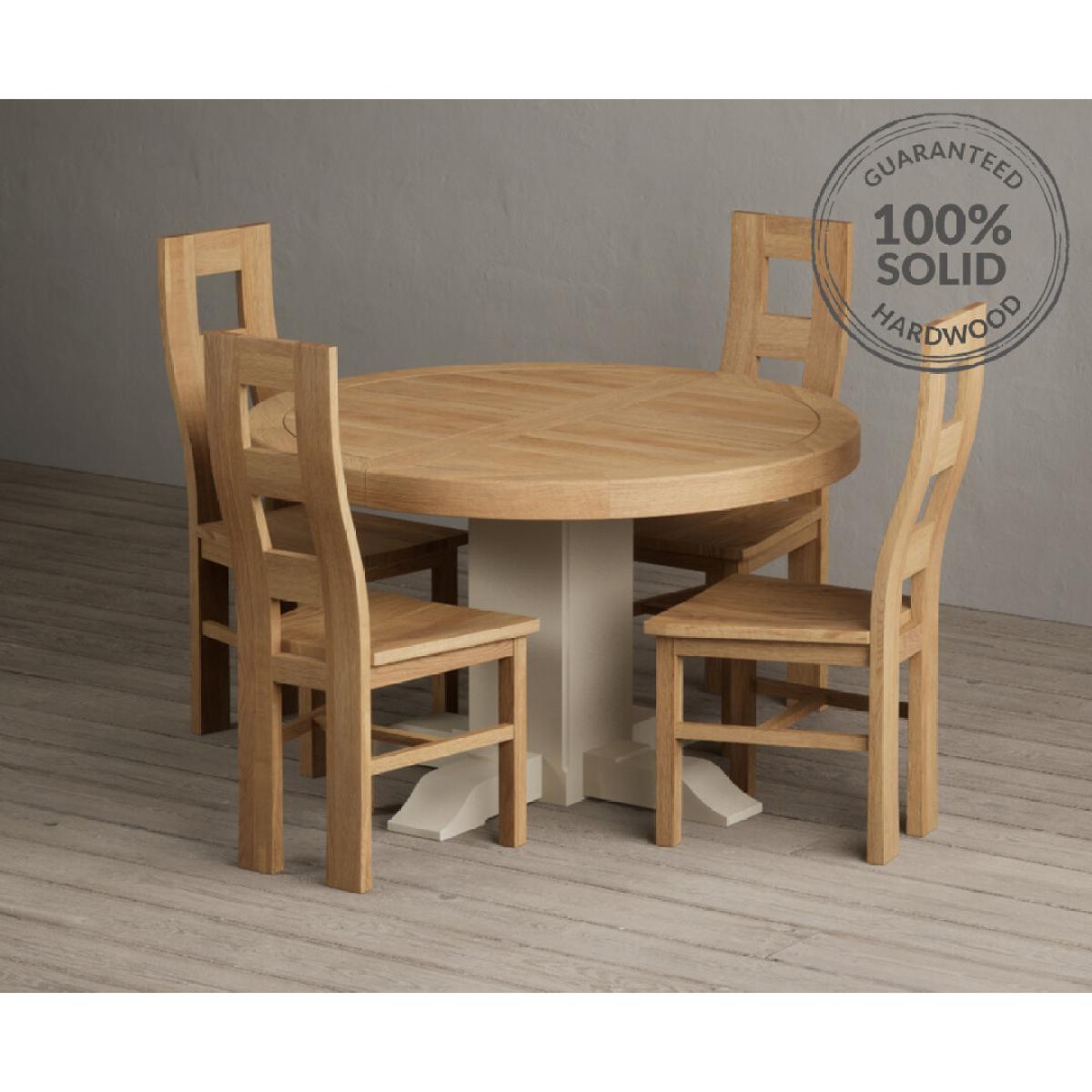 Extending Helmsley Oak and Cream Painted Pedestal Dining Table with 4 Linen Natural Chairs