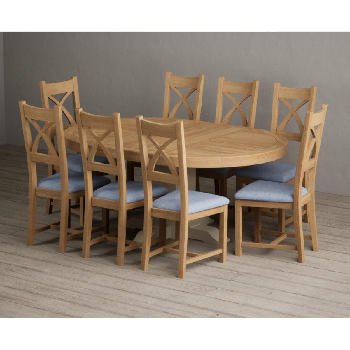 Extending Helmsley Oak and Cream Painted Pedestal Dining Table with 8 Blue Natural Solid Oak Chairs