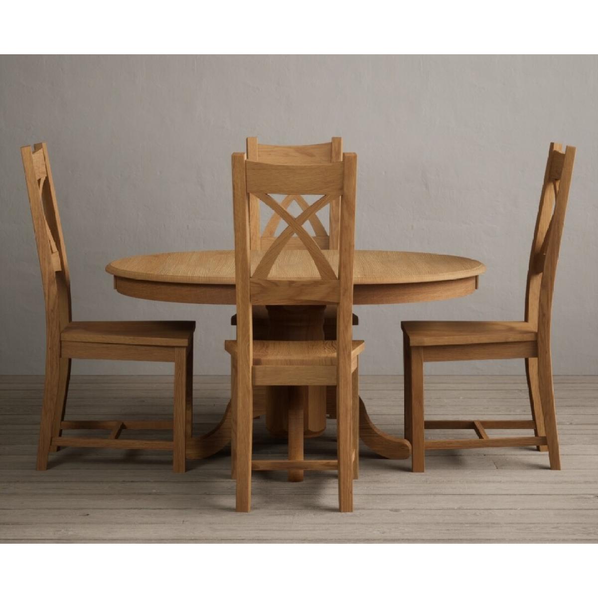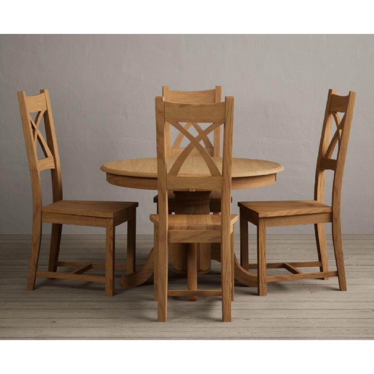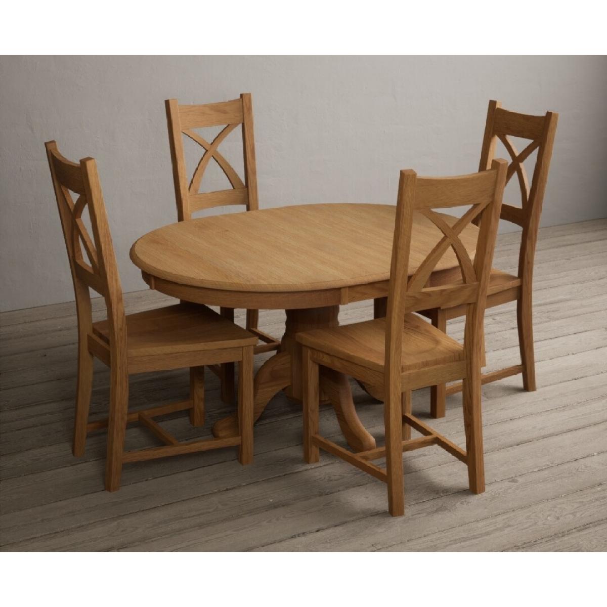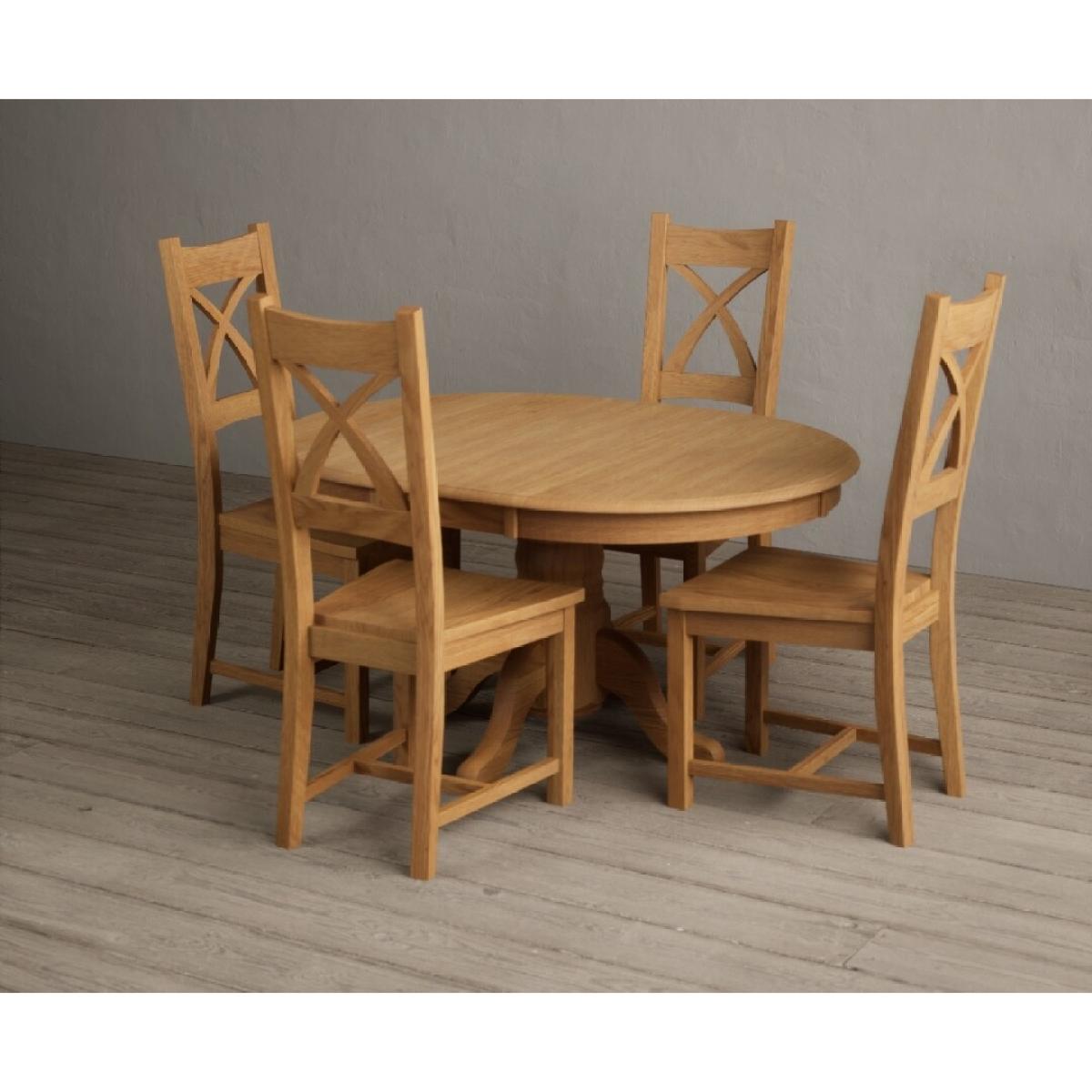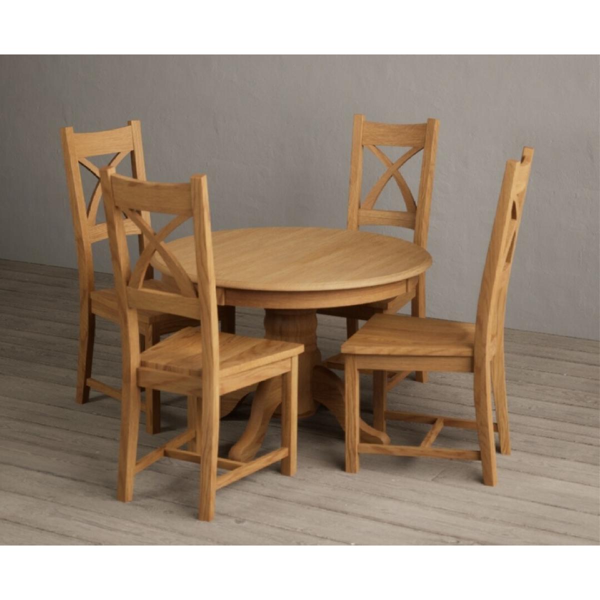 The Extending Hertford 100cm - 130cm Solid Oak Pedestal Dining Table with X Back Chairs is a stylish dining set with an extending solid oak dining table and matching solid oak chairs.