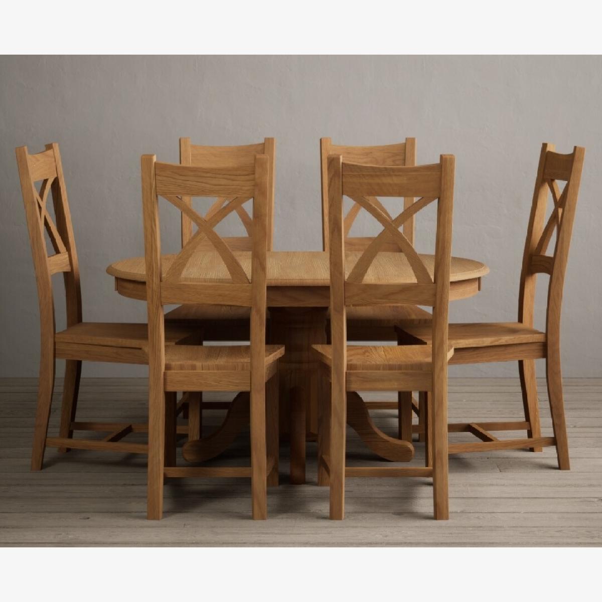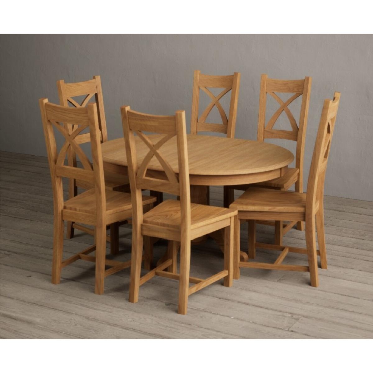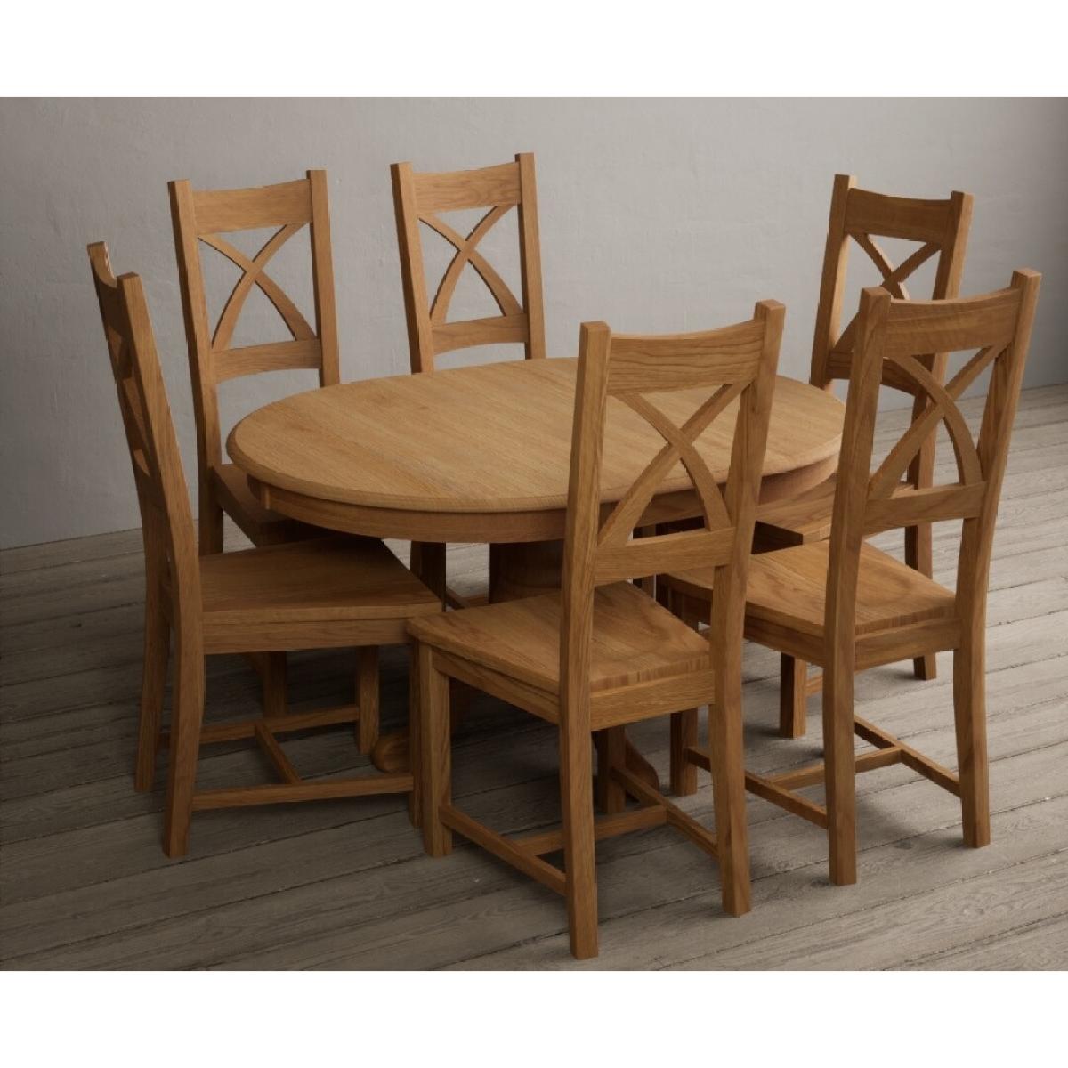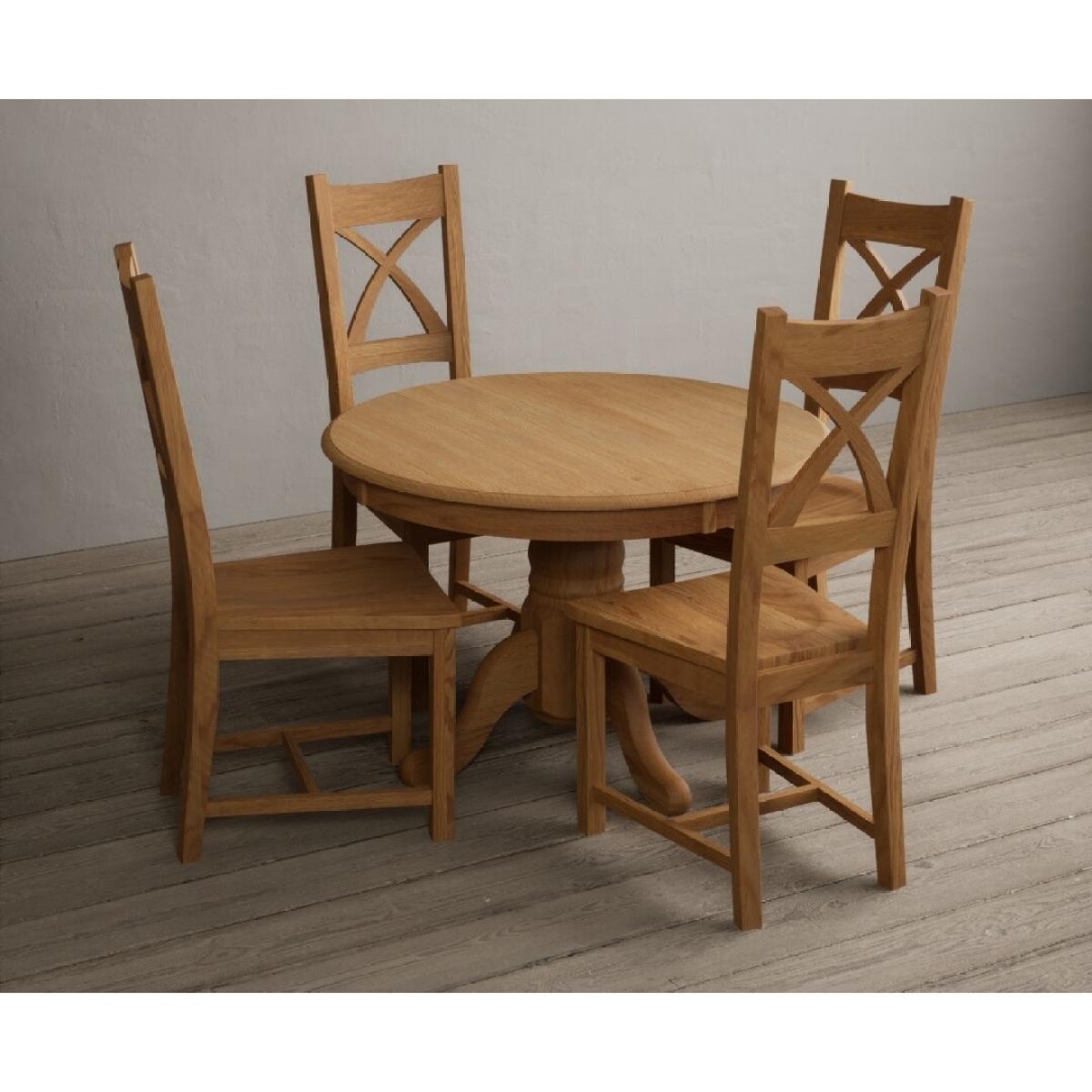The Extending Hertford 100cm - 130cm Solid Oak Pedestal Dining Table with X Back Chairs is a stylish dining set with an extending solid oak dining table and matching solid oak chairs.
