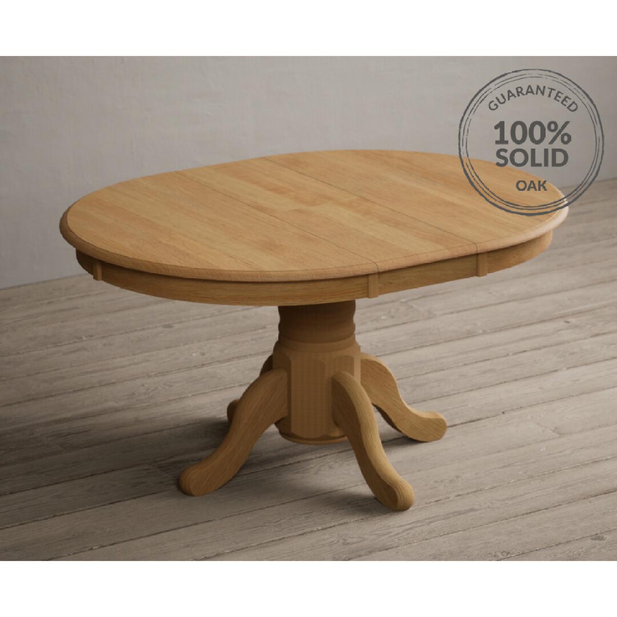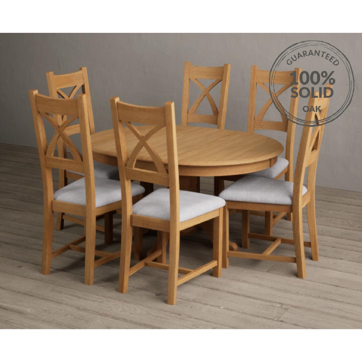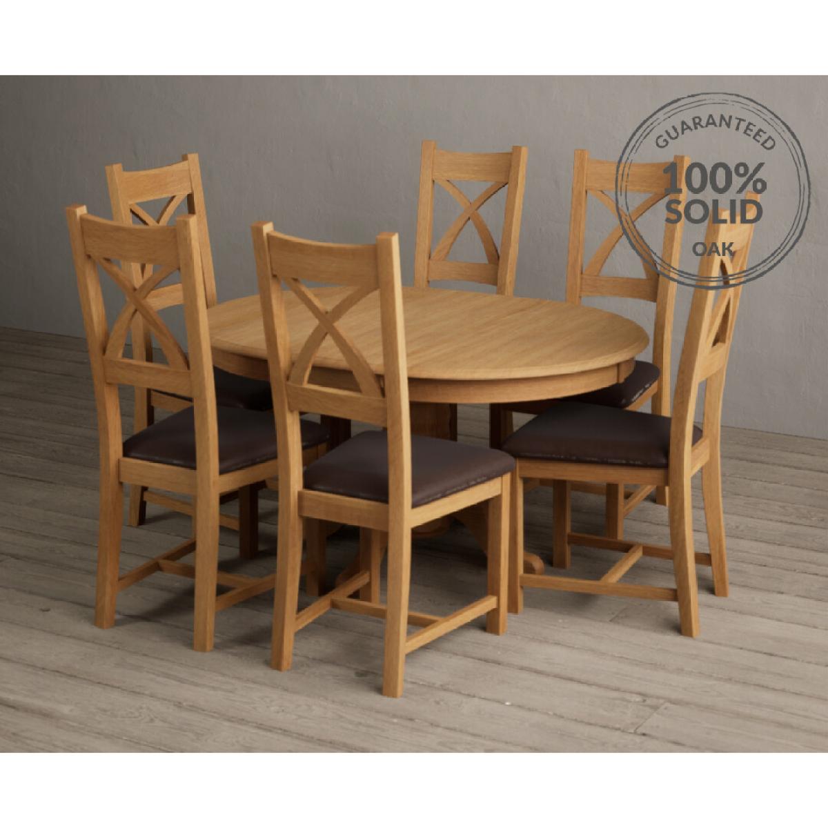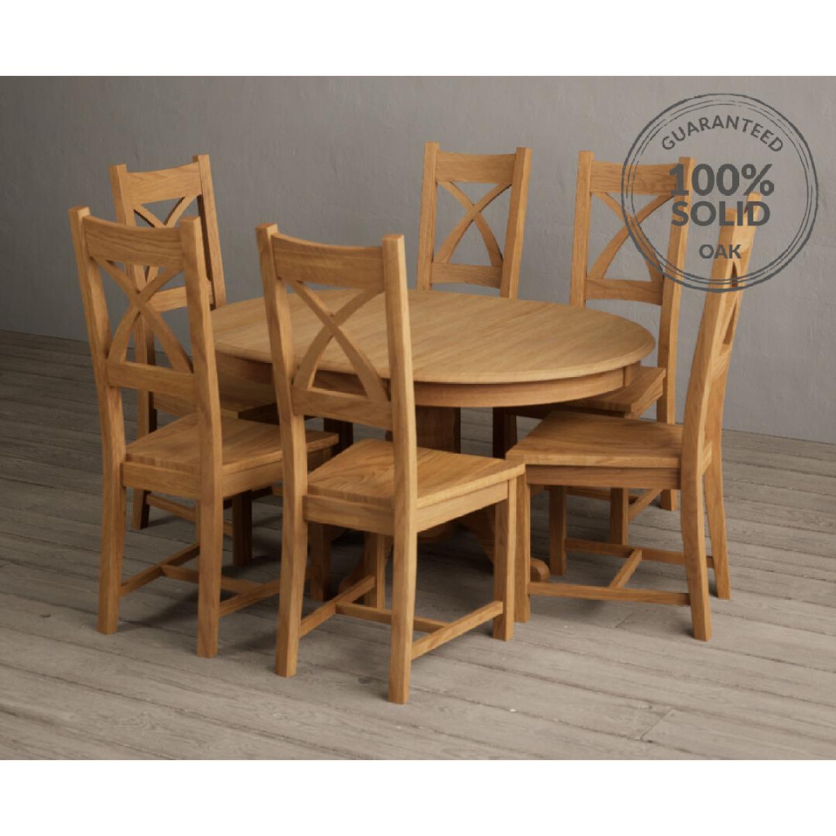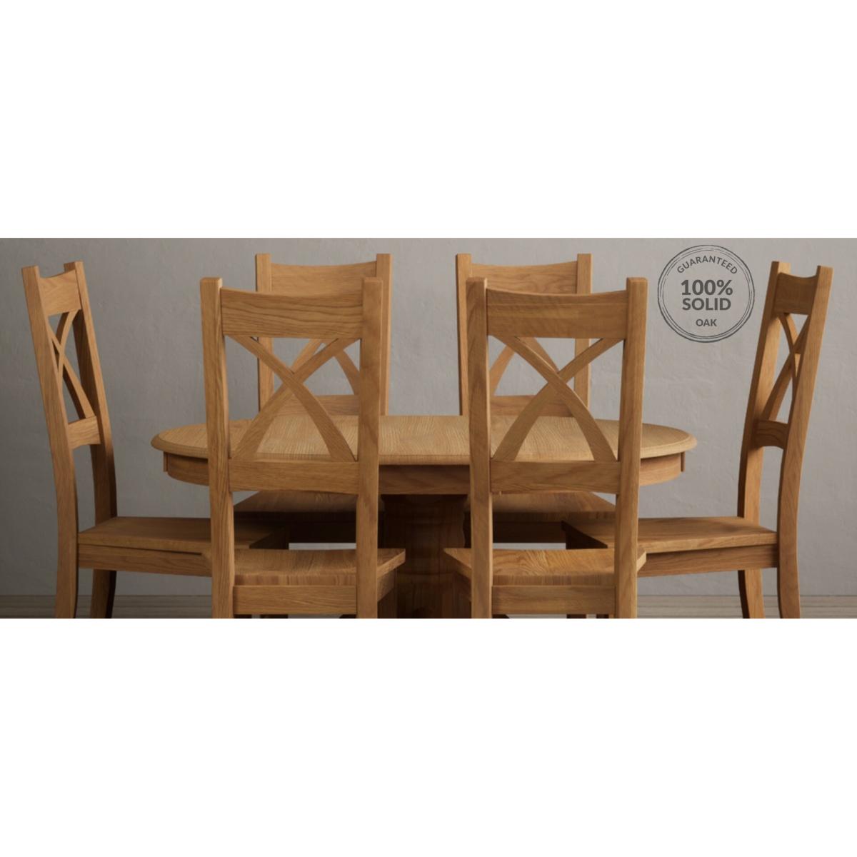 The Extending Hertford 100cm - 130cm Solid Oak Pedestal Dining Table with X Back Chairs is a stylish dining set with an extending solid oak dining table and matching solid oak chairs.
