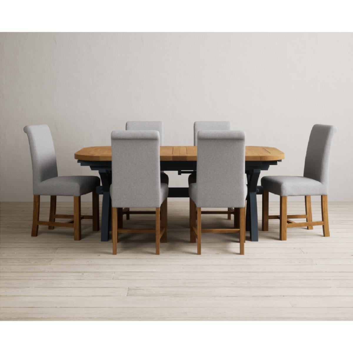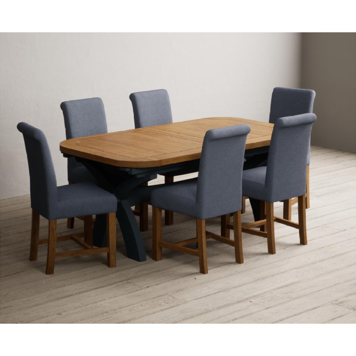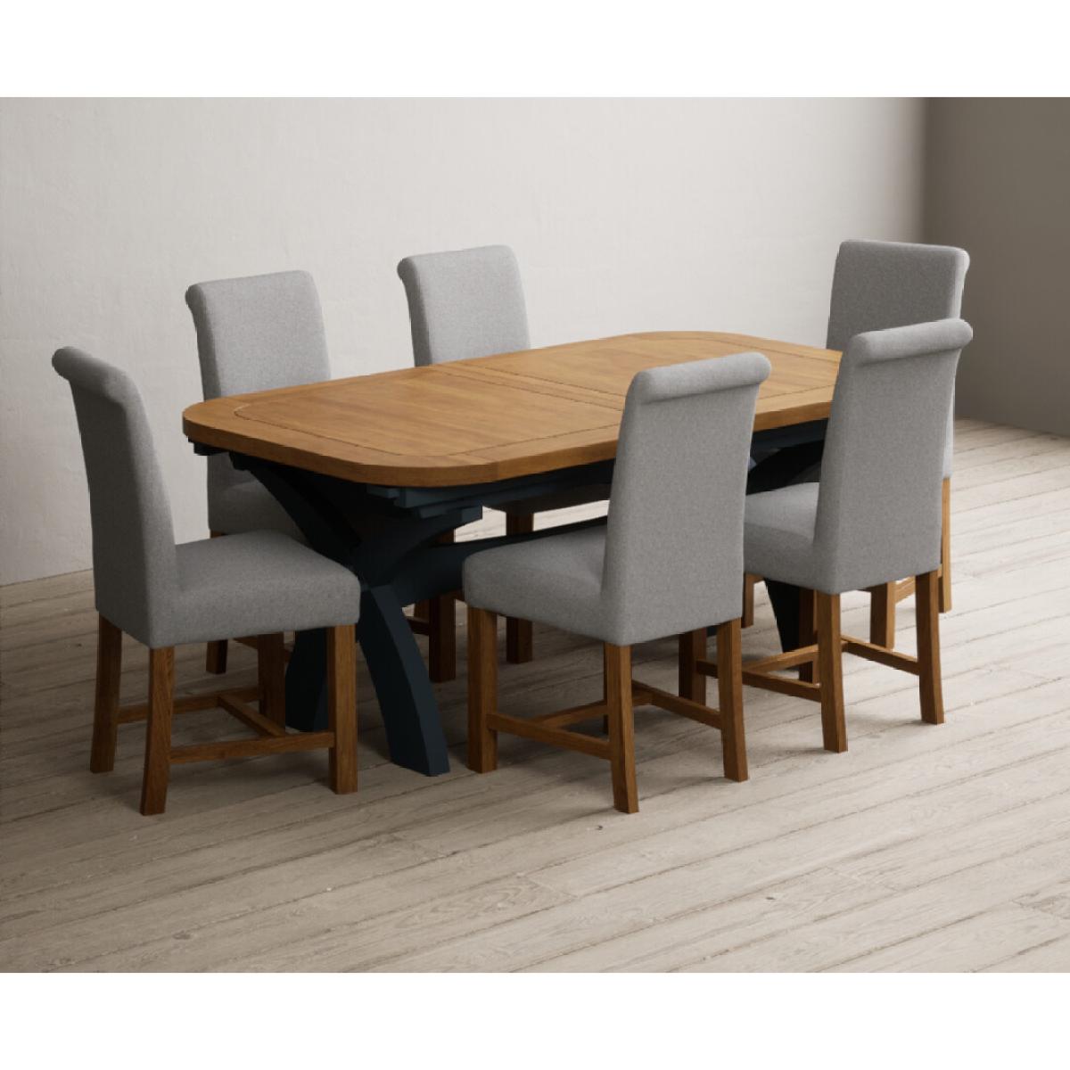 The Olympia 180cm Oak and Dark Blue Extending Dining Table with Scroll Back Braced Chairs is a stylish painted solid wood and solid oak extending dining set perfect for every occasion.