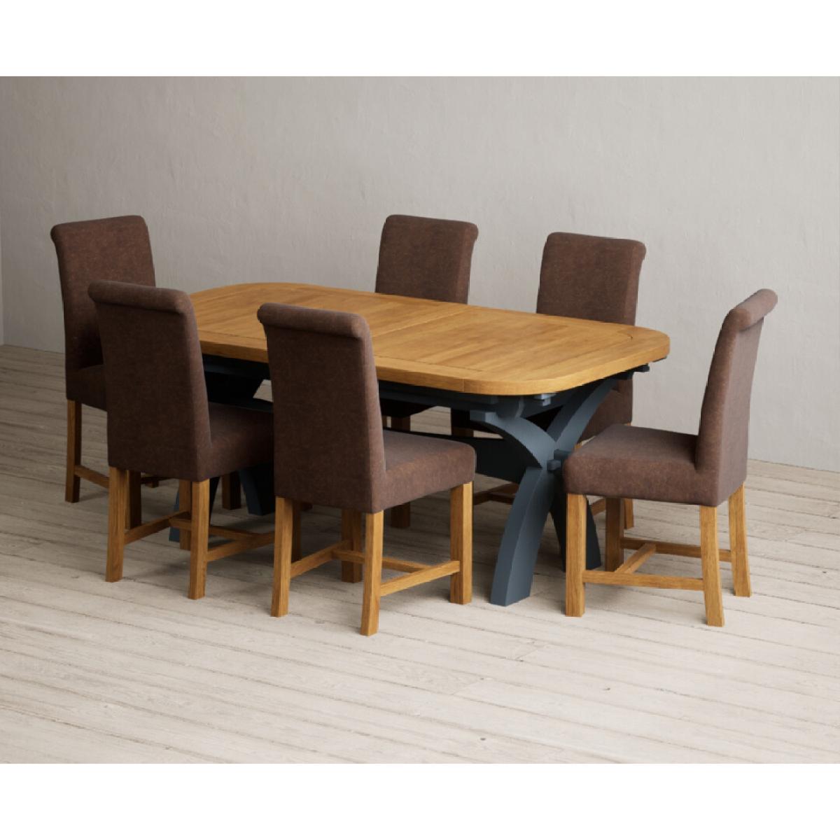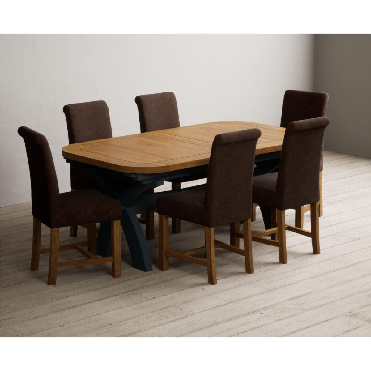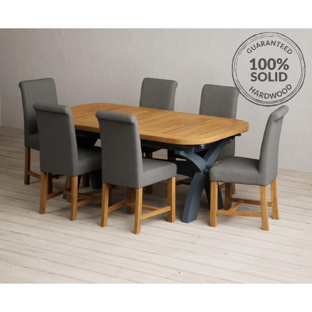 The Olympia 180cm Oak and Dark Blue Extending Dining Table with Scroll Back Braced Chairs is a stylish painted solid wood and solid oak extending dining set perfect for every occasion.