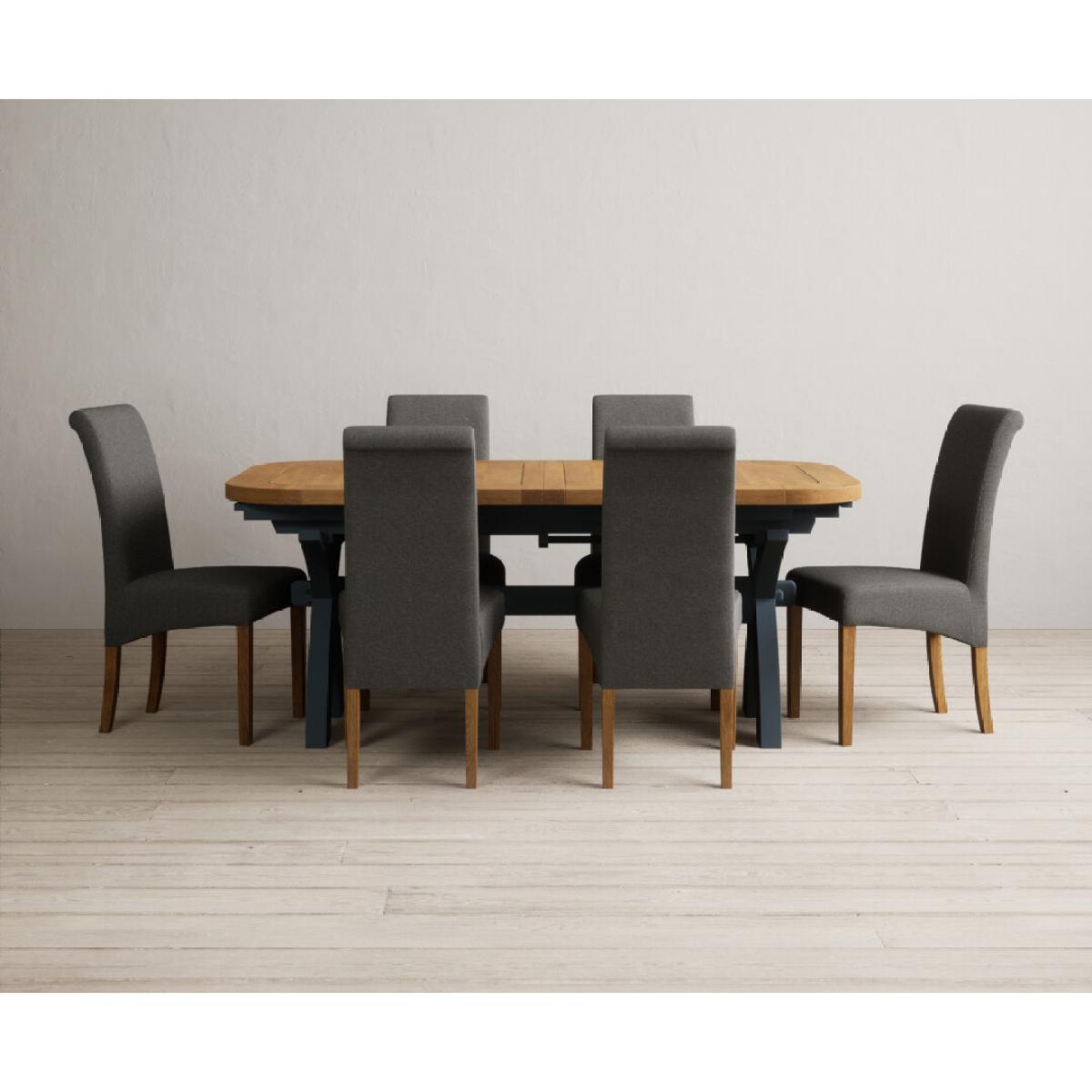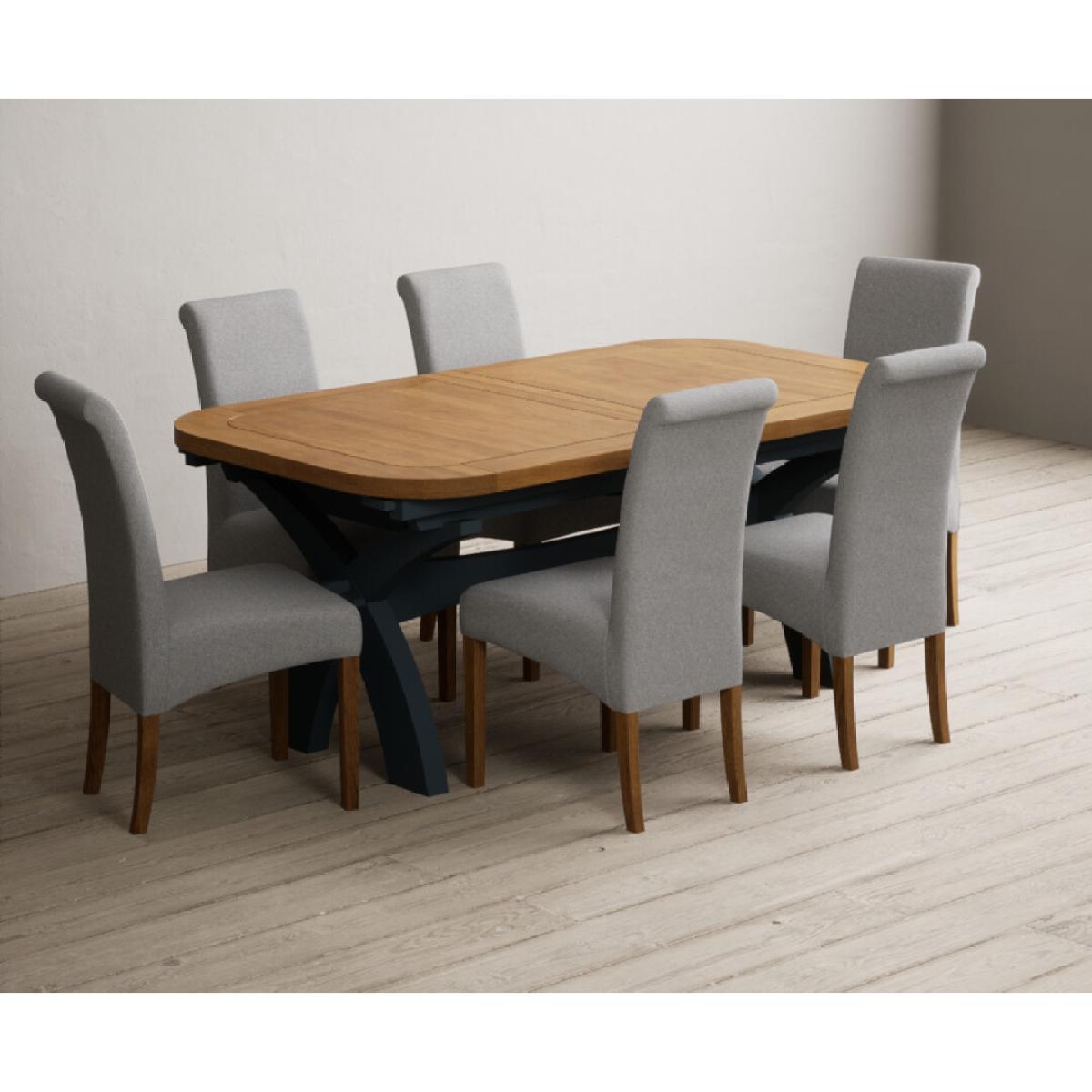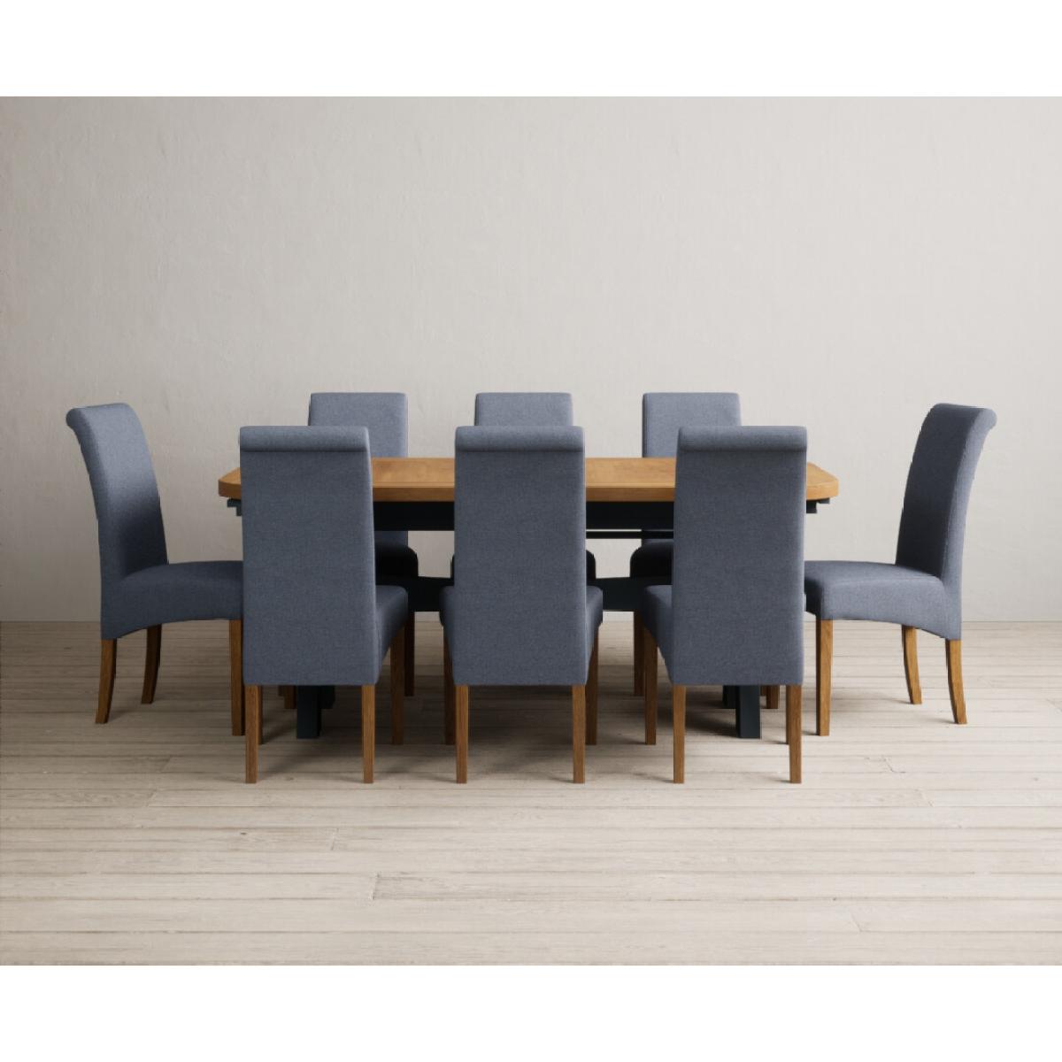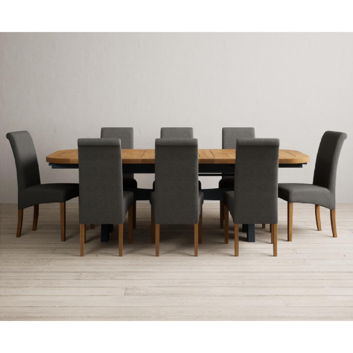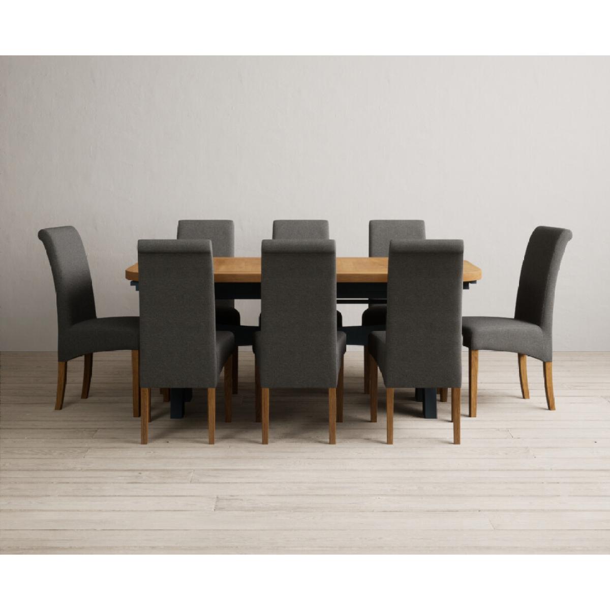 Extending Olympia 180cm Oak and Dark Blue Painted Dining Table with 6 Charcoal Grey Scroll Back Chairs