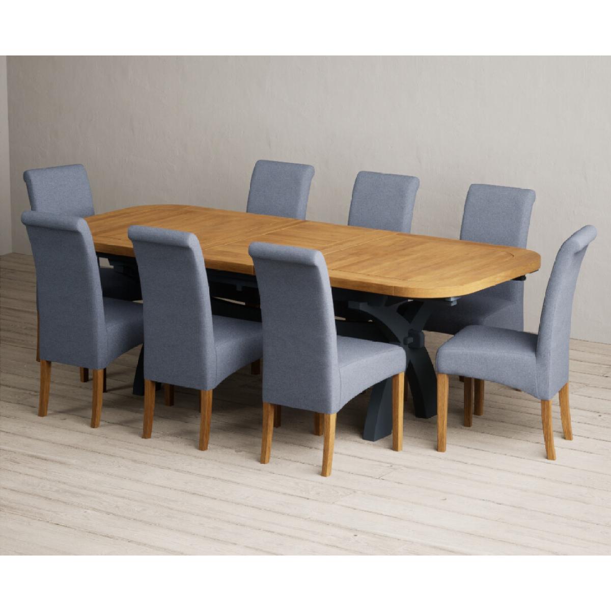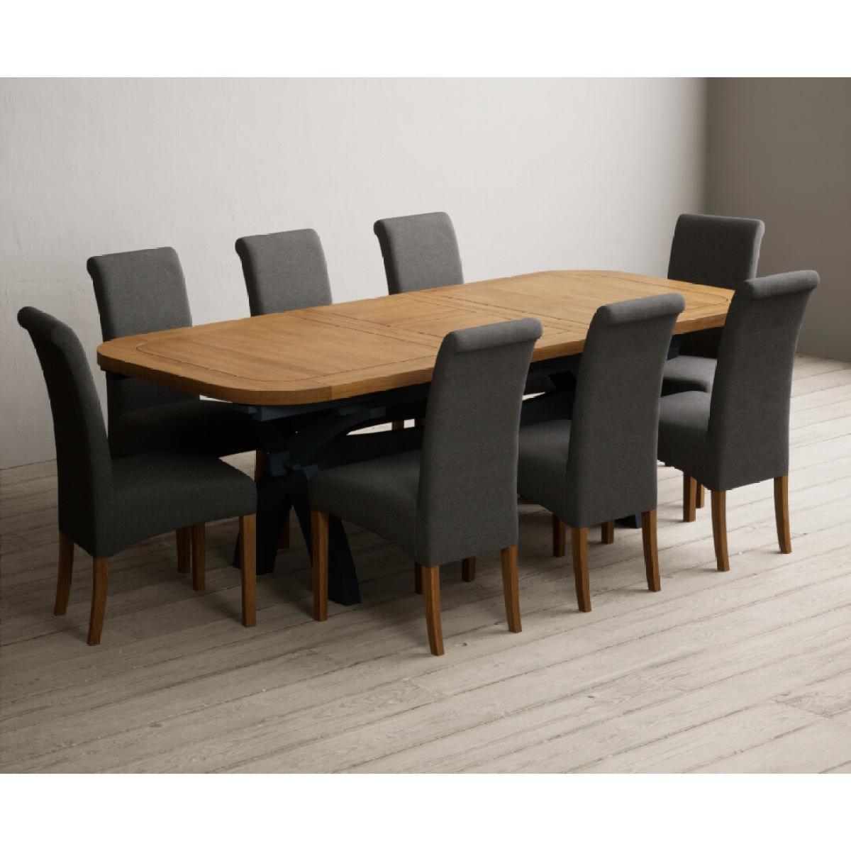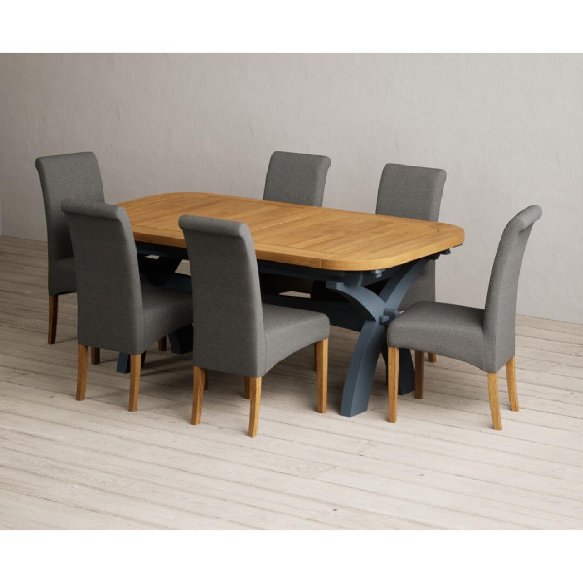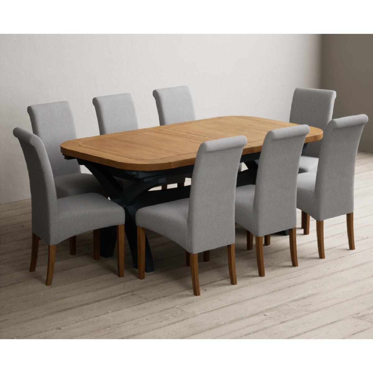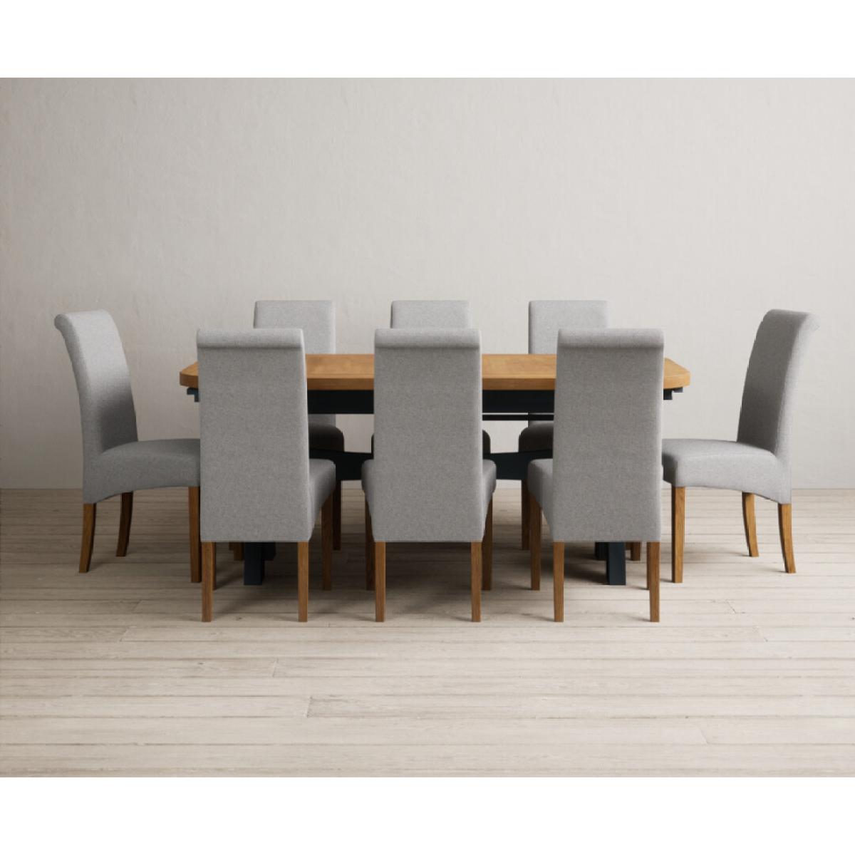 Extending Olympia 180cm Oak and Dark Blue Painted Dining Table with 6 Charcoal Grey Scroll Back Chairs