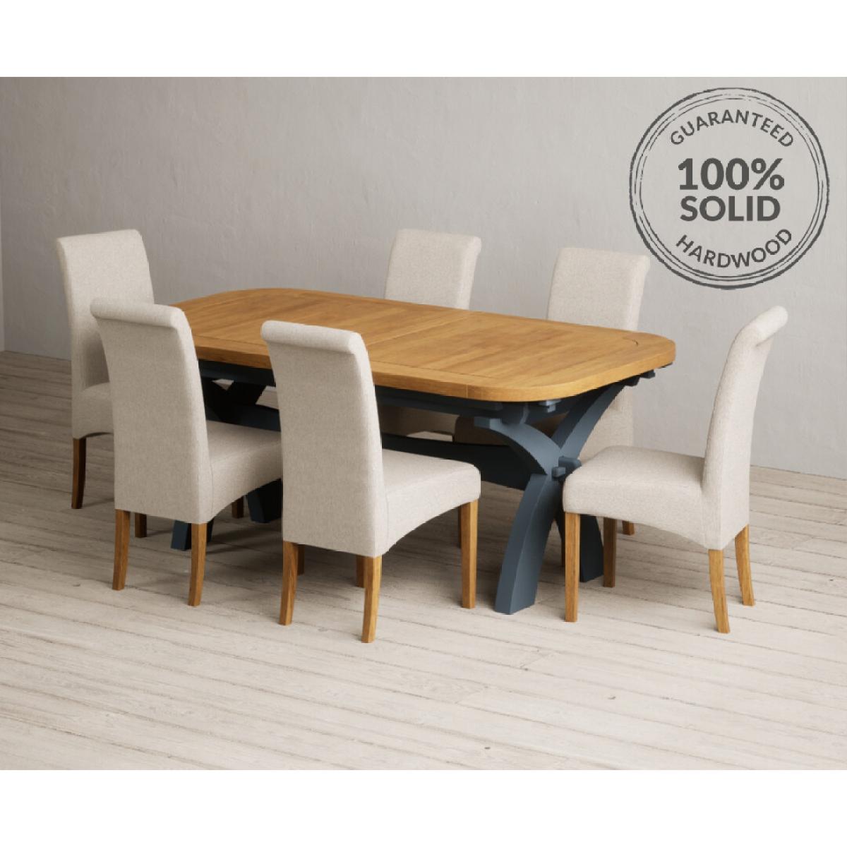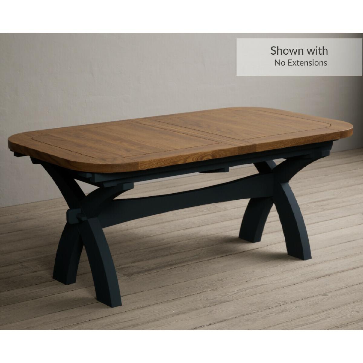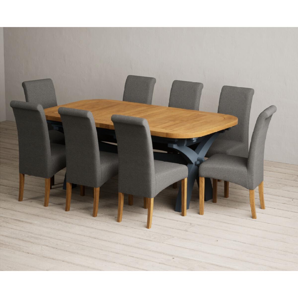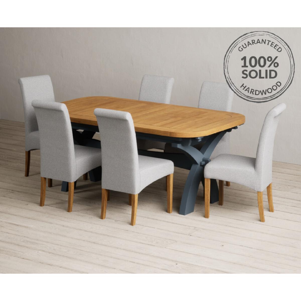 Extending Olympia 180cm Oak and Dark Blue Painted Dining Table with 6 Charcoal Grey Scroll Back Chairs