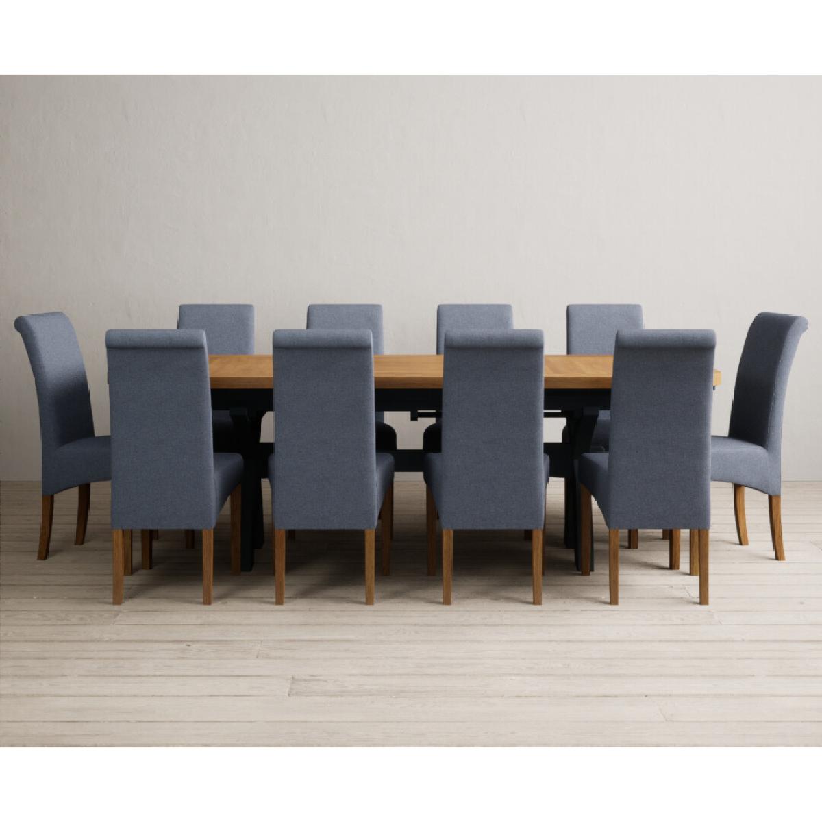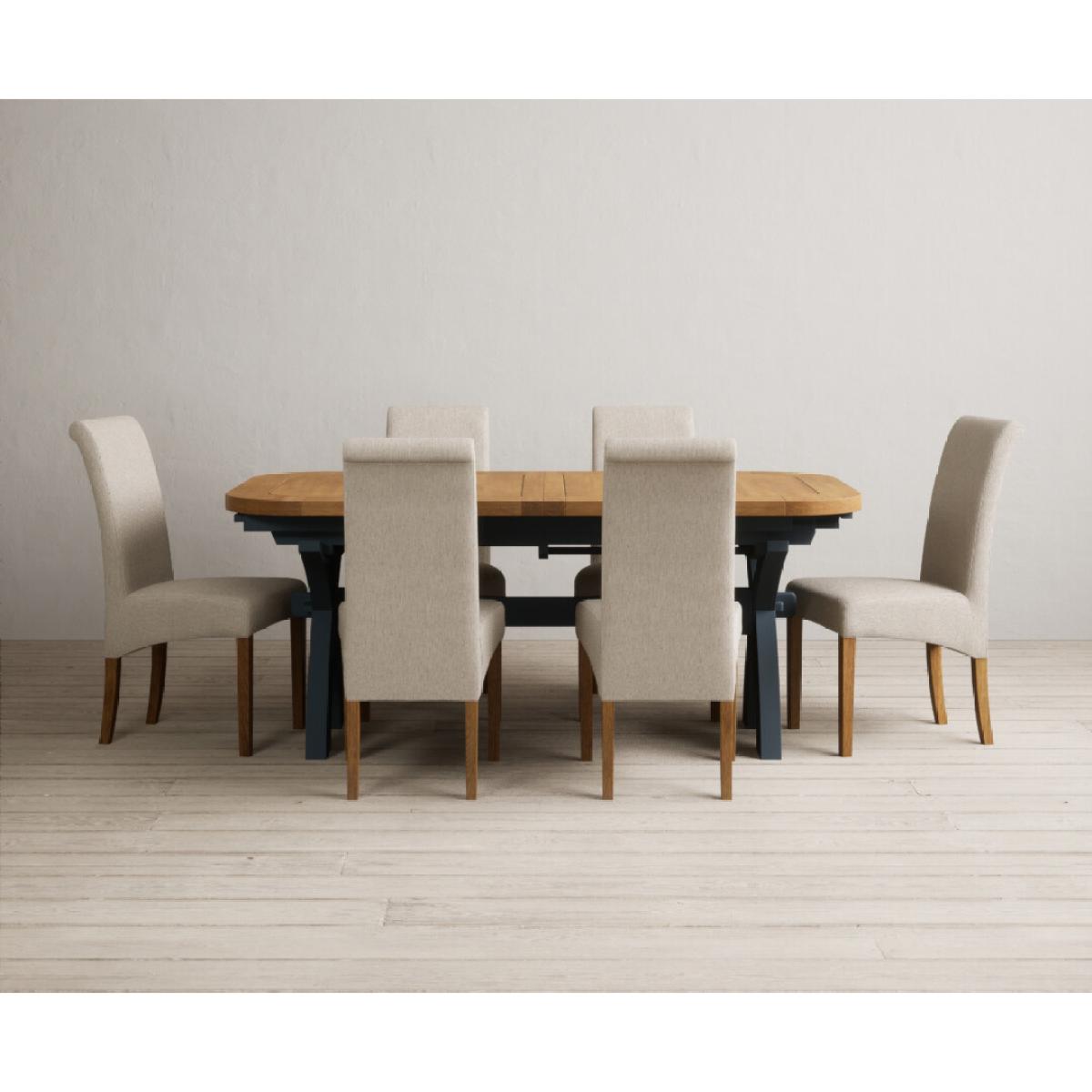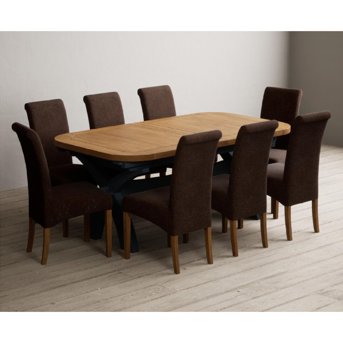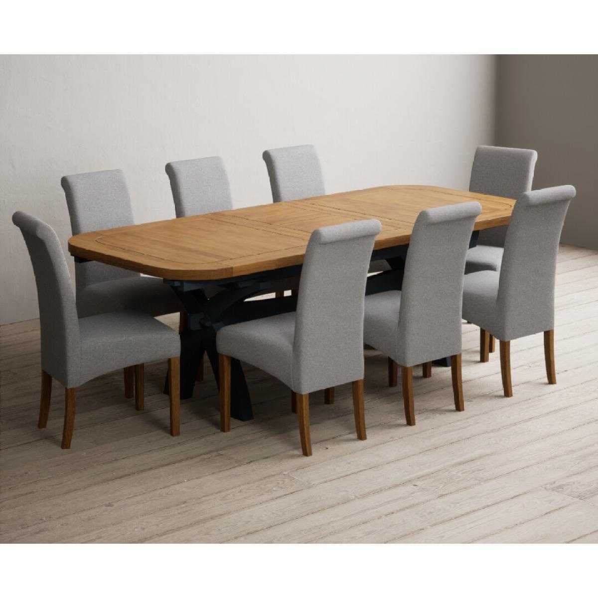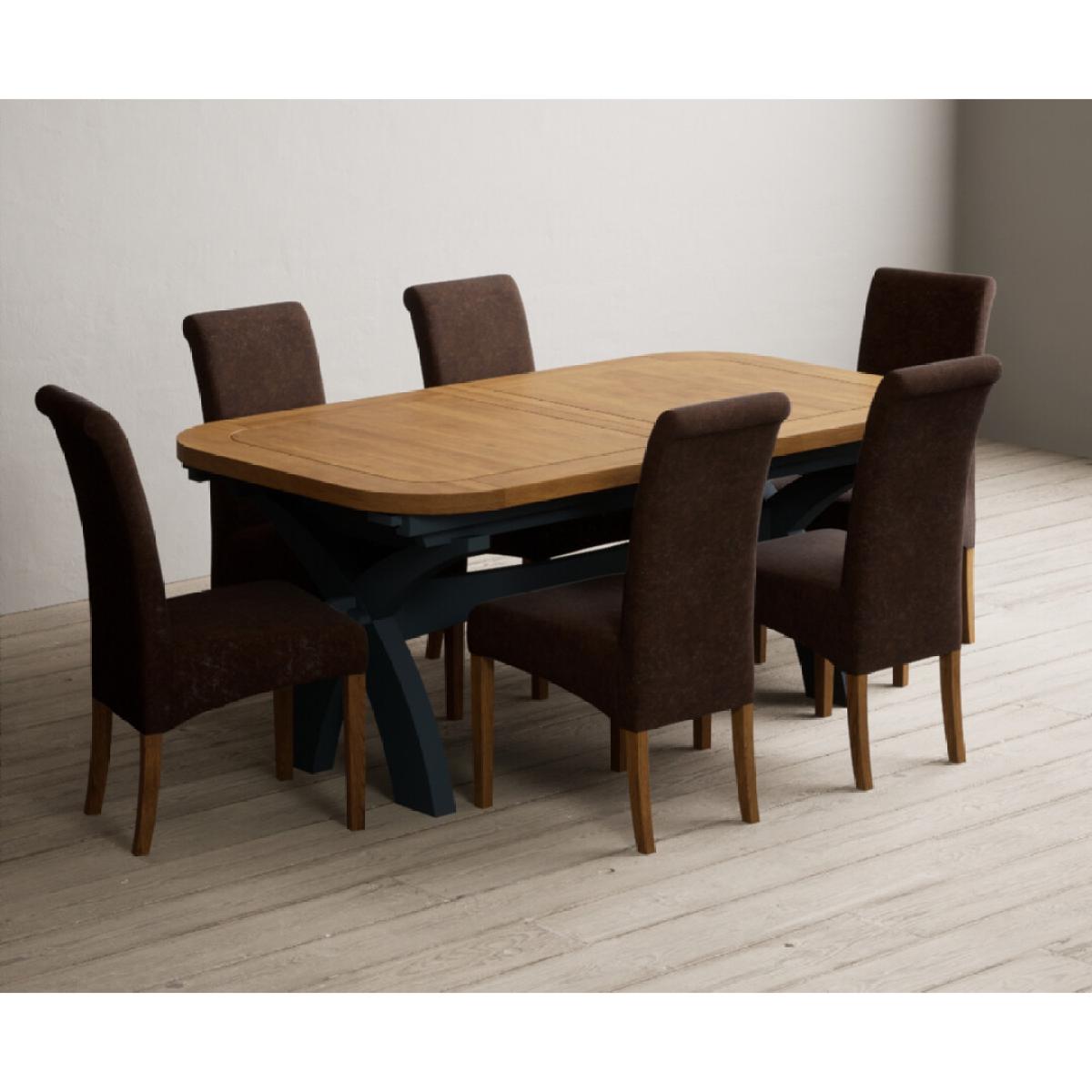 Extending Olympia 180cm Oak and Dark Blue Painted Dining Table with 6 Charcoal Grey Scroll Back Chairs