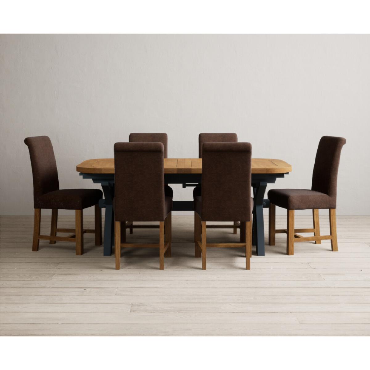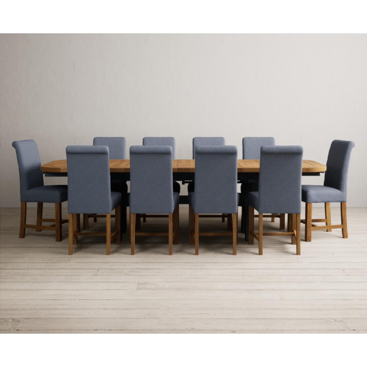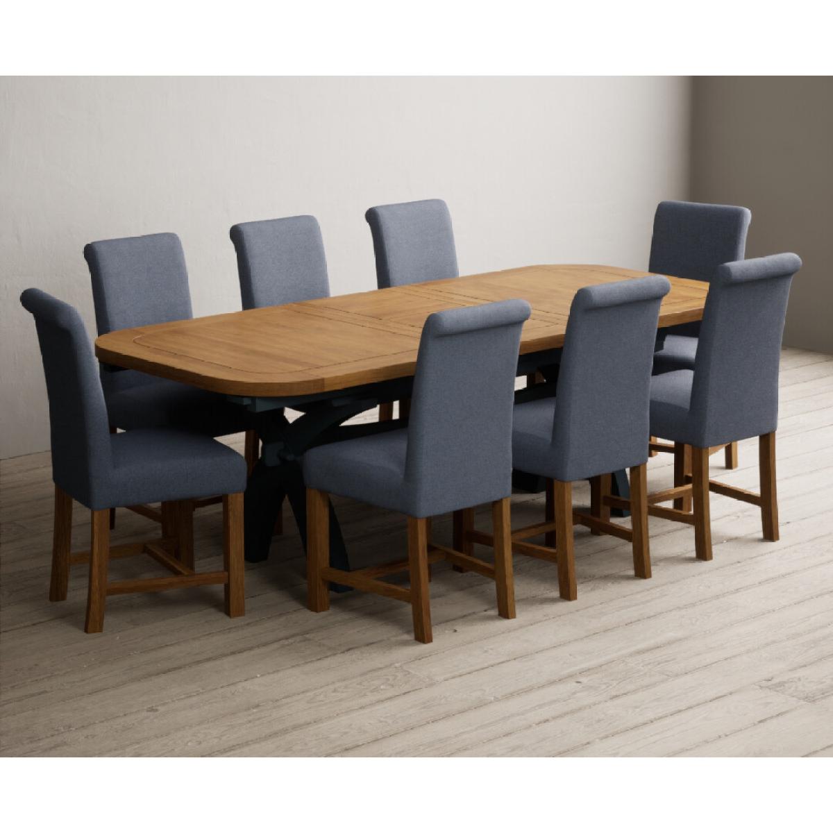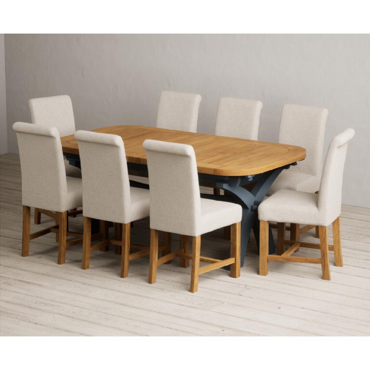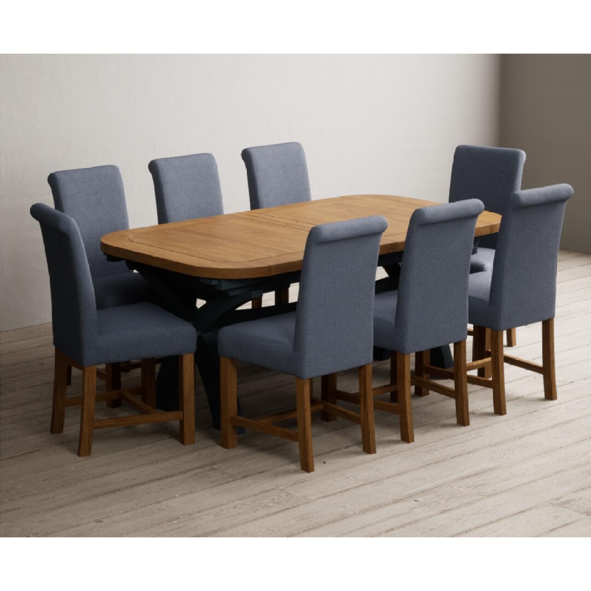 The Olympia 180cm Oak and Dark Blue Extending Dining Table with Scroll Back Braced Chairs is a stylish painted solid wood and solid oak extending dining set perfect for every occasion.