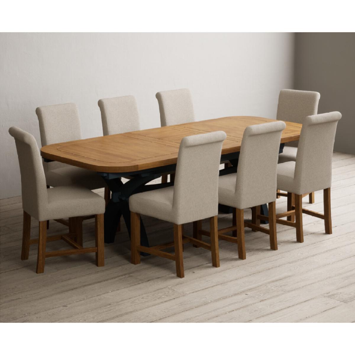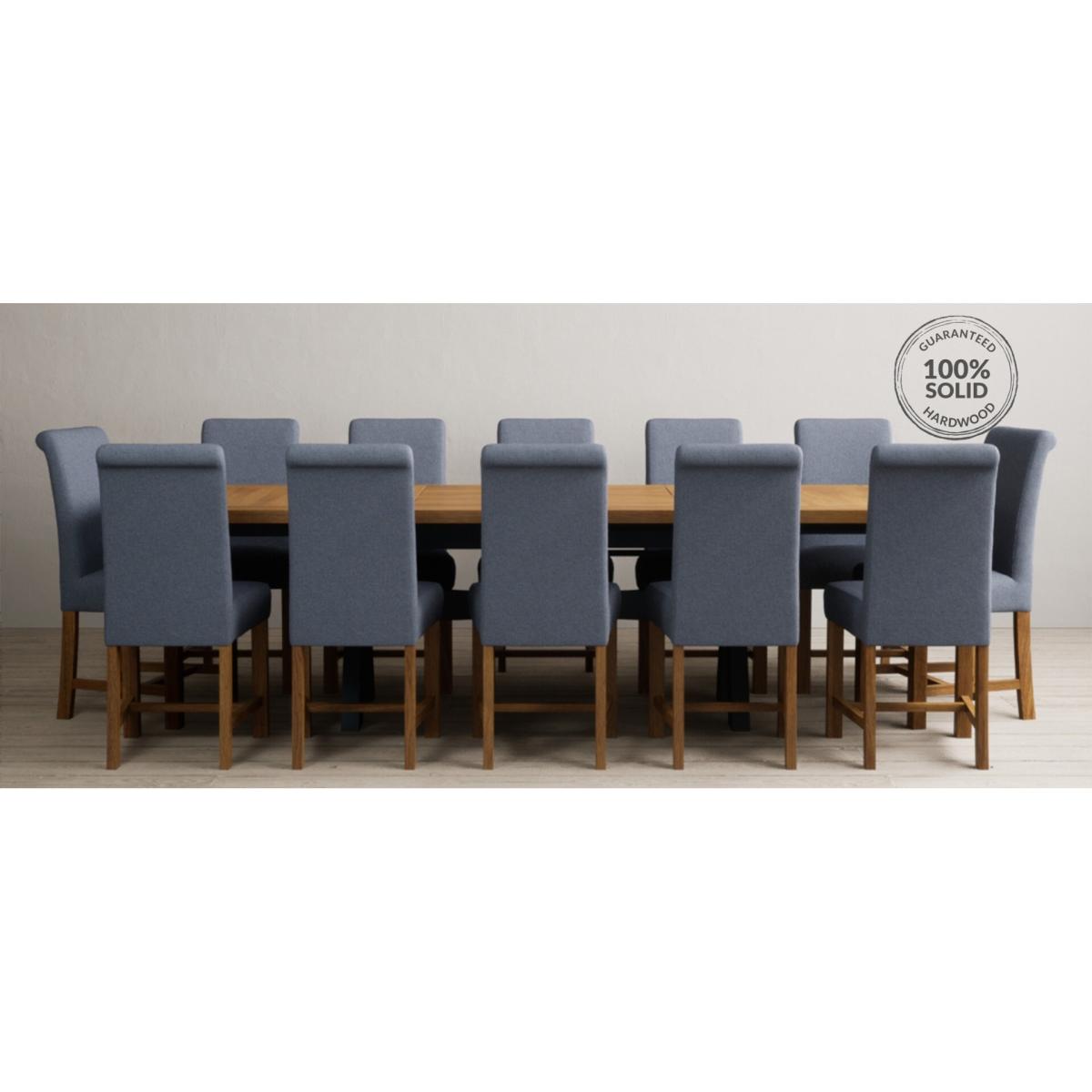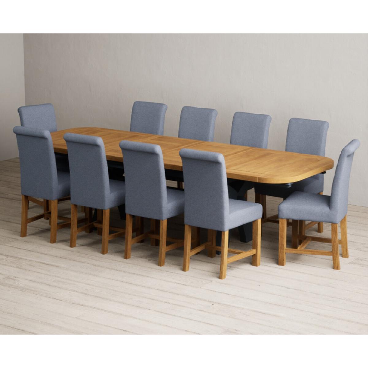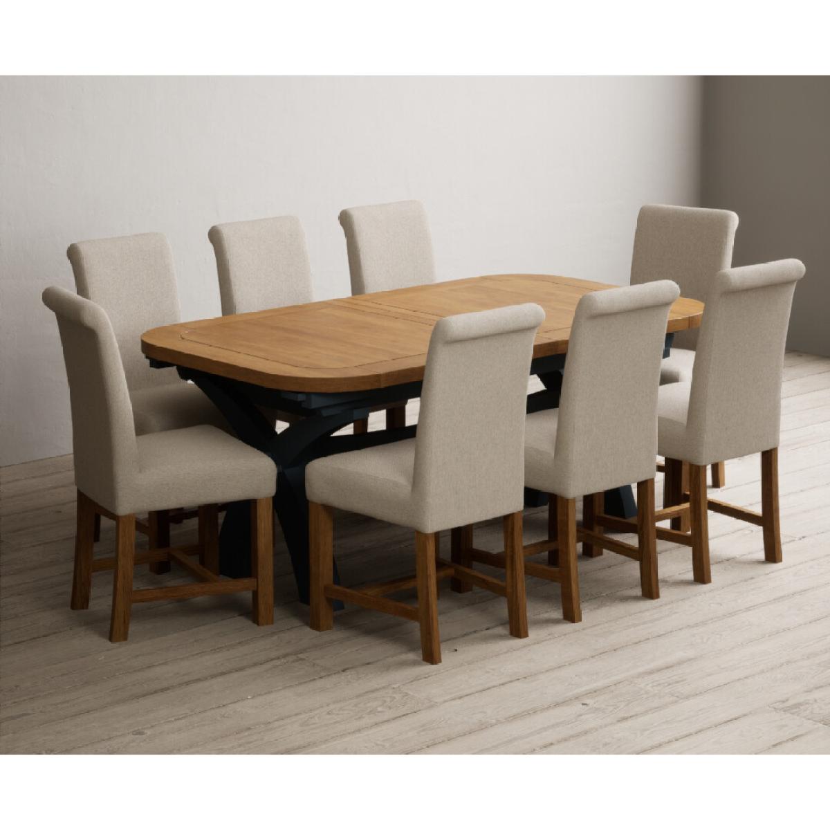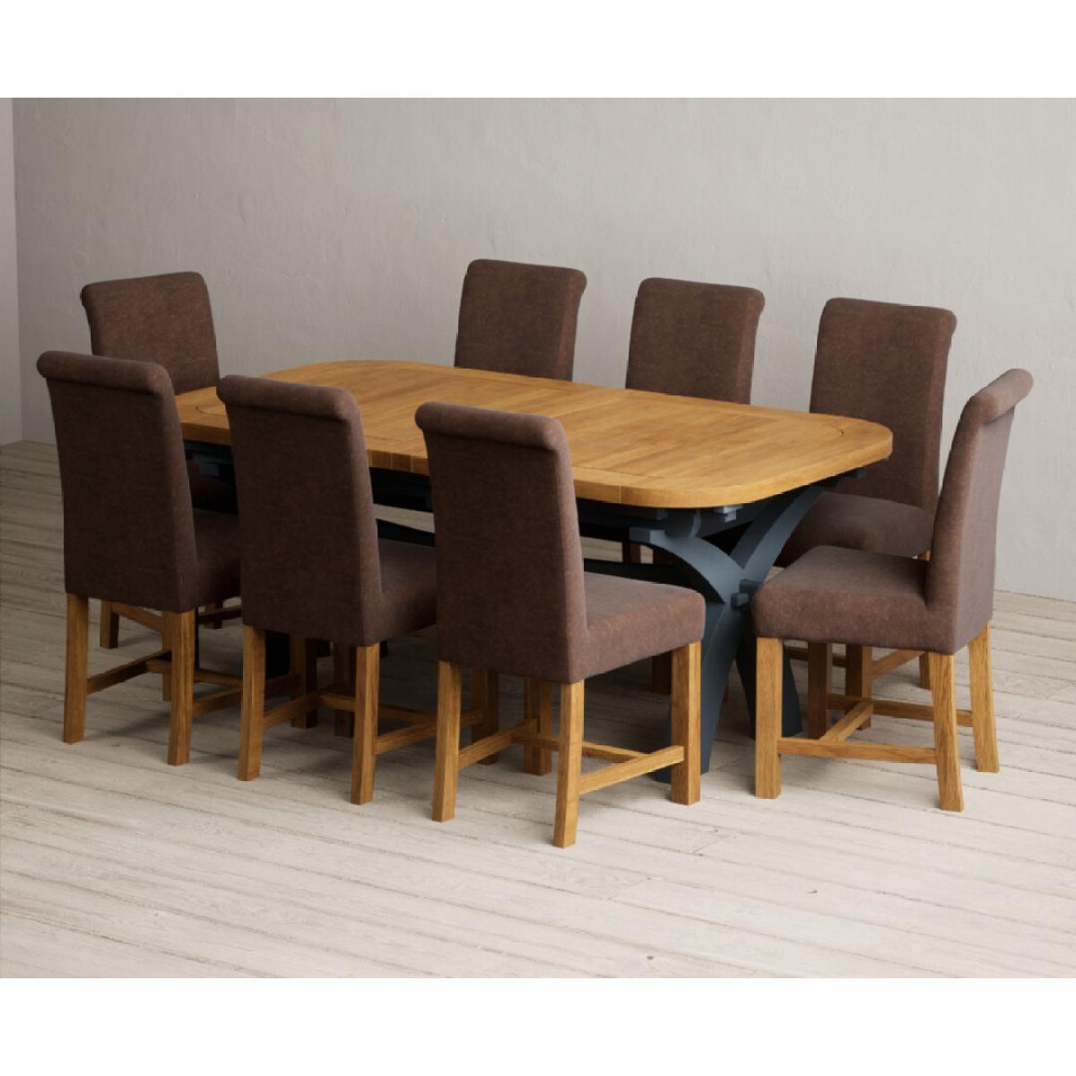 The Olympia 180cm Oak and Dark Blue Extending Dining Table with Scroll Back Braced Chairs is a stylish painted solid wood and solid oak extending dining set perfect for every occasion.