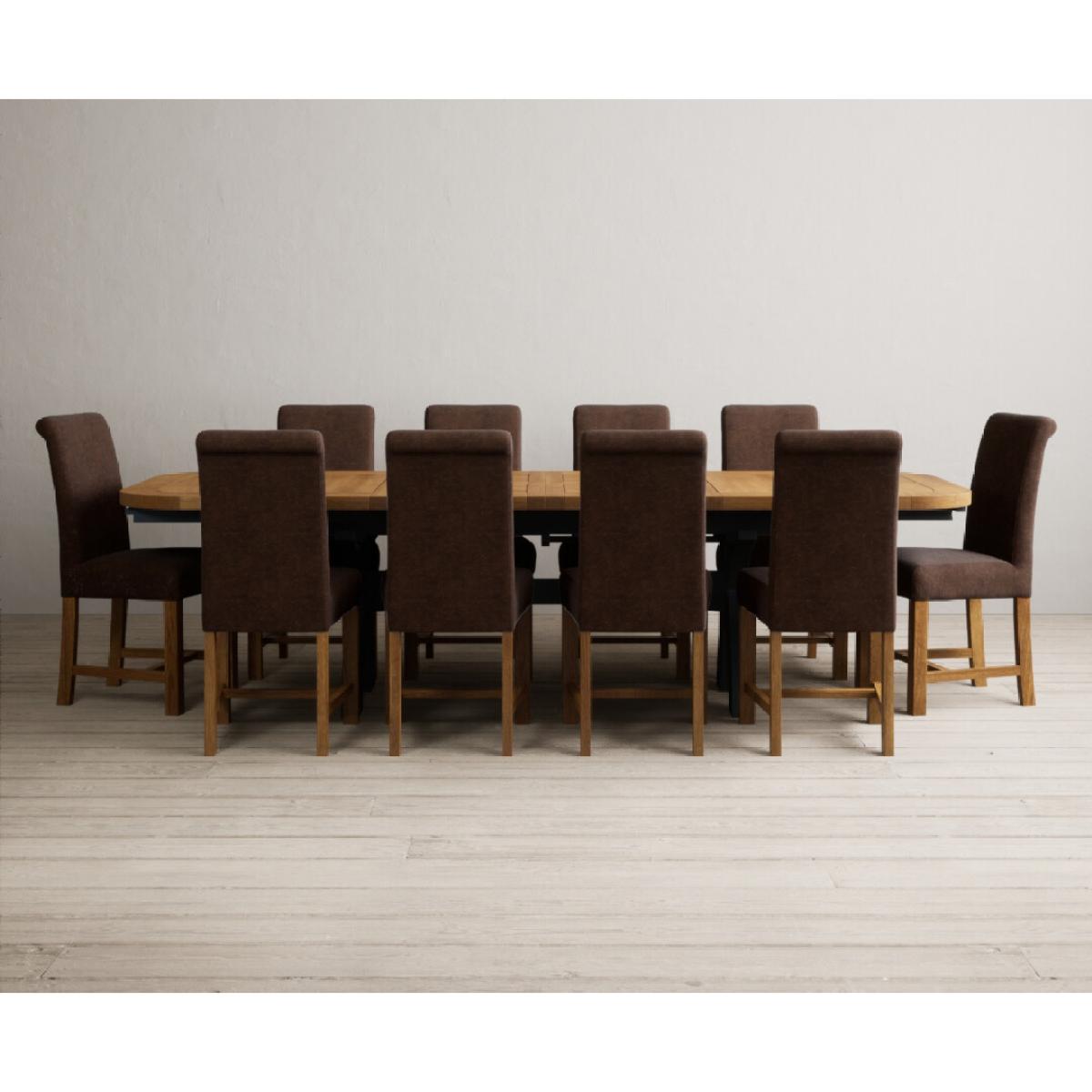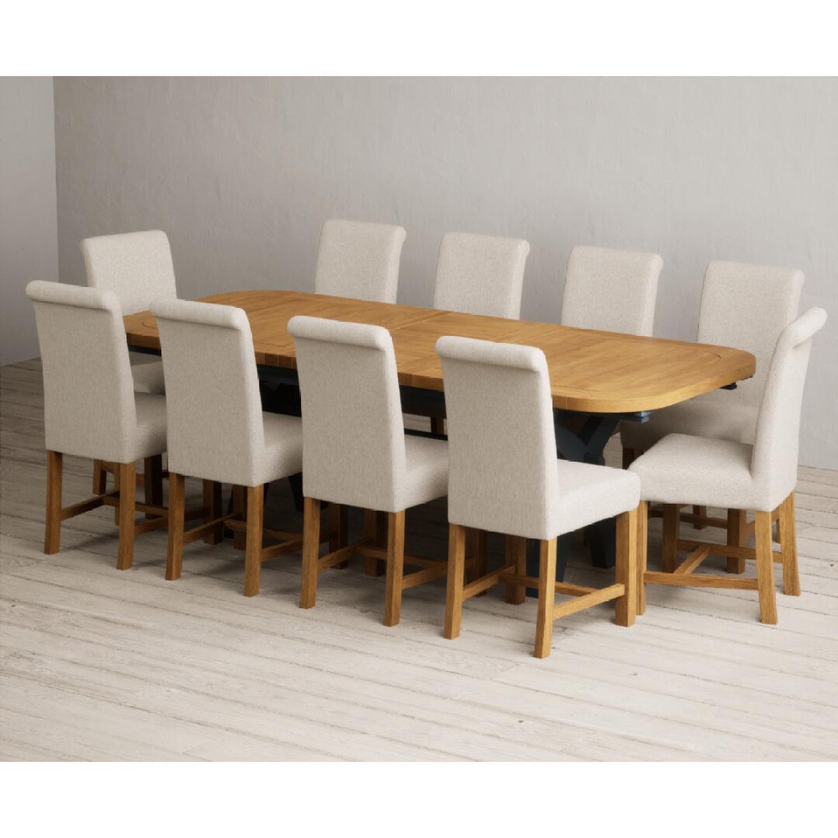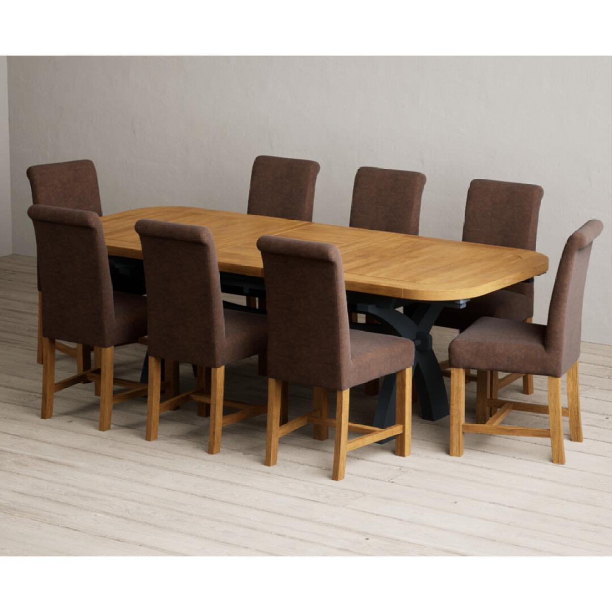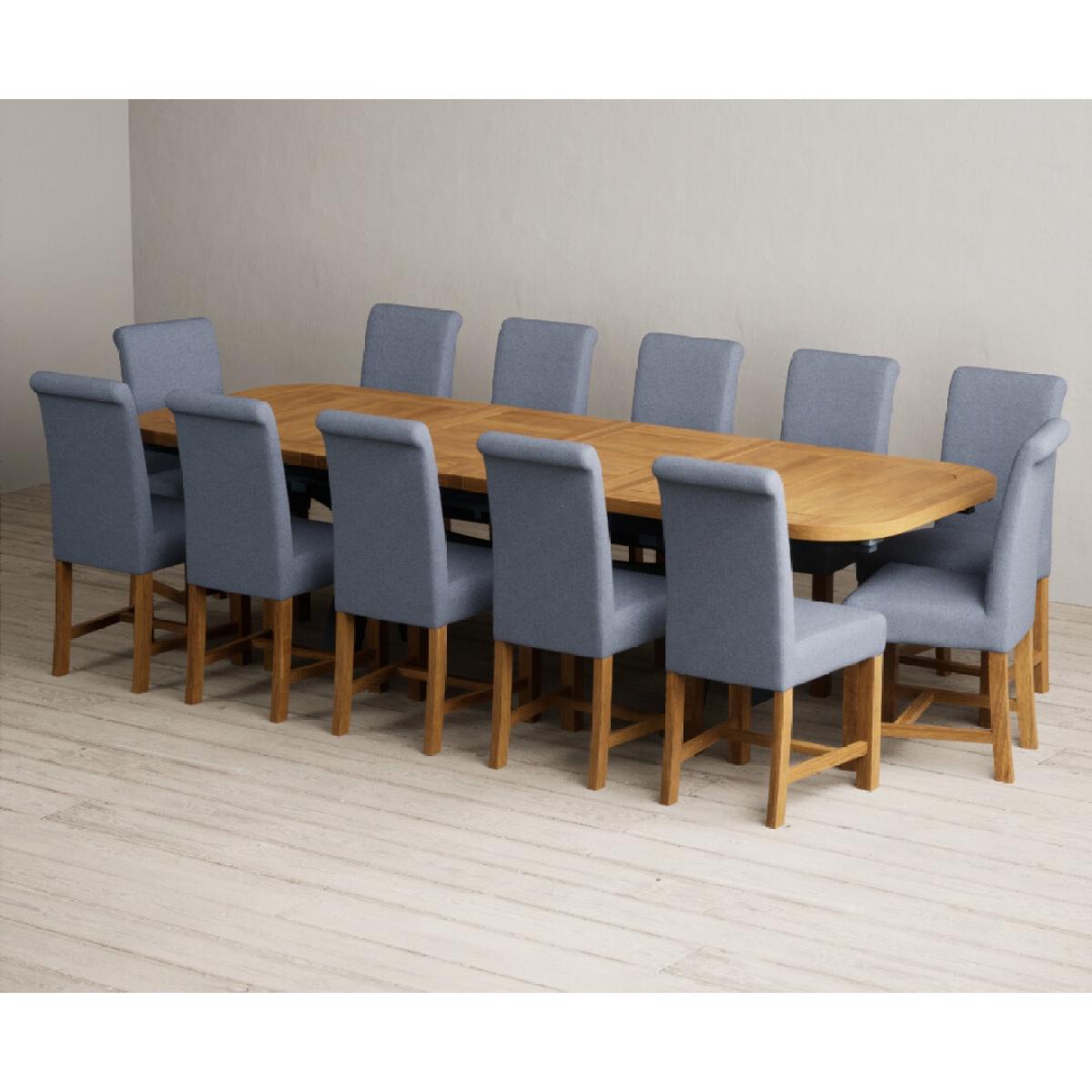 The Olympia 180cm Oak and Dark Blue Extending Dining Table with Scroll Back Braced Chairs is a stylish painted solid wood and solid oak extending dining set perfect for every occasion.