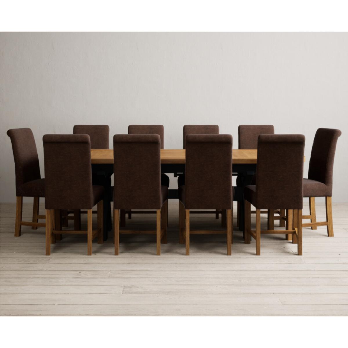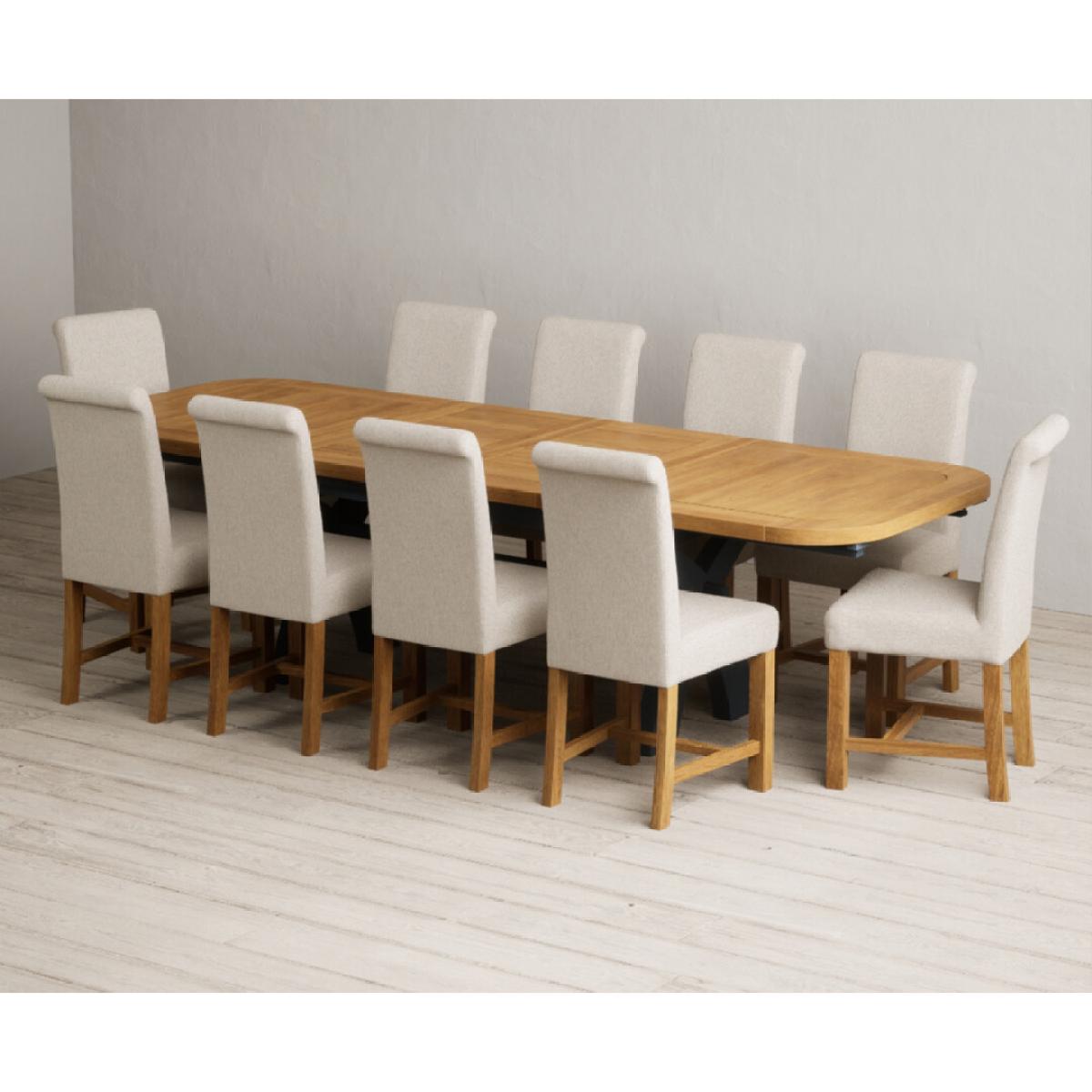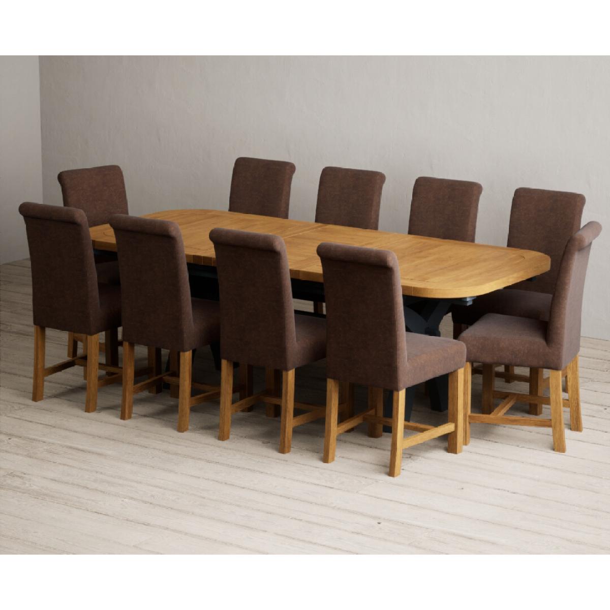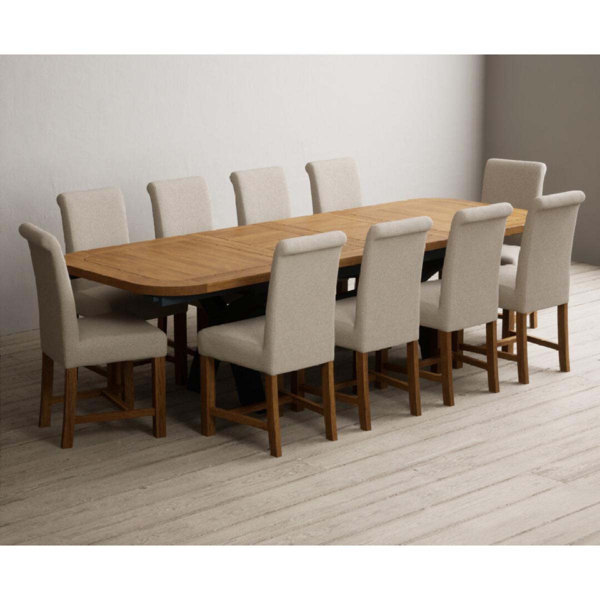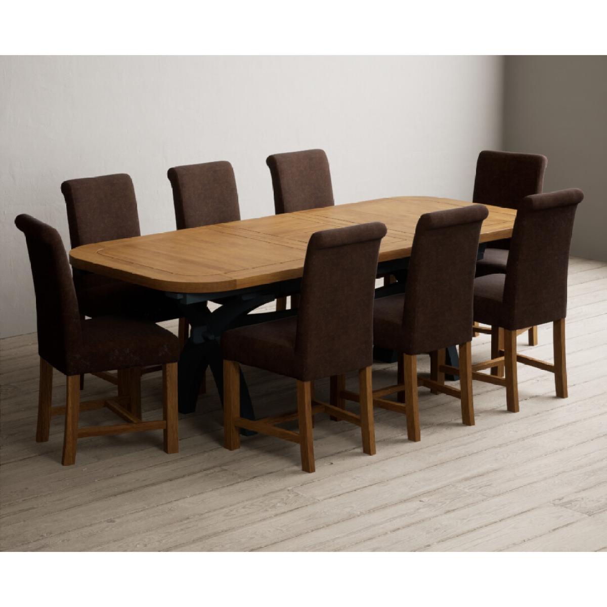 The Olympia 180cm Oak and Dark Blue Extending Dining Table with Scroll Back Braced Chairs is a stylish painted solid wood and solid oak extending dining set perfect for every occasion.