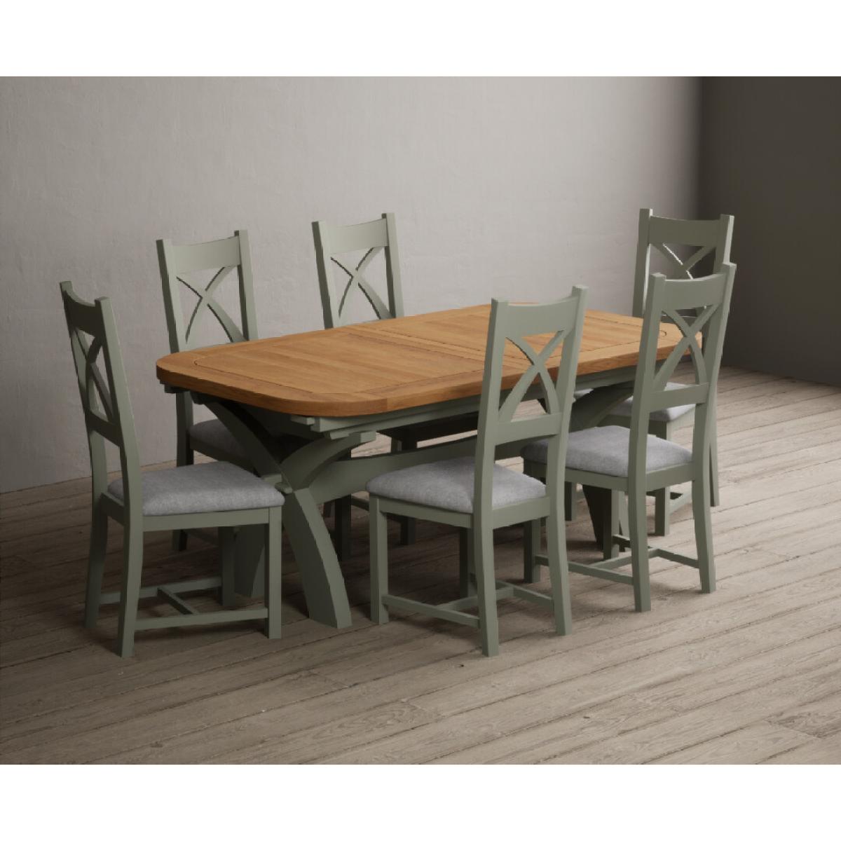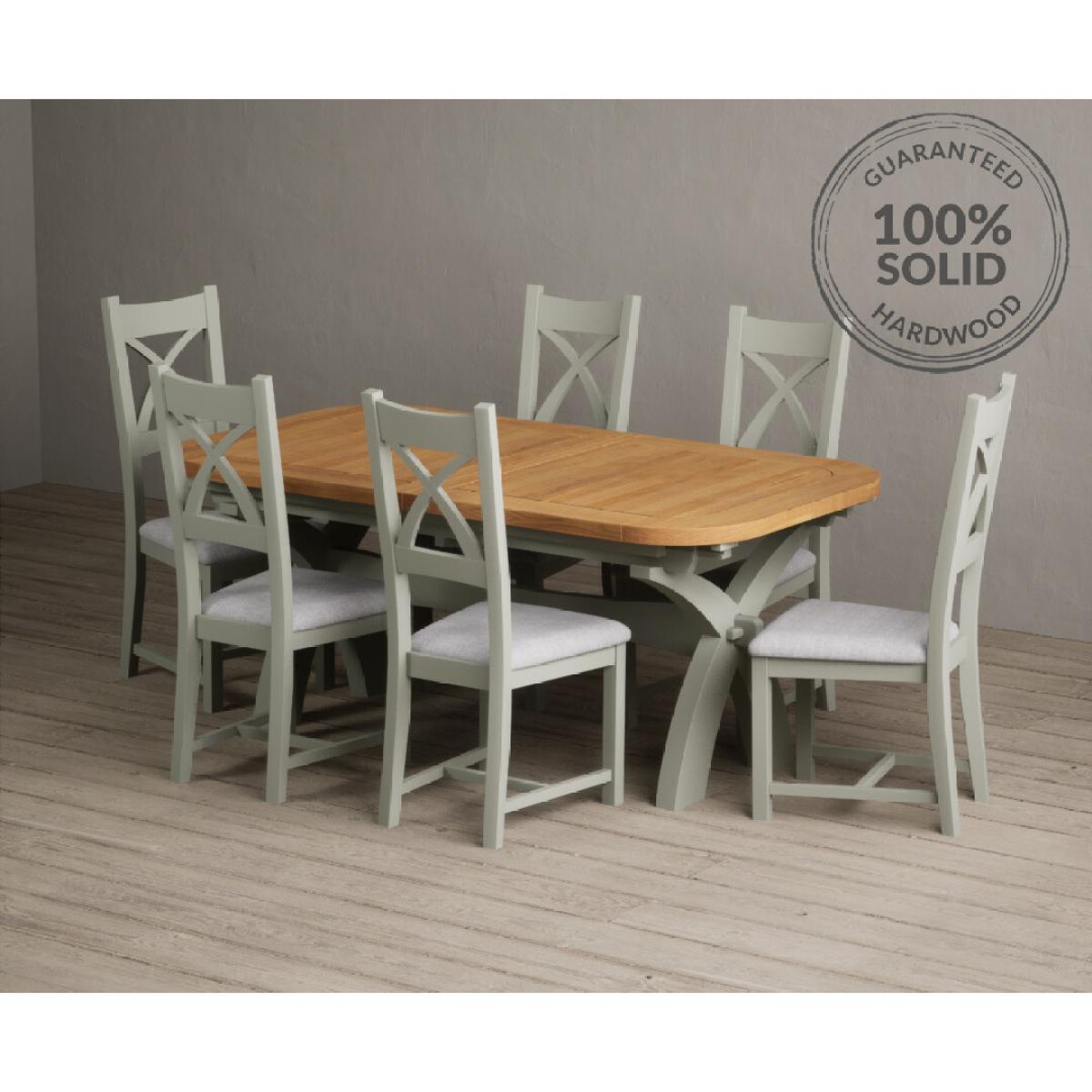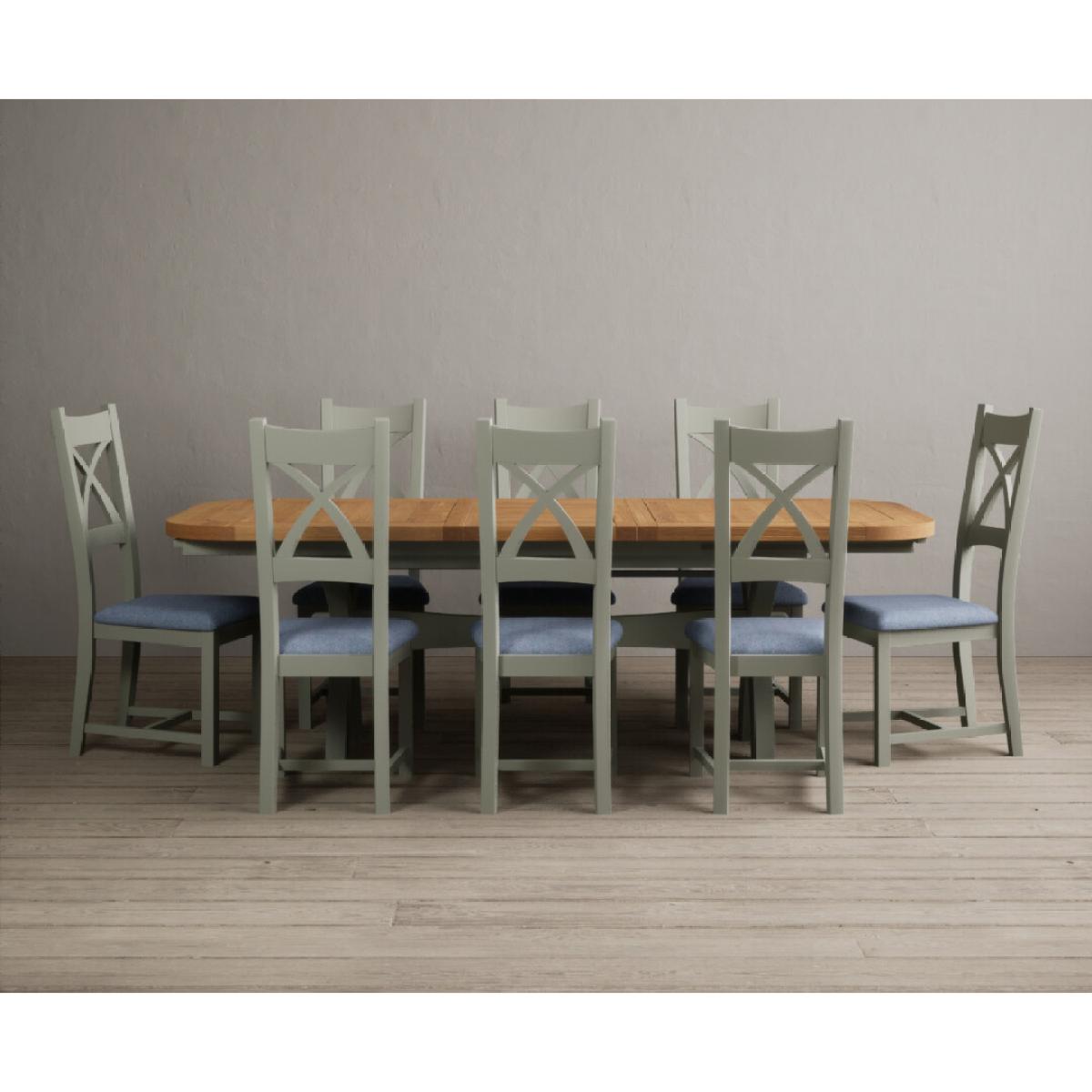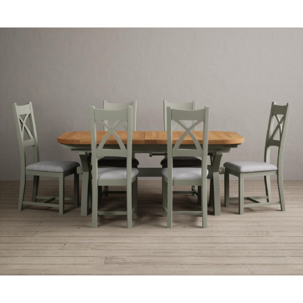 This table set strikes a lovely balance between practicality and style, making it versatile for a variety of interiors. The extendable feature is ideal for both everyday family dinners and larger gatherings, while the oak top adds warmth and texture, perfect for a cosy, country-inspired or modern rustic look. The soft green painted legs and linen chairs introduce colour and softness, making it suitable for fresh, light-filled spaces or even more muted, subdued colour schemes. When styling, consider keeping the surroundings minimal to let the table be a focal point, or add layered textiles and patterned accessories for a relaxed, lived-in feel. It works well in open-plan kitchens, dining rooms with a farmhouse vibe, or contemporary interiors embracing natural materials. Just a tip - pairing it with natural fibre rugs and simple decorative pieces will enhance its understated elegance.