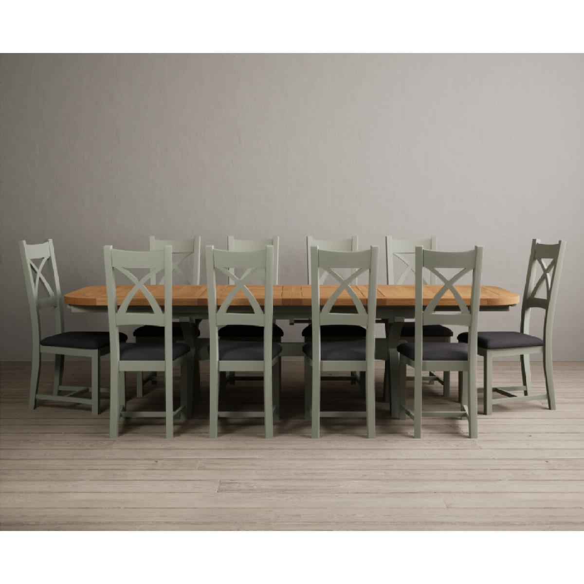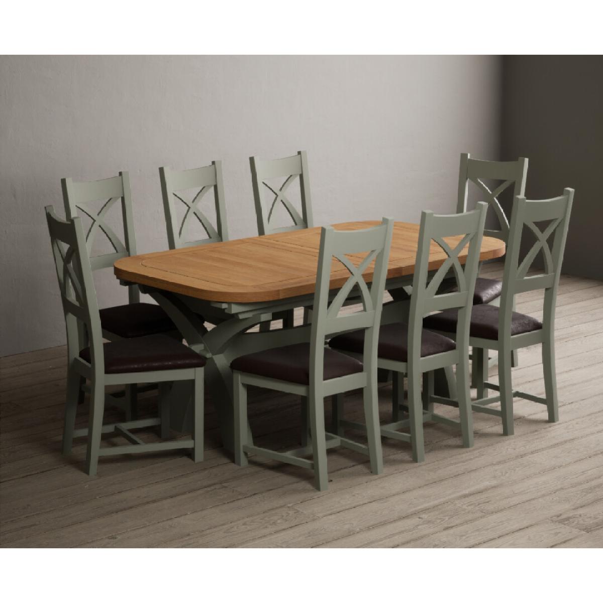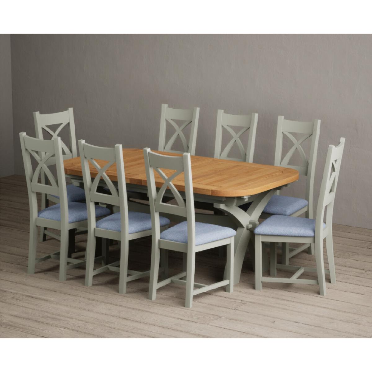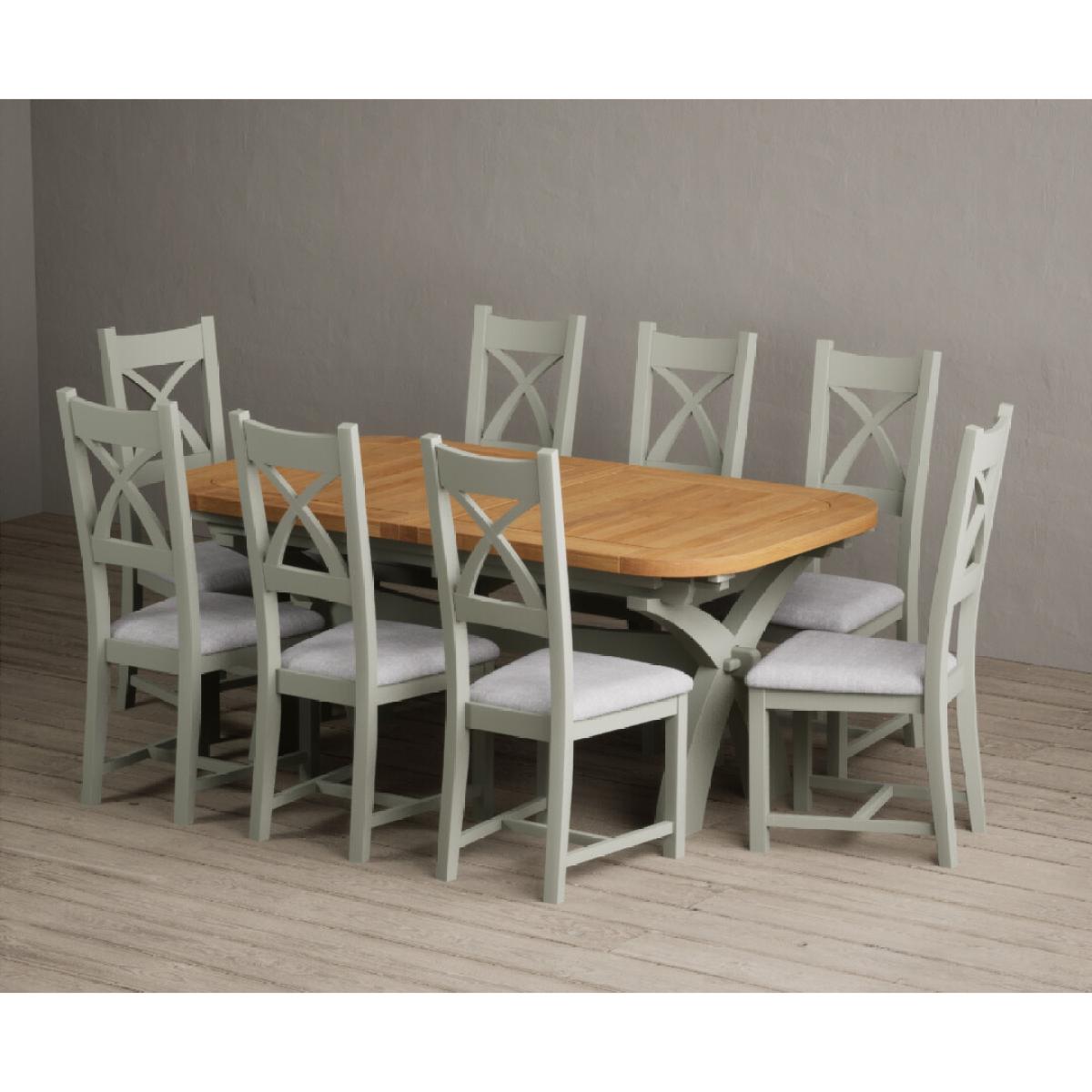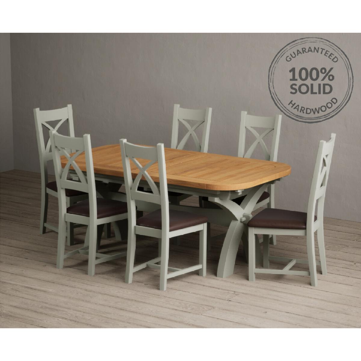 This table set strikes a lovely balance between practicality and style, making it versatile for a variety of interiors. The extendable feature is ideal for both everyday family dinners and larger gatherings, while the oak top adds warmth and texture, perfect for a cosy, country-inspired or modern rustic look. The soft green painted legs and linen chairs introduce colour and softness, making it suitable for fresh, light-filled spaces or even more muted, subdued colour schemes. When styling, consider keeping the surroundings minimal to let the table be a focal point, or add layered textiles and patterned accessories for a relaxed, lived-in feel. It works well in open-plan kitchens, dining rooms with a farmhouse vibe, or contemporary interiors embracing natural materials. Just a tip - pairing it with natural fibre rugs and simple decorative pieces will enhance its understated elegance.