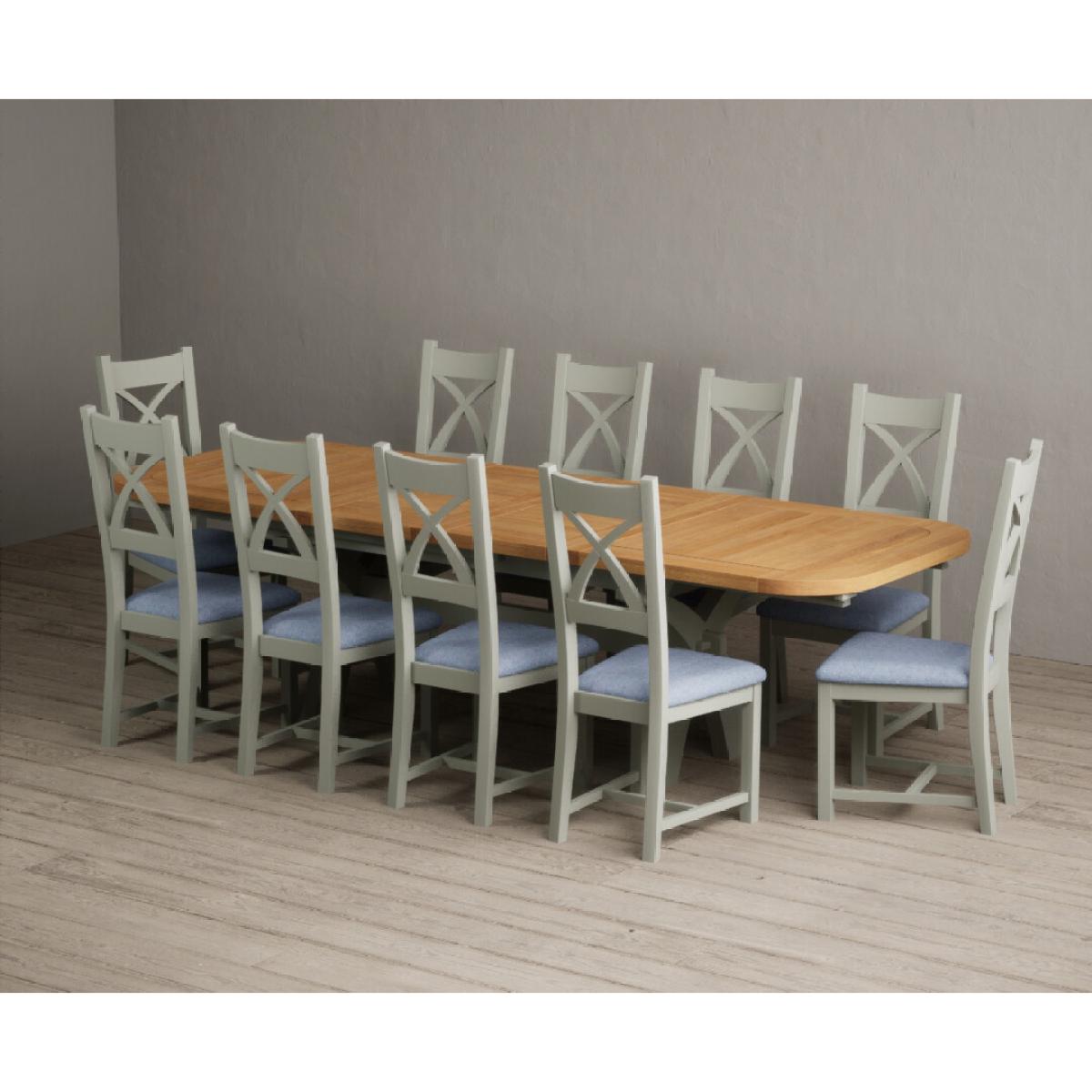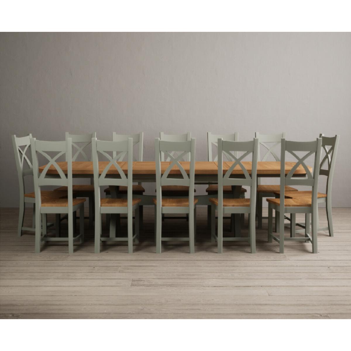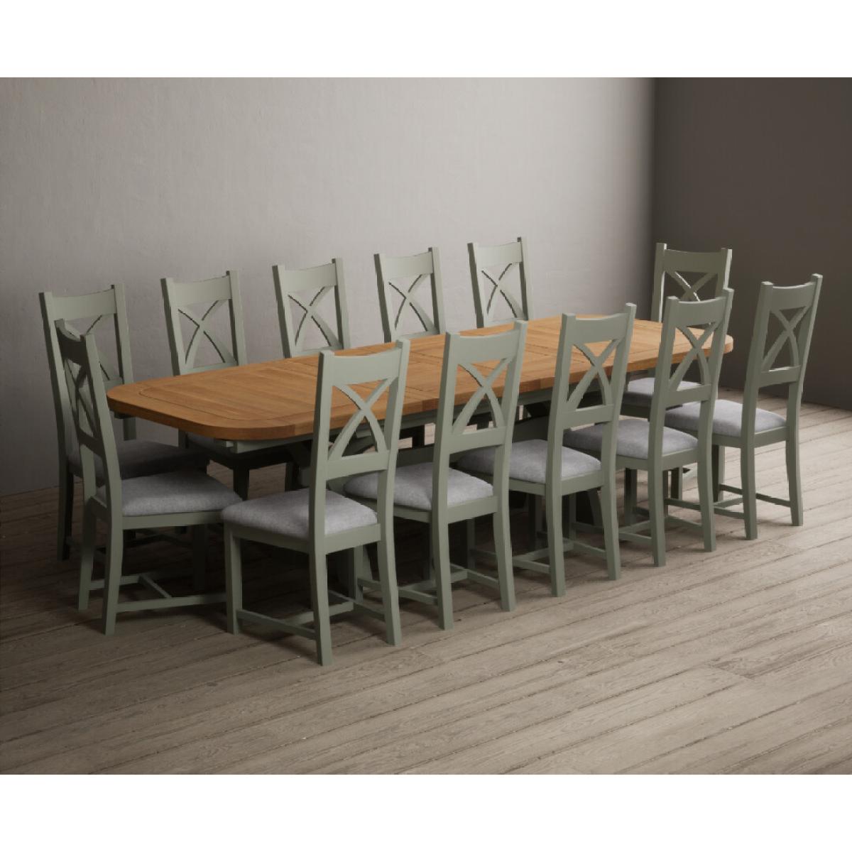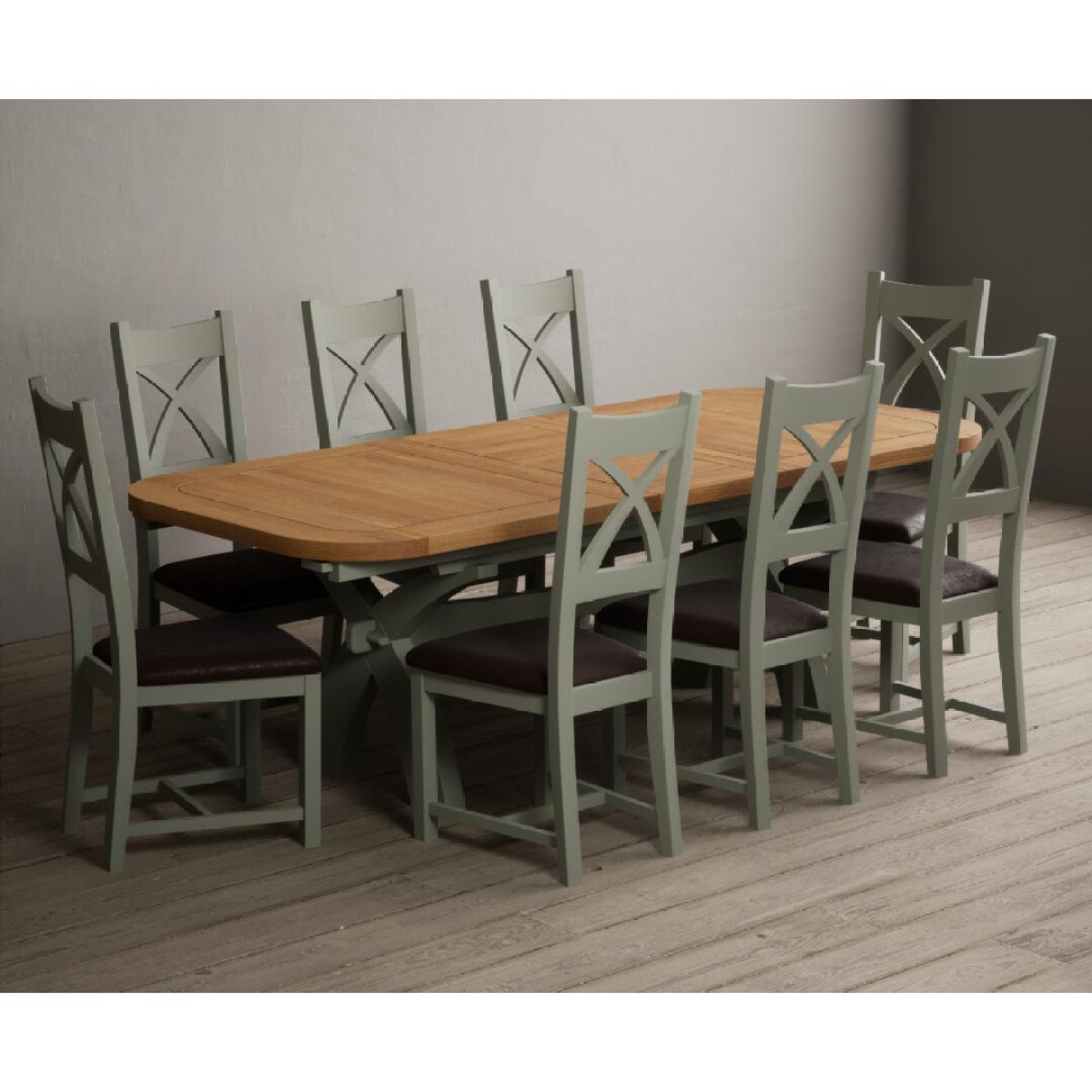 This table set strikes a lovely balance between practicality and style, making it versatile for a variety of interiors. The extendable feature is ideal for both everyday family dinners and larger gatherings, while the oak top adds warmth and texture, perfect for a cosy, country-inspired or modern rustic look. The soft green painted legs and linen chairs introduce colour and softness, making it suitable for fresh, light-filled spaces or even more muted, subdued colour schemes. When styling, consider keeping the surroundings minimal to let the table be a focal point, or add layered textiles and patterned accessories for a relaxed, lived-in feel. It works well in open-plan kitchens, dining rooms with a farmhouse vibe, or contemporary interiors embracing natural materials. Just a tip - pairing it with natural fibre rugs and simple decorative pieces will enhance its understated elegance.