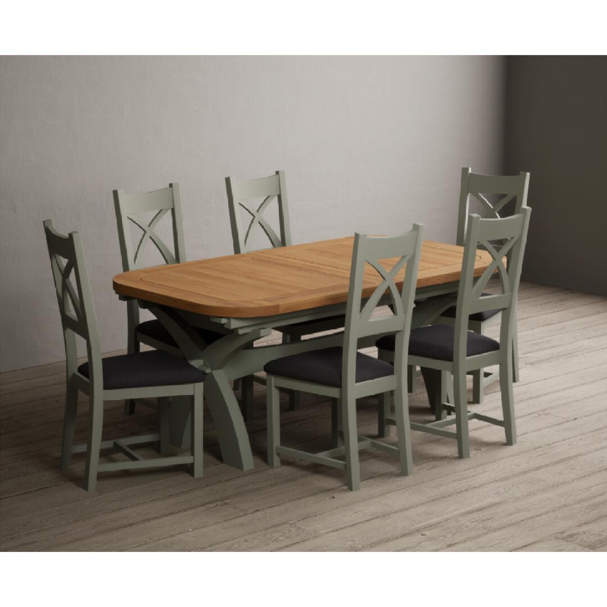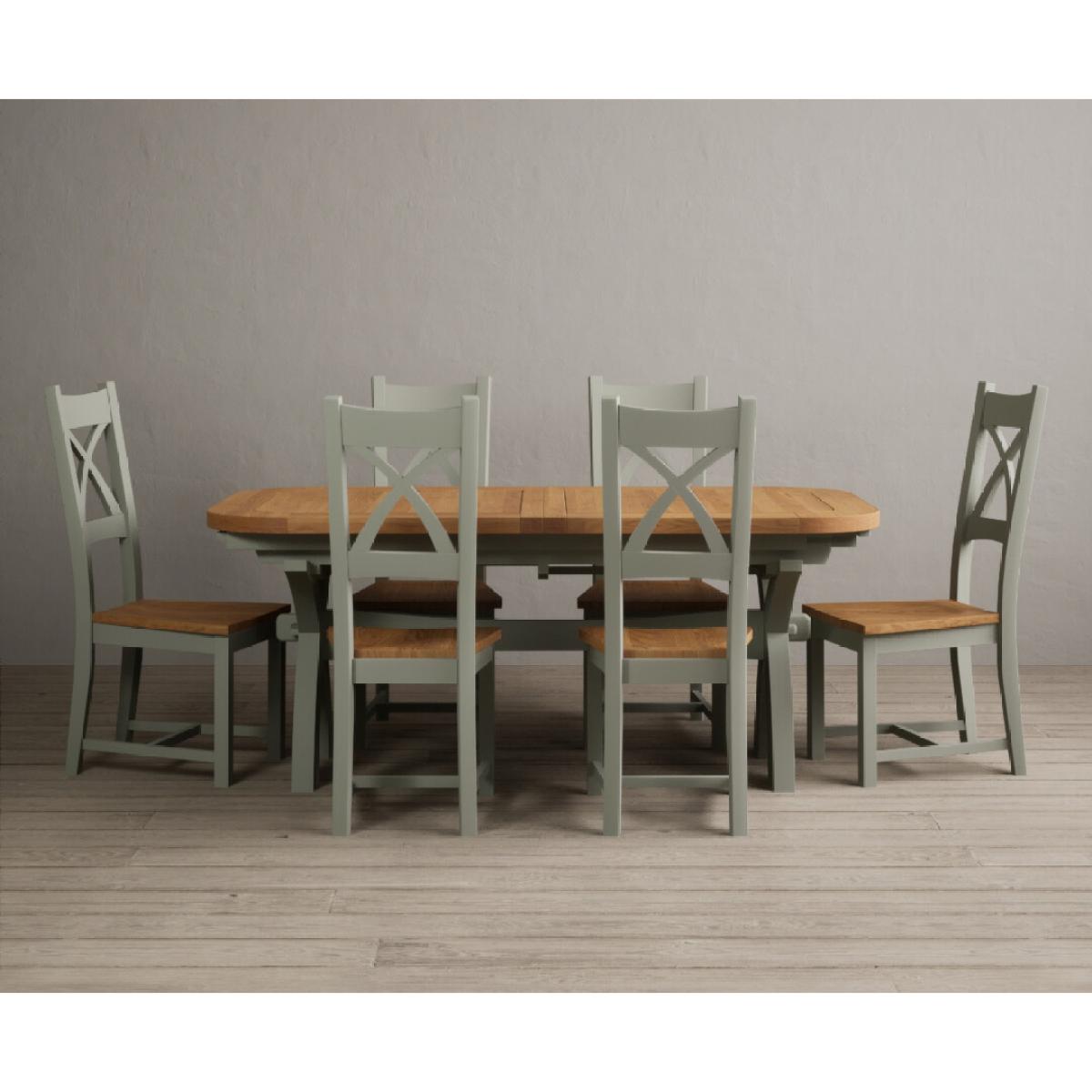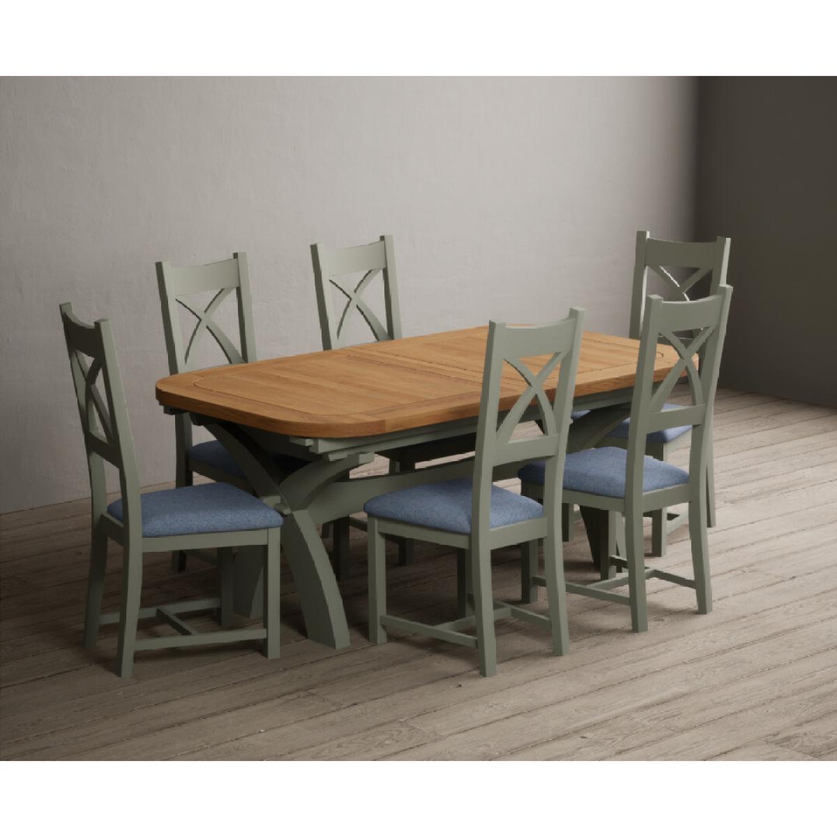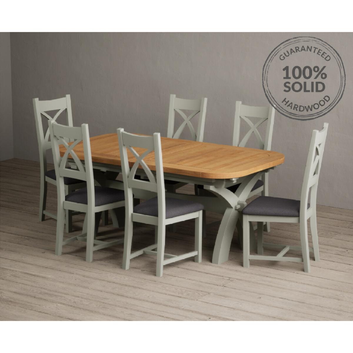 The Olympia 180cm Oak and Soft Green Painted Extending Dining Table with X Back Chairs is a painted extending dining set, made with 100% solid wood and 100% solid oak.