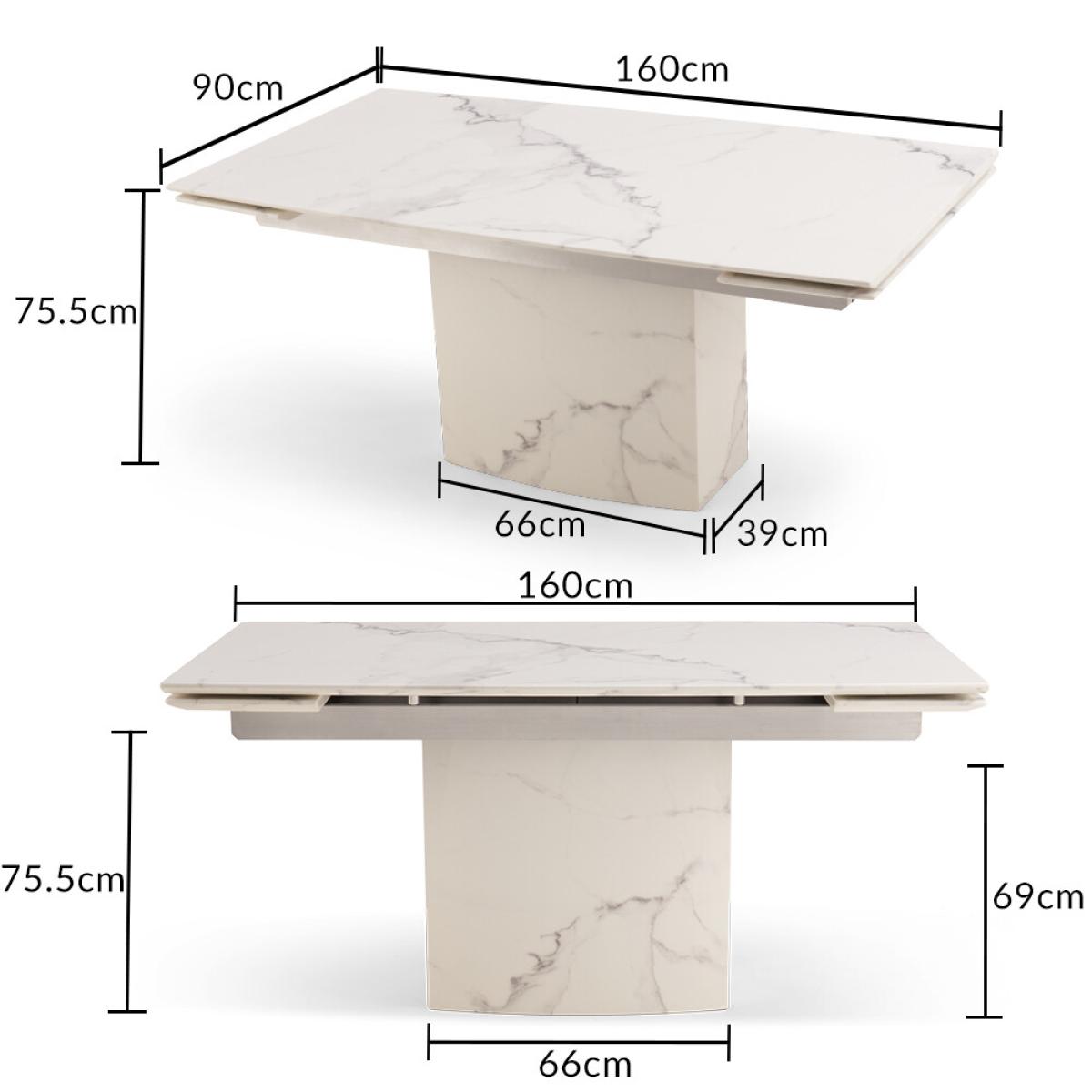 I love the sleek, contemporary feel of this white marble extension table, which works beautifully in modern or minimalist interiors. Its clean lines and elegant finish make it a versatile focal point, particularly in open-plan kitchens or dining rooms with neutral palettes. The 160cm size with extension capability offers practical flexibility for both everyday dining and larger gatherings. The matching white Aldo chairs add to the cohesive look, keeping the setting light and airy. For styling tips, I recommend balancing the monochrome palette with natural textures like wood or greenery, and incorporating colour through accessories such as bold placemats or statement lighting to add warmth and interest to the space.