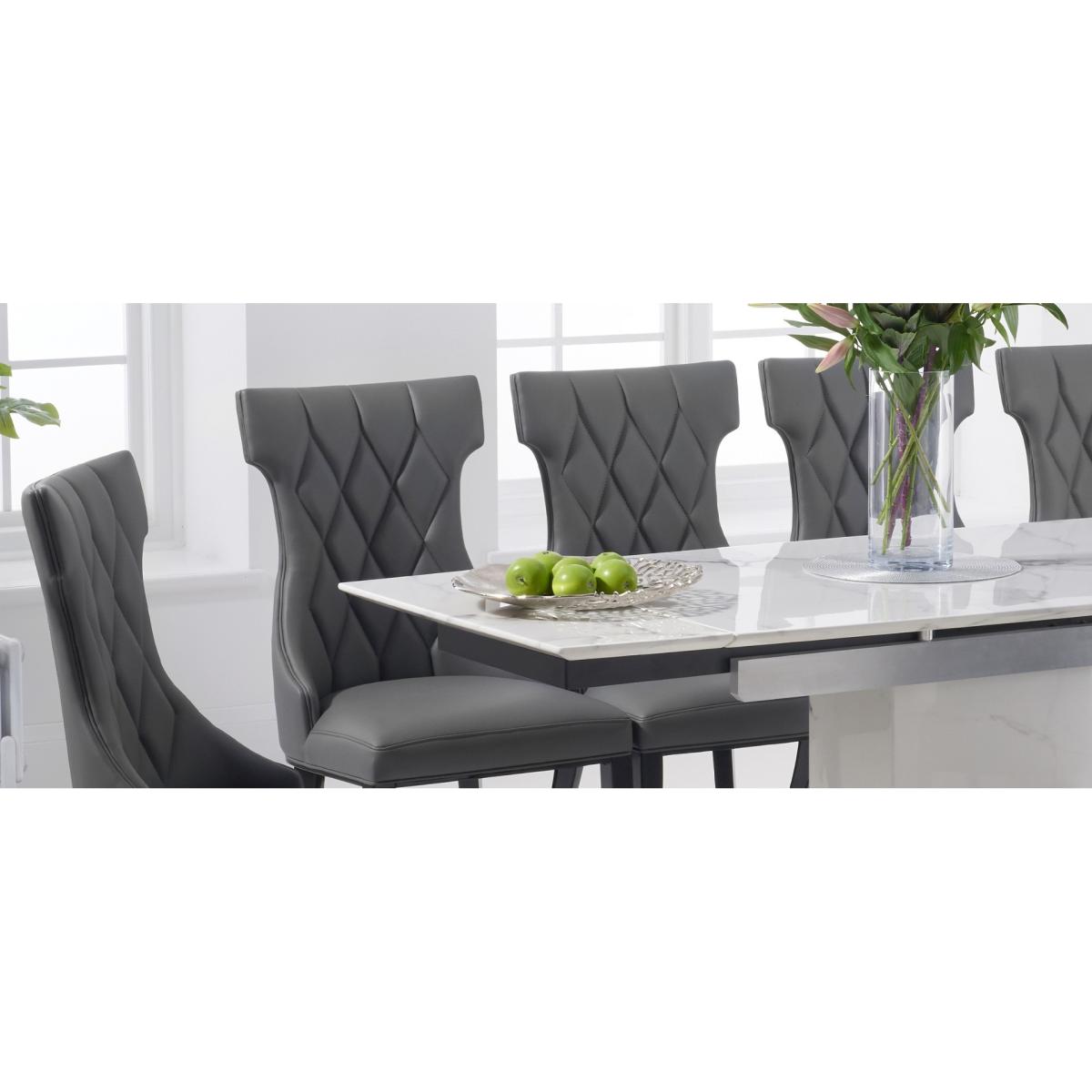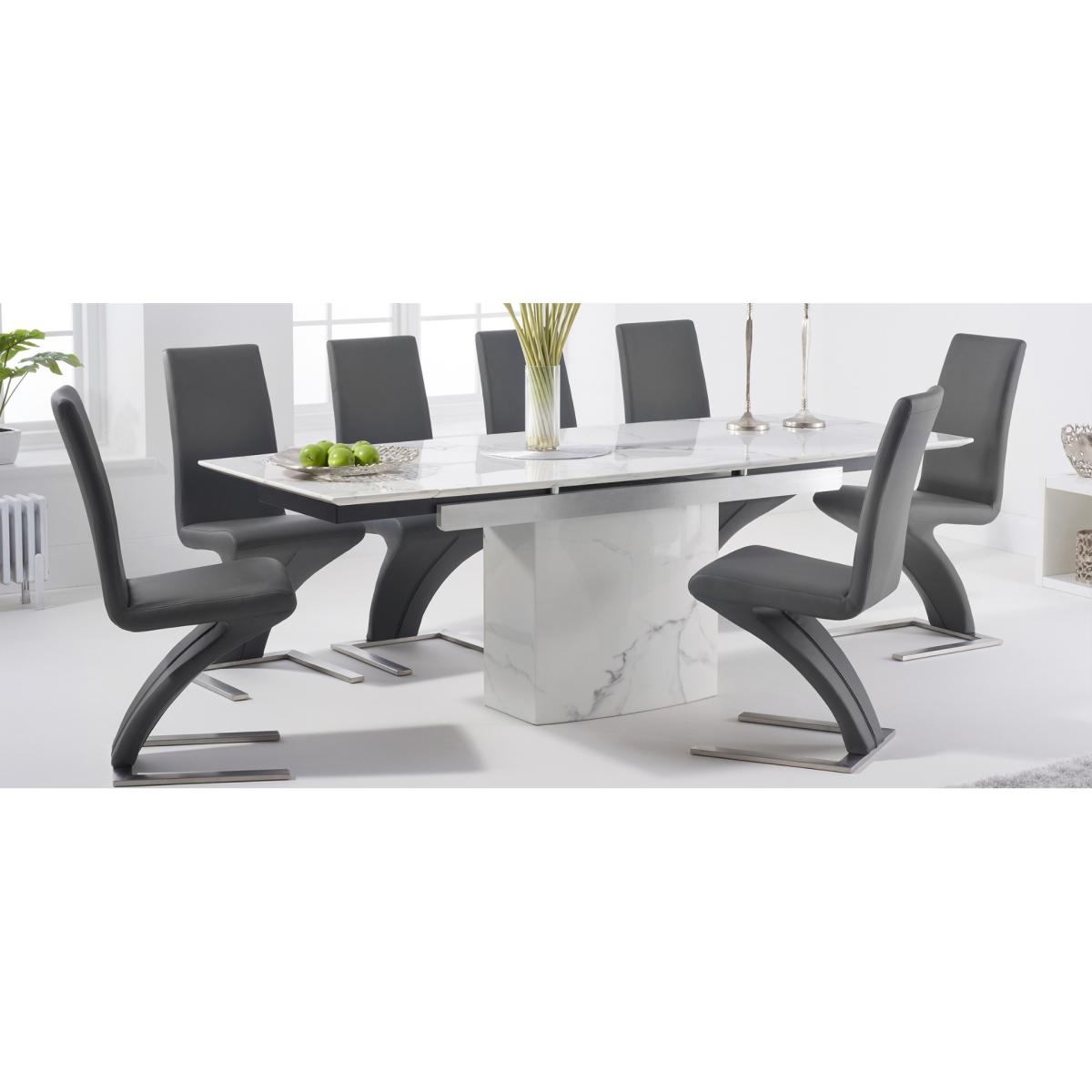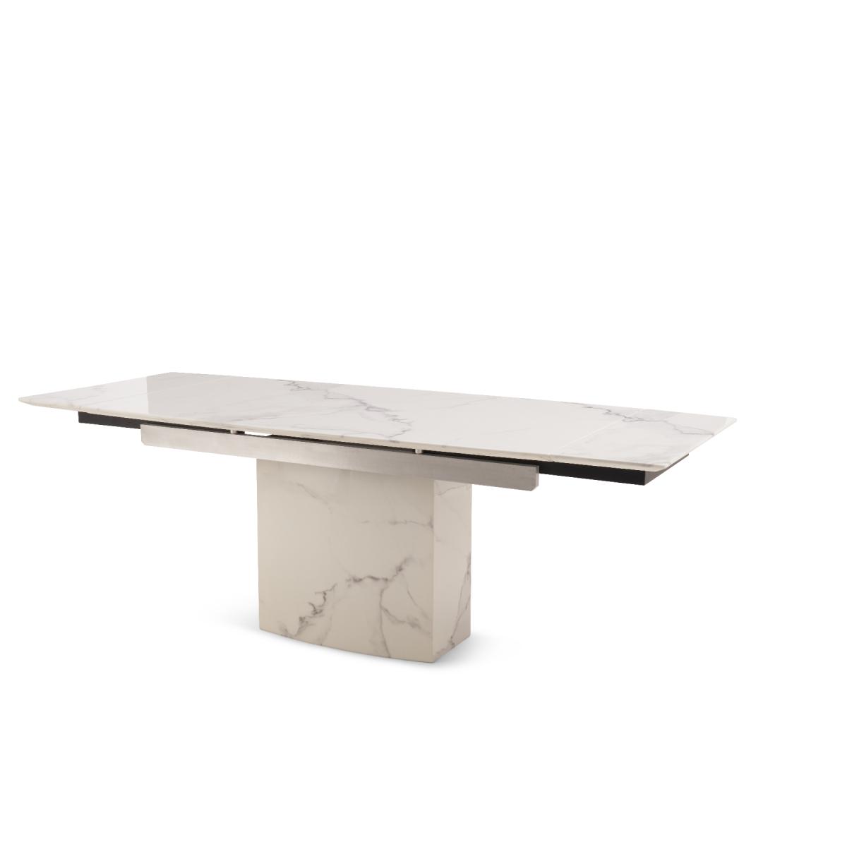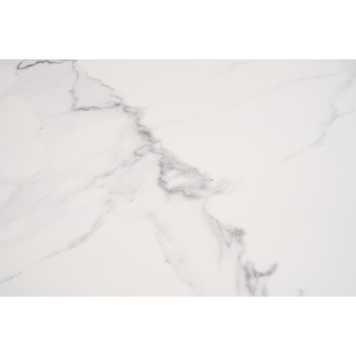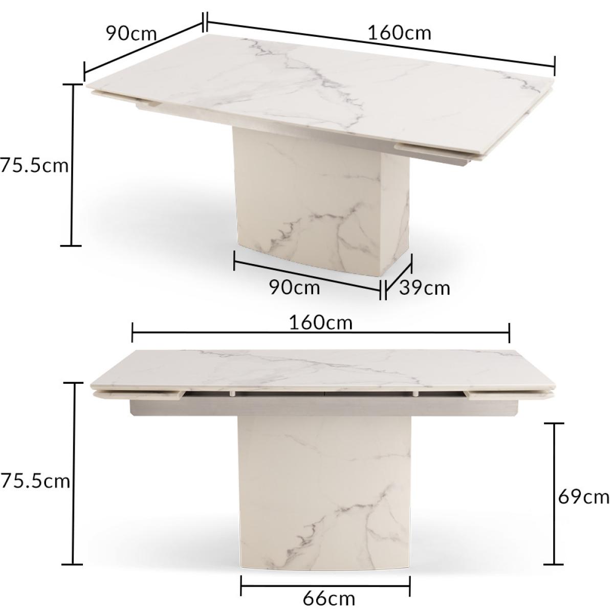 The extending table's smooth white marble effect finish features beautiful natural patterns for a statement look. Sleek and wipe-clean.