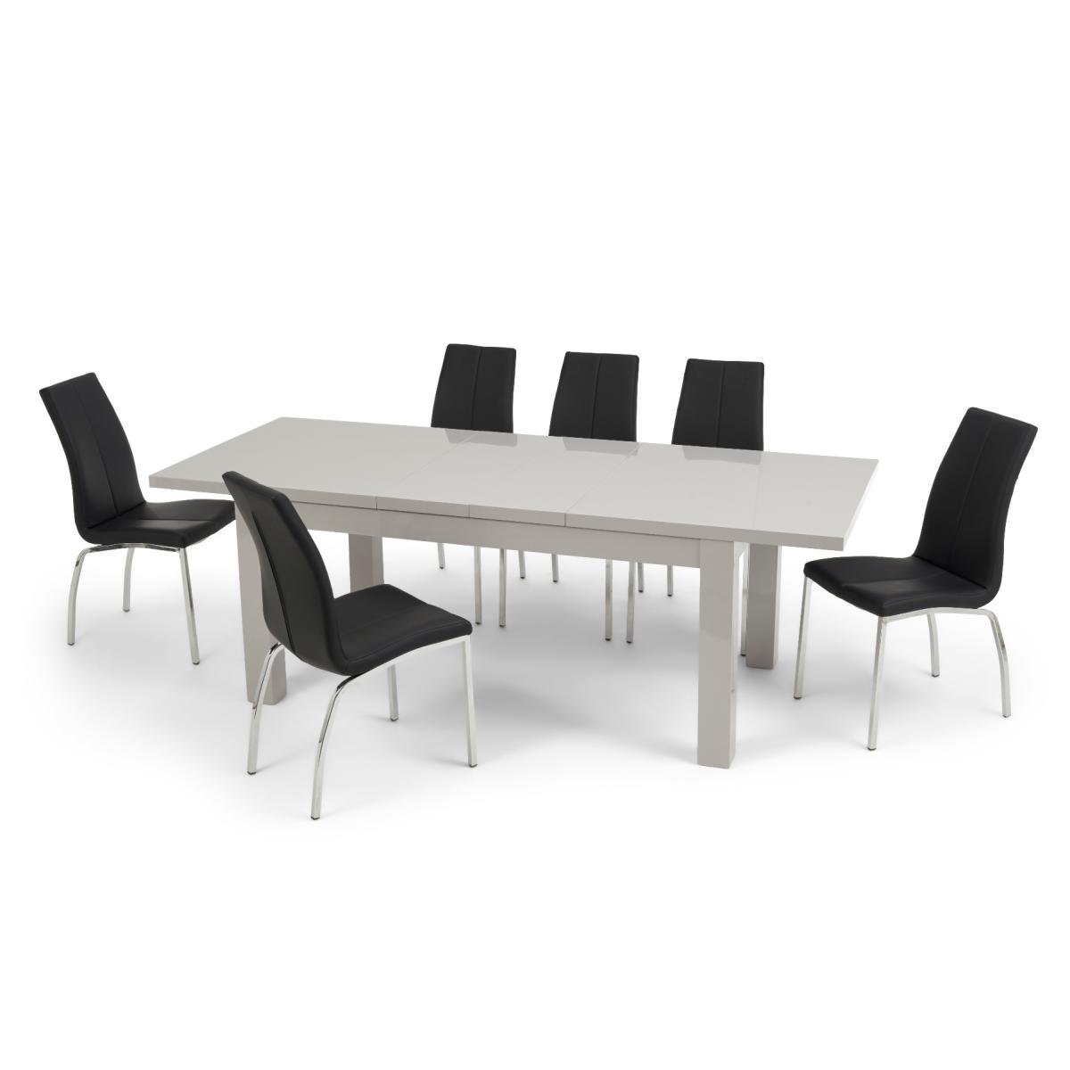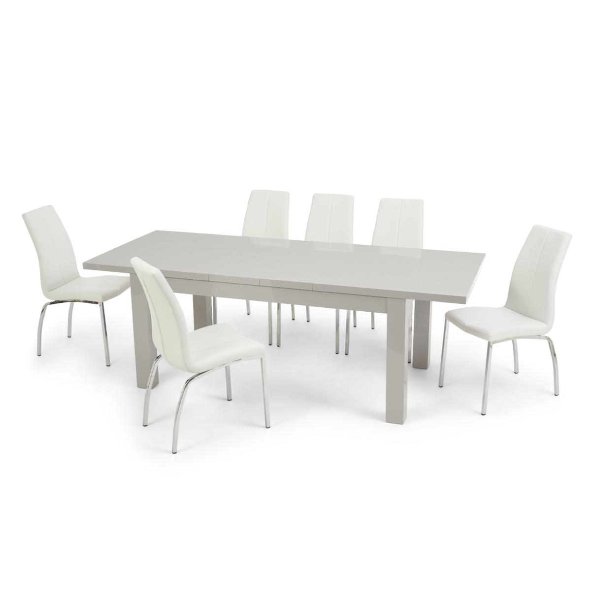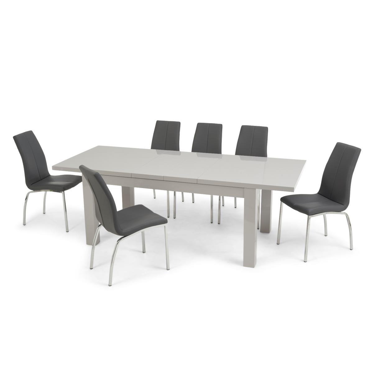 I love how this dining set offers a sleek, modern look with its high gloss finish and neutral grey tones, making it versatile for a range of interiors. The Extending Seattle table is a practical choice, particularly in spaces where you might need extra seating for guests, and the grey Marco chairs add a contemporary touch with their streamlined design. This set works well in minimalist, Scandinavian, or even industrial interiors, where its clean lines can shine. For styling tips, consider adding textured or colourful accessories like placemats, cushions, or centrepieces to soften the high gloss surface and create a more inviting dining environment. Pairing it with elements in wood or warm metals can also add contrast and warmth to the overall look.