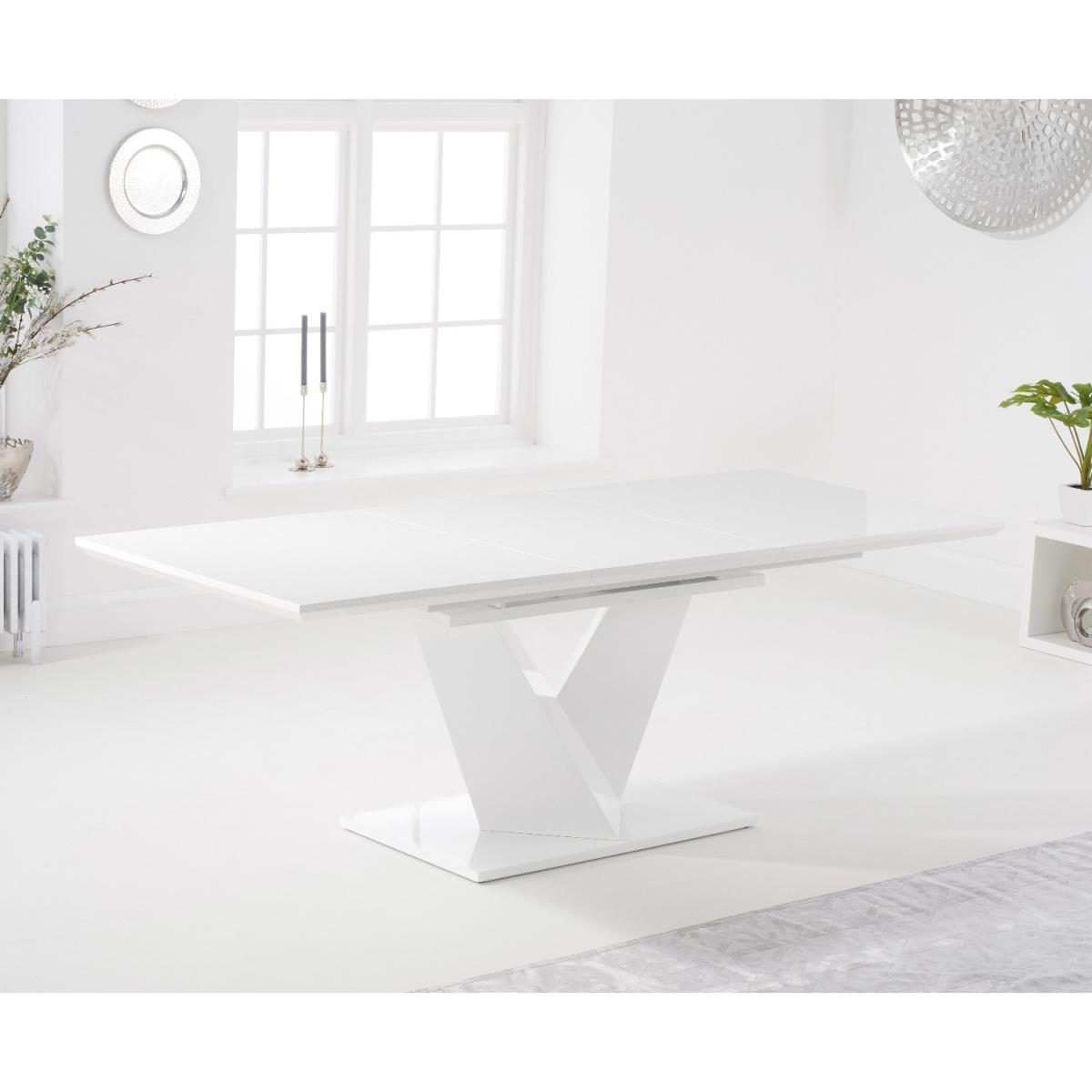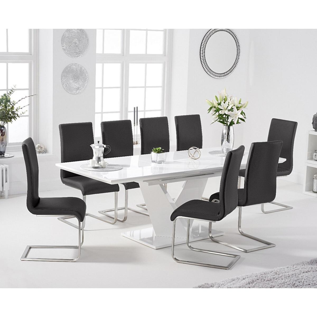 The extending Vittorio white high gloss dining table with Austin faux leather chairs is a striking addition to any dining room