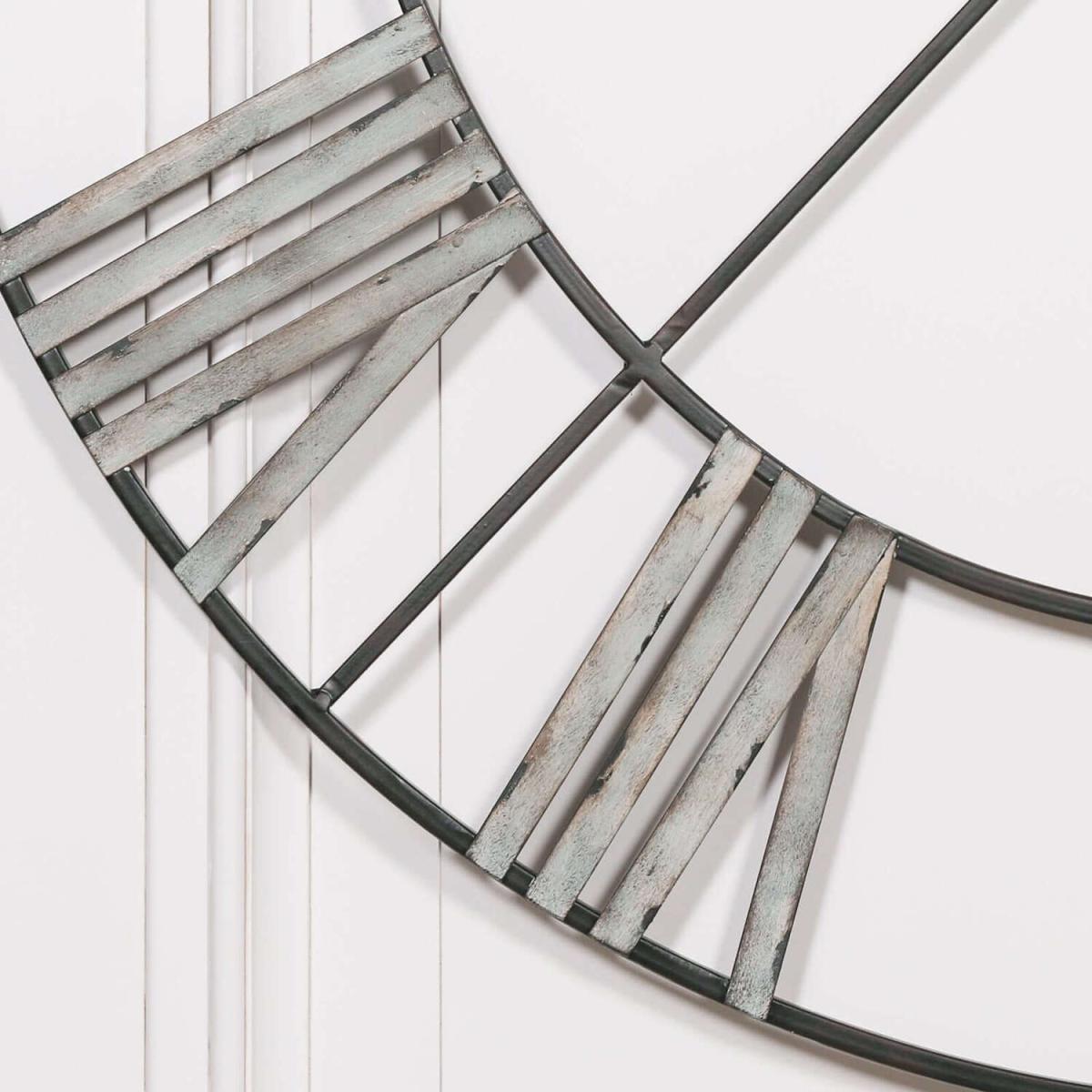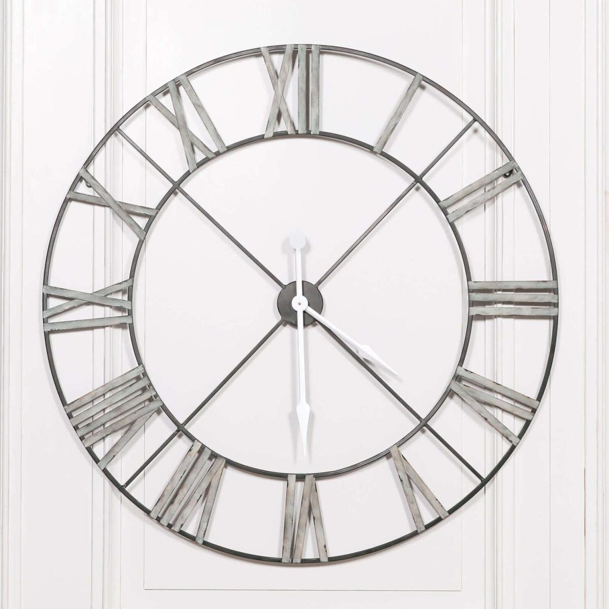 Metal construction with a distressed, antique finish, featuring black metal frame and contrasting white clock hands with roman numerals. This wall clock will look great in either an antique or a contemporary industrial style interior. This 110cm Large industrial design wall clock is made of metal, the artisan hand finish contributes to the authentic rustic appearance. The wall-mounted clock's distressed look adds an intriguing concept. Not suitable for outside use.