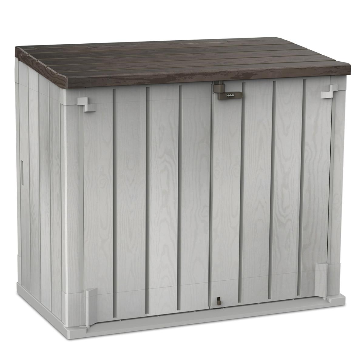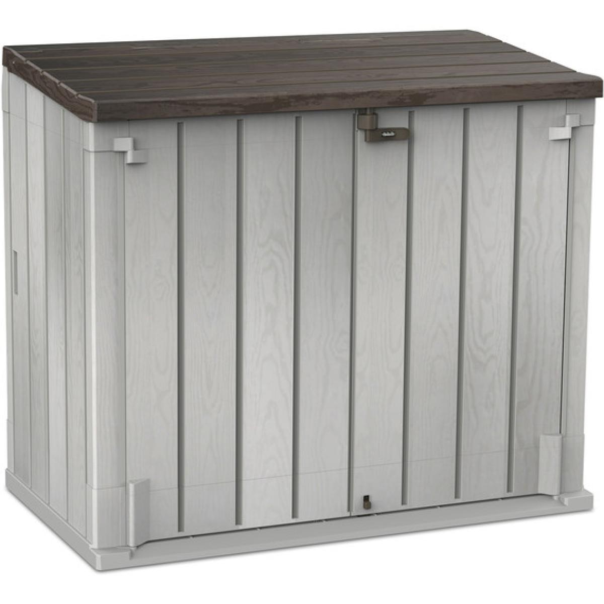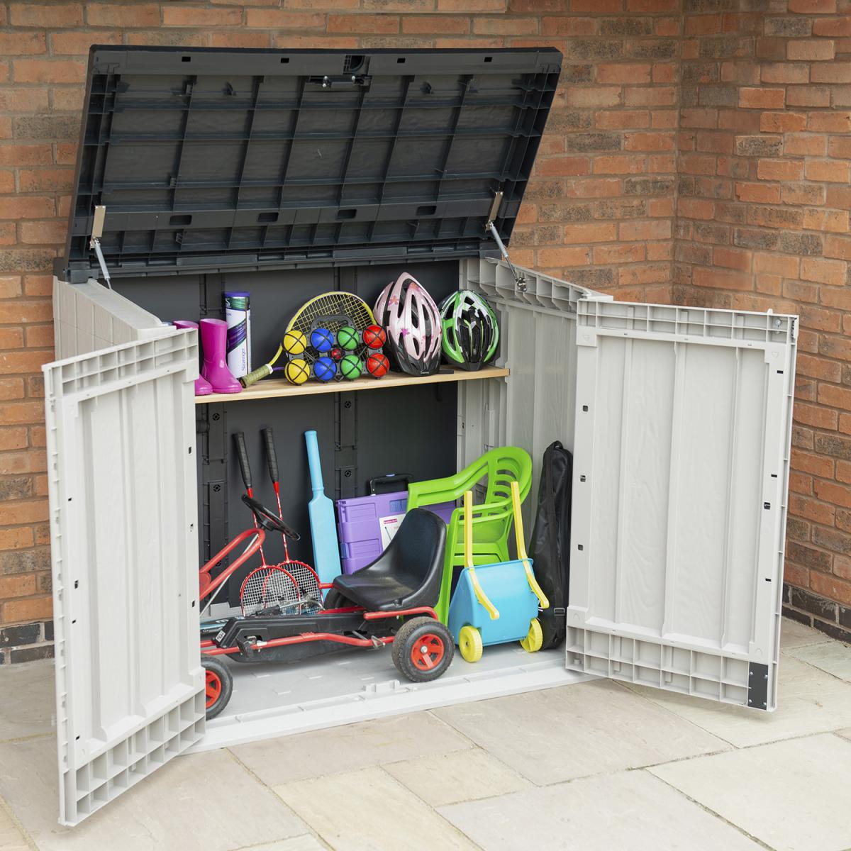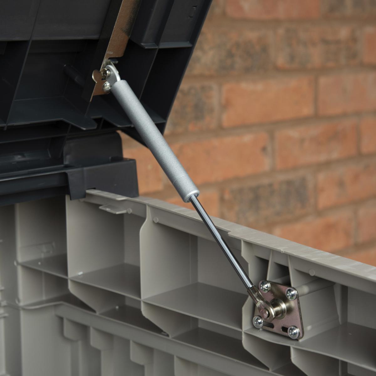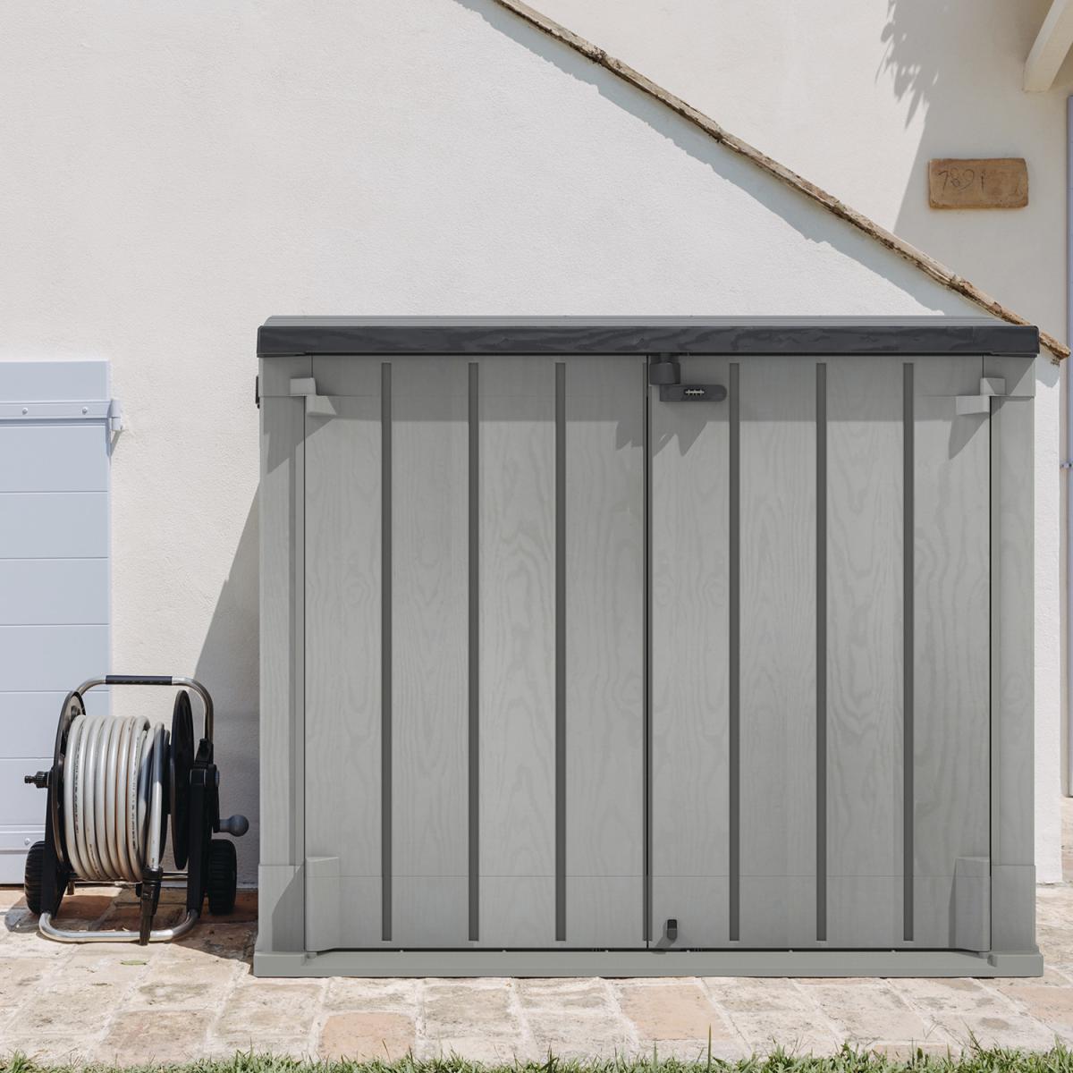 The Extra Large Garden Storage Bin is a flexible storage unit that offers a generous 1200 litre capacity and great access to its contents with a fully opening front and lid. Measuring at 145cm wide and 124cm high, the storage unit is big enough for a large variety of things, from outdoor furniture to garden tools and equipment such as lawnmowers, to BBQs or even children's toys and bikes. The lid benefits from having two gas pistons that provide assisted lifting, and keeps it open when required. The turn handle at the front secures both doors, and the lid can be locked with the use of a padlock to keep the contents of the store safe. This storage bin also features slots in the side walls allow for one or two shelves to be inserted against the back wall, allowing you to maximise your storage possibilities. Finished in a contemporary taupe grey colour with a subtle wood-grain textured finish, this extra large storage unit is easy to assemble with individually marked components that slot and snap together. The only tool required to complete assembly is a posi-drive screwdriver to secure the handle and locking mechanism.