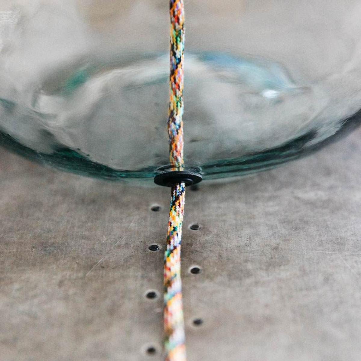 Our extra large clear glass lamp combines organic style with subtle minimalism, ensuring a timeless lighting option. Handcrafted from recycled glass, this statement lamp features an oversized bulb-shaped base with a unique multi-colour woven fabric cord that runs through the middle.