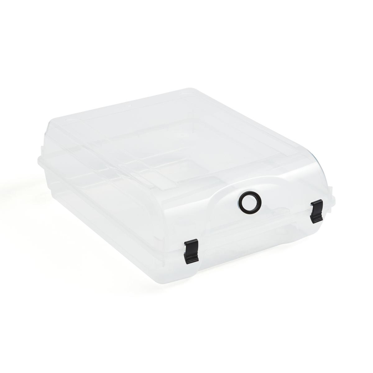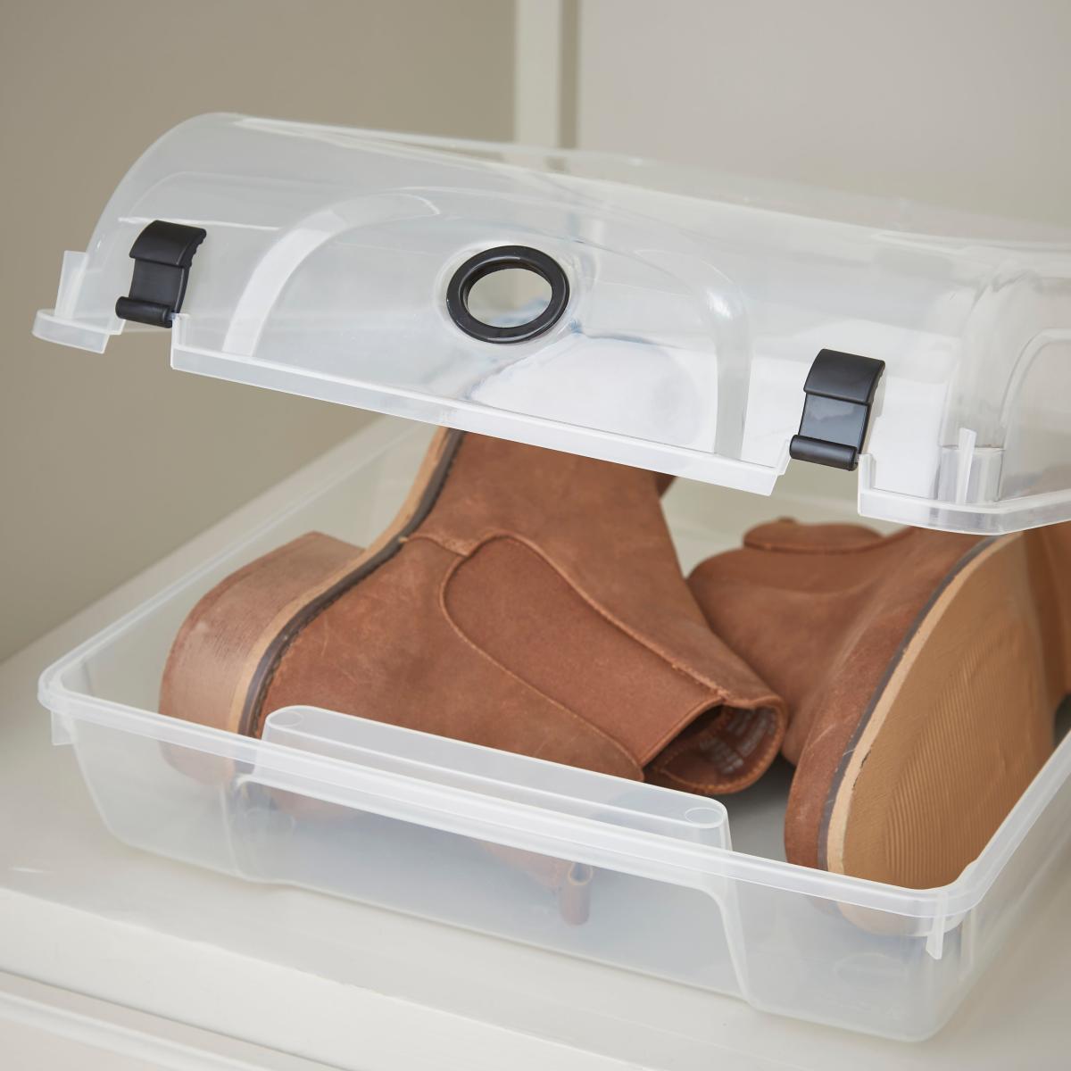 * Durable* Nestable and Stackable* Transparent look* Flat and elongated Keep your shoes organised and clean with our Extra Large Shoe Box, crafted from polypropylene with a secure clip lock. It's designed with a breathable airway to let your shoes breathe and is nestable when not in use and stackable if you've got plenty of shoes to store! Available in a small and large size.