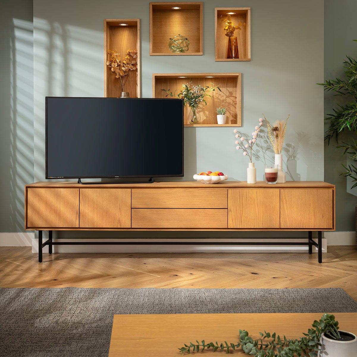 This large wooden TV unit combines modern style with practical storage, making it one of the most functional television stands available. Whether used as a freestanding media unit or wall mounted TV stand, this extra large design works beautifully in open spaces. This is a premium light wooden TV stand that doubles up as a wall hung TV cabinet - built to last. Crafted in high-quality light wood, this 240cm wide TV cabinet delivers sleek modern appeal. At 42cm deep, it arrives preassembled - simply attach the included metal legs, or use the integrated French cleat wall mounting system for a floating effect. Standing 60cm tall with legs, or 35cm without, this stylish TV unit also pairs with other furniture from the Grado collection. This wide TV stand maximises organisation with two 73cm wide, 35cm deep, 27cm high cupboards, a 66cm wide, 31cm deep, 8cm high drawer, and a 70cm wide, 35cm deep, 11cm high flap-door compartment. Designed for large spaces, this wooden TV unit combines style and practicality, offering a media unit that feels spacious. W240cm D42cm H60cm French cleat wall hanging bracket included Supplied preassembled, you’ll simply attach the legs
