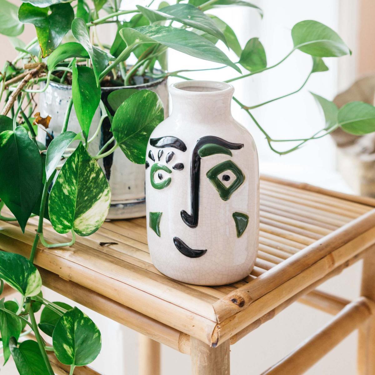 I love this little face print vase for its playful and contemporary charm. It works well in minimalist or modern interiors, adding a touch of personality without overwhelming the space. It’s perfect for displaying small blooms or greenery, but also looks great as a standalone decorative piece on a shelf or side table. To style it effectively, consider pairing it with other sculptural objects or natural textures like wood or ceramics to create an eclectic yet cohesive look. Its compact size makes it versatile for many spots-whether on a mantel, windowsill, or a centred console, offering a quirky focal point that can brighten up any room.