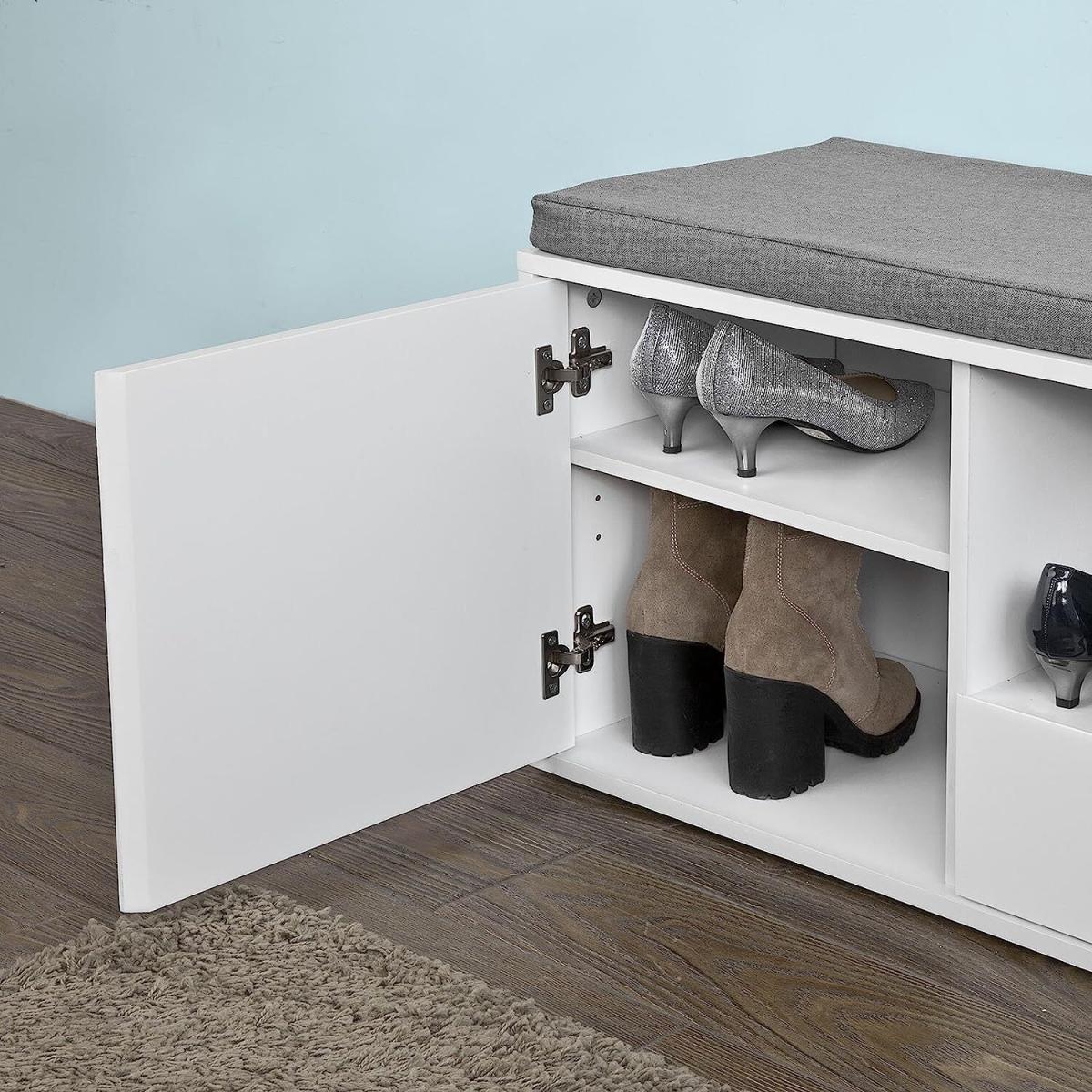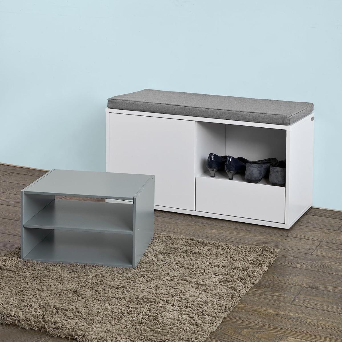 Modern design shoe cabinet shoe bench, good choice for your hallway and living room. The padded seat which is removable is ideal for comfortable sitting while putting on and taking off shoes. It has a cabinet with internal adjustable shelf. The 2-tier shelf can be pulled out completely as a great storage solution. There is a drawer under the shelf, a storage space perfect for shoe polish and brush, and other small items.