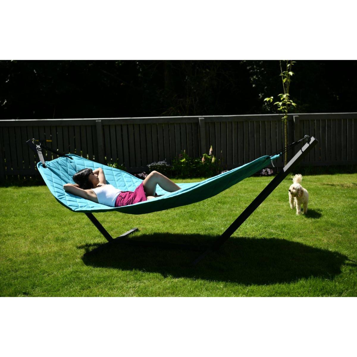 Who doesn't love the thought of drifting asleep on an ever-so-gently swaying hammock? We certainly do. That's why we applied our legendary bean bag know-how to creating this sumptuous relaxation piece. It's crafted from our super-soft yet durable quilted fabric and supported by an ultra-stable base in lightweight tubular steel that's easily erected and neatly folded away in no time. Dimensions: H 115cm x W 130 x L310cm Weight: 28kg Load Capacity: 150kg Quick and easy to assemble Made from 88% Polyester and 12% Polyethylene Waterproof Design UV Resistant, no-fade fabric Stand made from tubular steel and finished with a rust-resistant coating All screens vary in colour reproduction and whilst every effort has been made to display the colour as accurately as possible it is for guidance only.