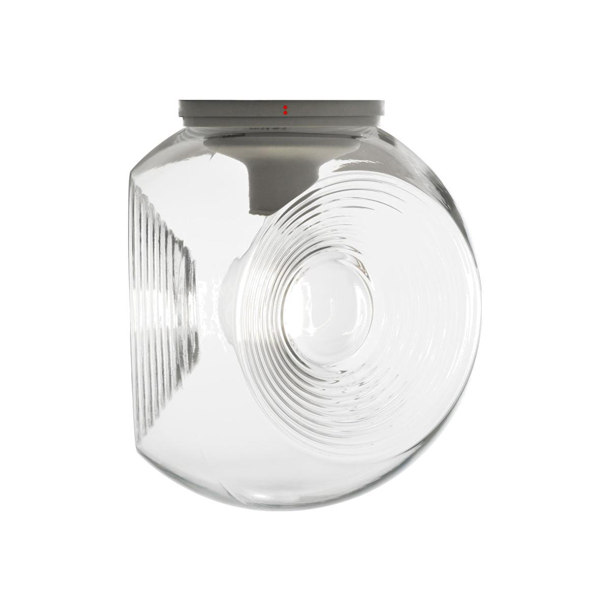 What could be more simple than a glass ball? How can you give intensity to such an essential profile? Matali Crasset, the designer of Eyes took inspiration from these questions in order to create a this shape of lighting diffusers, and with three spots hollowed out inside the sphere was able to obtain the two different light intensities she was looking for. The Eyes lamp, similar to an amplifier, spreads a clear, bright energy through the fundamental glass element, diffusing light in every environment. In this particular lamp collection, the simplicity of the sphere meets the technical essence of the design, and recreates ribbed conical cones inside the grooves, to become an object that conveys character to any environment. The Eyes collection is made up of a pendant lamp, a ceiling lamp and a table lamp for indoor rooms. Available in two colour variations: transparent and white frosted glass. The energy voltage is suitable for fluorescent bulbs.