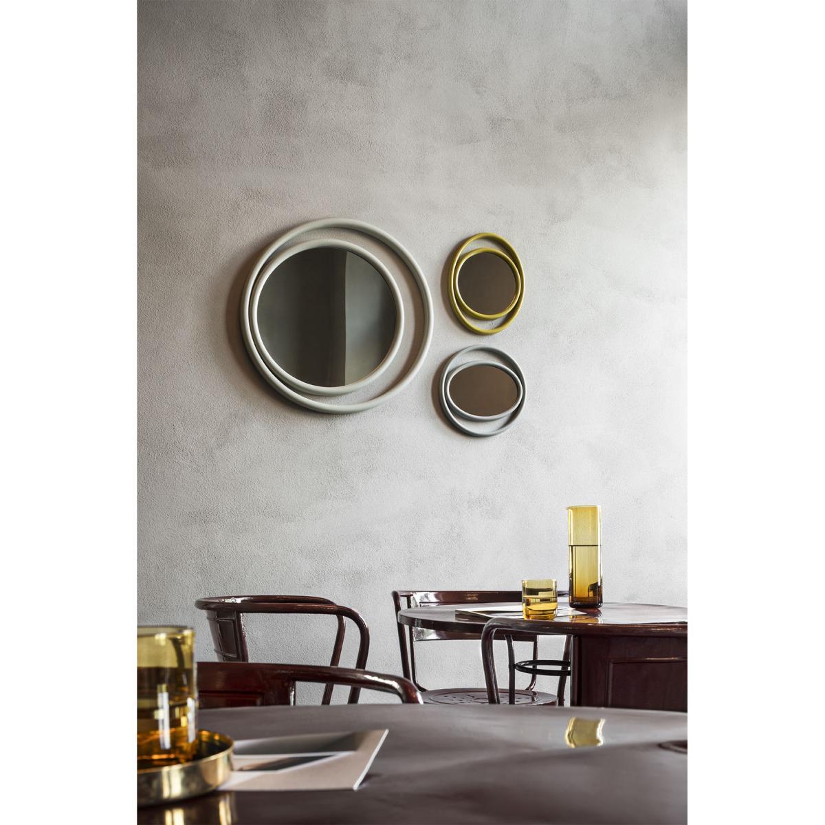 The Eyeshine mirror was designed in 2015 by British designer Anki Gneib. The curved element, found in all Wiener GTV Design's work, is introduced unexpectedly, in the form of simple circular geometric shapes that fit together to recreate the mystical power of the eye. Steam-bent beechwood surrounds the reflective surface at different levels, accentuating the inquisitive echo of the eye. Comes in a multitude of colors: please ask us.