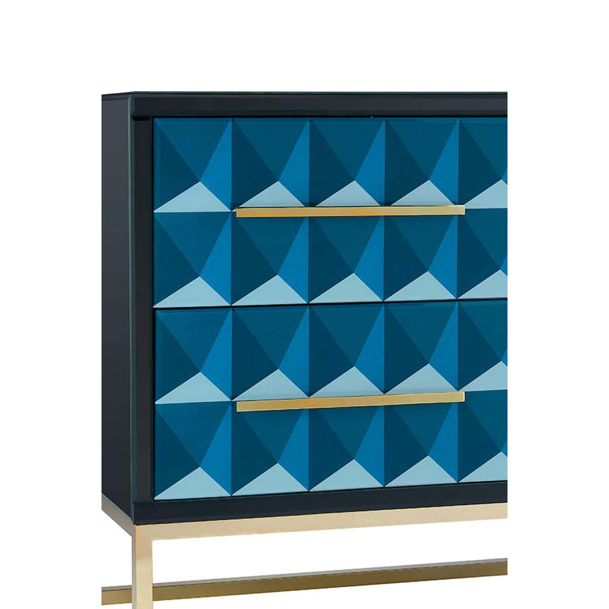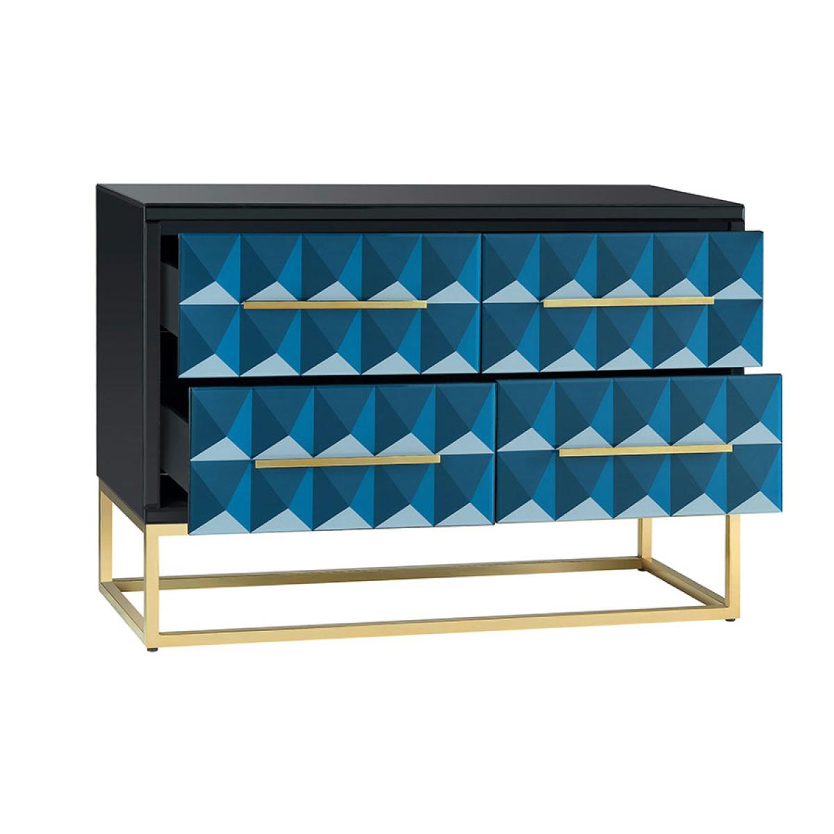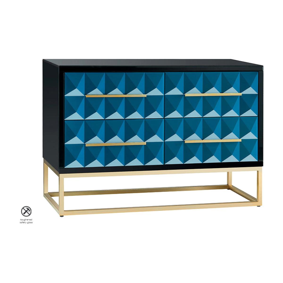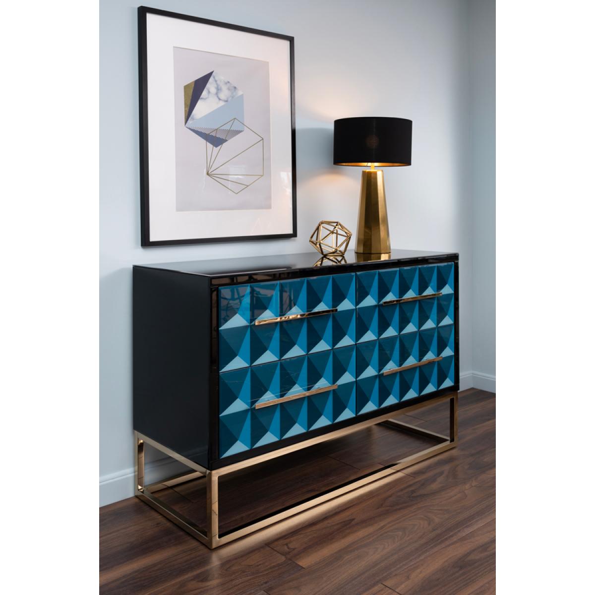 A bold statement chest of drawers. Strong and durable toughened black glass with bevelled edges with a playful graphic screen print in tones of blue. Four drawers with hidden soft-close runners. Steel legs and handles with a polished brass finish. Black painted interior. Part assembly required.