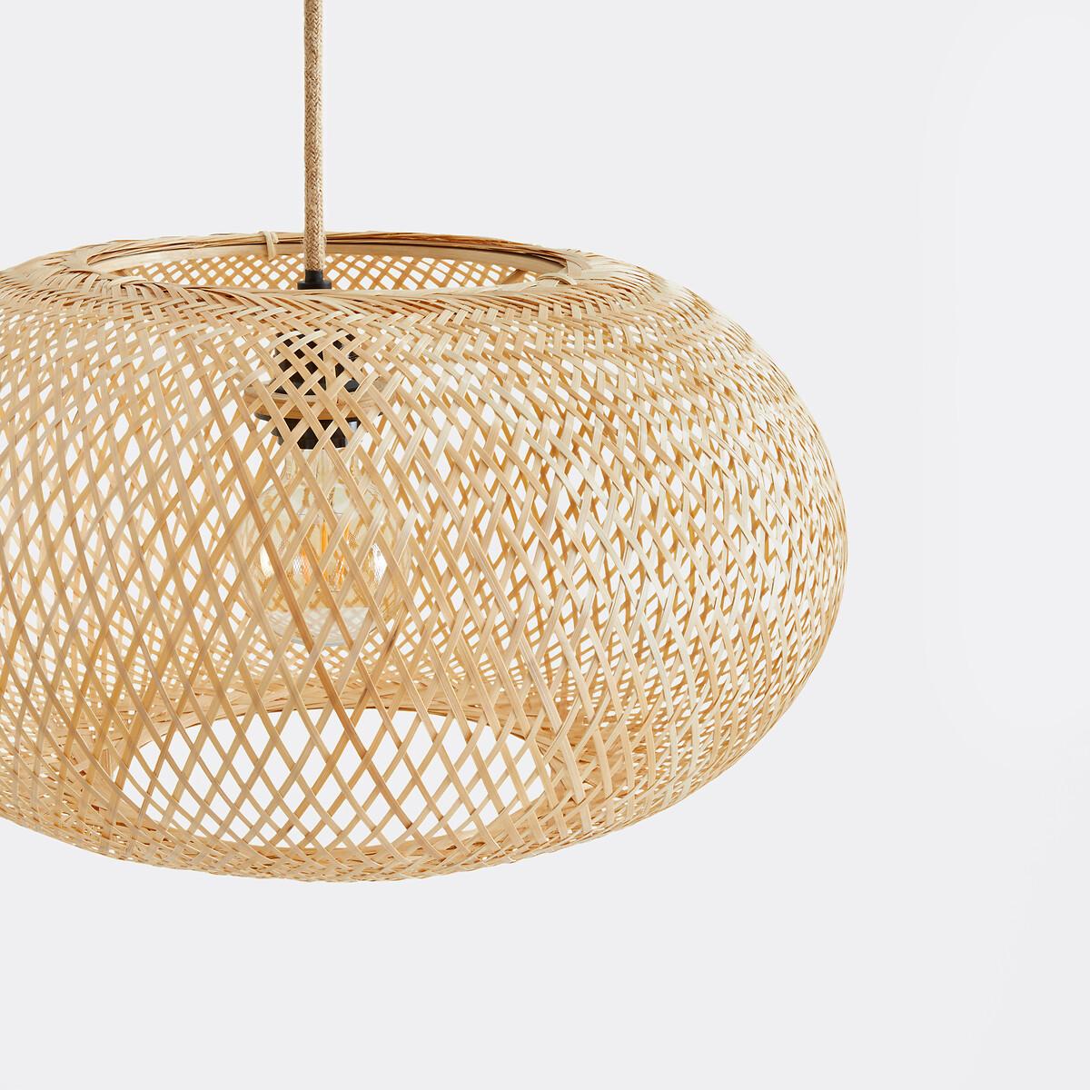 Honeycomb texture, light oval shape... The Ezia pendant lamp in hand-woven bamboo naturally diffuses a soft and comforting light. It blends into many styles with elegance. Product Details • In woven bamboo • Supports E27 bulb (not supplied) • This product is sold non-electrified. Find the Baulind electric cable sold on the site. • Artisanal craftsmanship. Dimensions • Diameter: 45cm • Height: 23cm. Dimensions and weight of parcel • 1 parcel • L47 x H25 x D47cm. Weight: 1.5kg