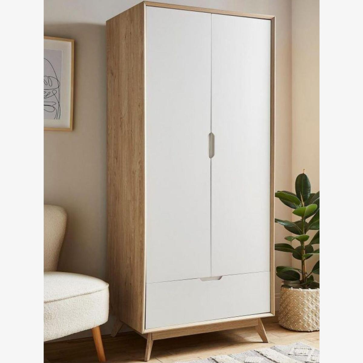 The Ezra 2 Door 1 Drawer Wardrobe features a distinctive Scandinavian style, combining classic retro looks with modern designs. Featuring matte, handleless doors and drawers along with a wood-effect frame with a natural looking textured grain finish, giving this range the look and feel of real wood. Standing on scandi-style legs with a matching skirt, this range will surely elevate the look and feel of your bedroom. Featuring a full length hanging rail with an internal shelf, along with an additional drawer with generous storage to keep all your bedroom essentials handy.