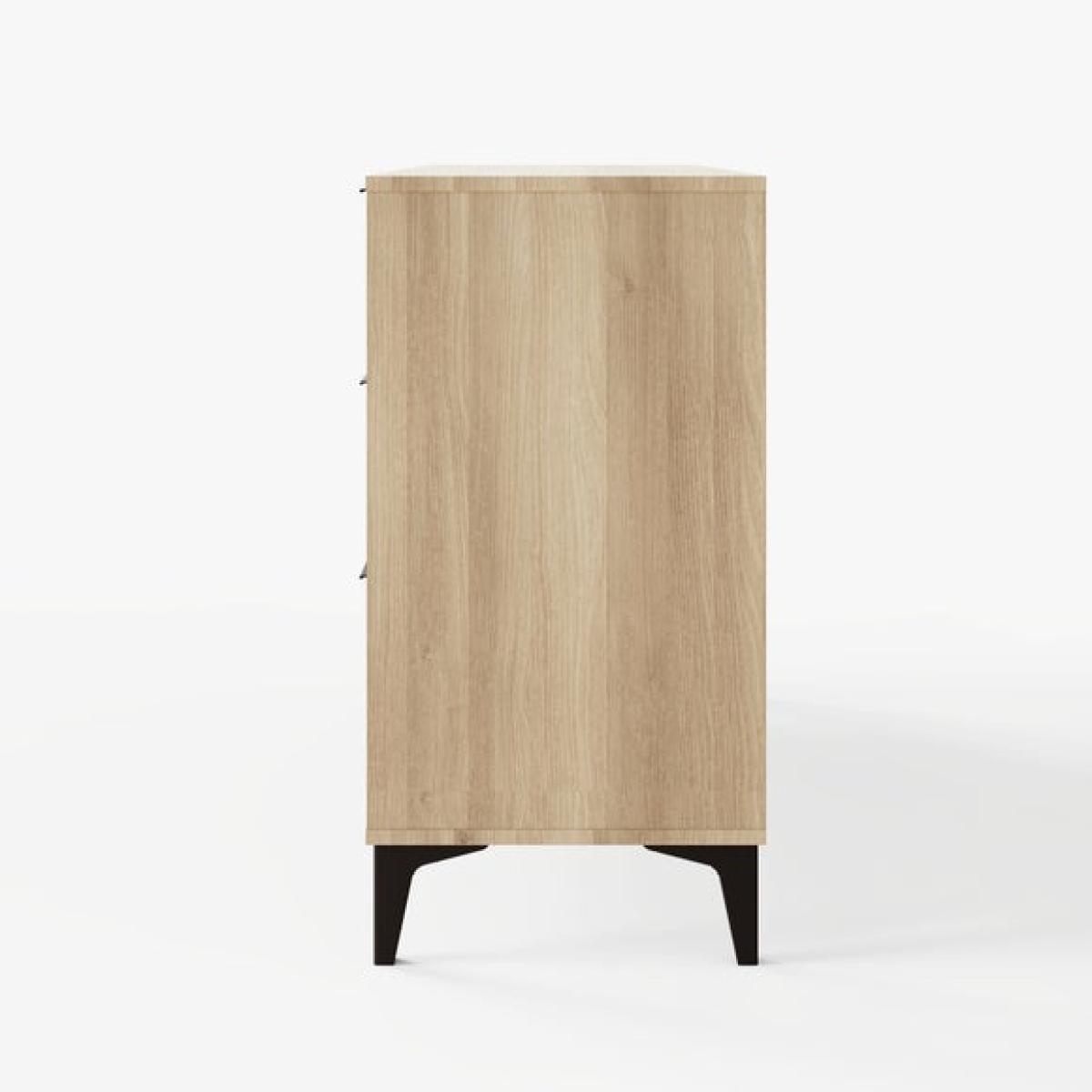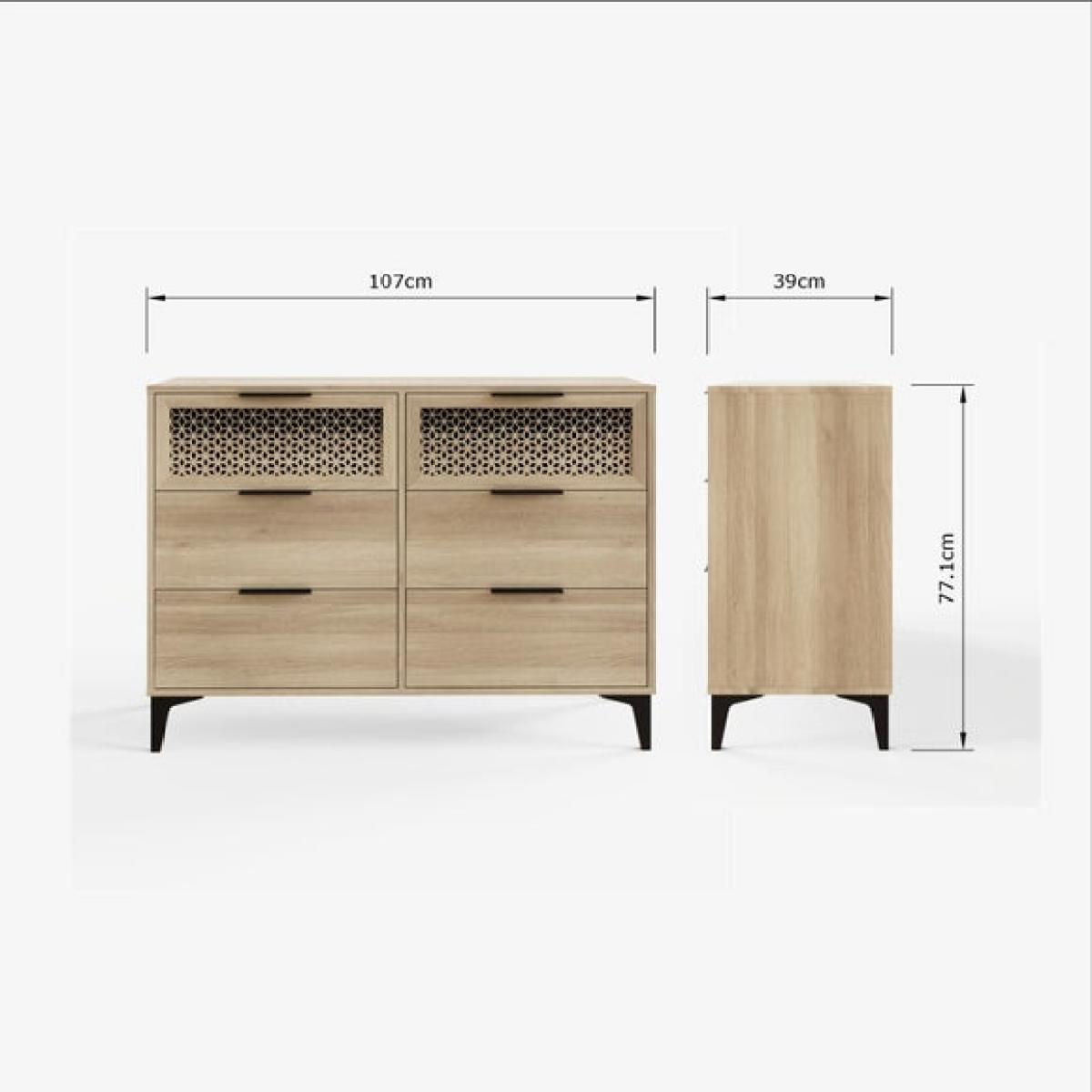 * Warm oak finish with a modern edge * Six roomy drawers for everyday storage * Laser-cut geometric detailing on top drawers * Sleek black metal handles A practical storage piece with a bold personality, the Ezra 6 Drawer Chest brings warmth and structure to your bedroom. Finished in a rich oak tone, it features six spacious drawers that are perfect for keeping clothes, accessories or spare bedding neatly tucked away. The top drawers are detailed with a laser cut geometric design that adds texture and interest without being too much. Black metal handles and tapered legs give it a clean modern finish that works well in both relaxed and contemporary spaces. Whether your style leans minimalist or boho, this chest fits right in. It is a smart choice for keeping clutter at bay while adding a touch of character.