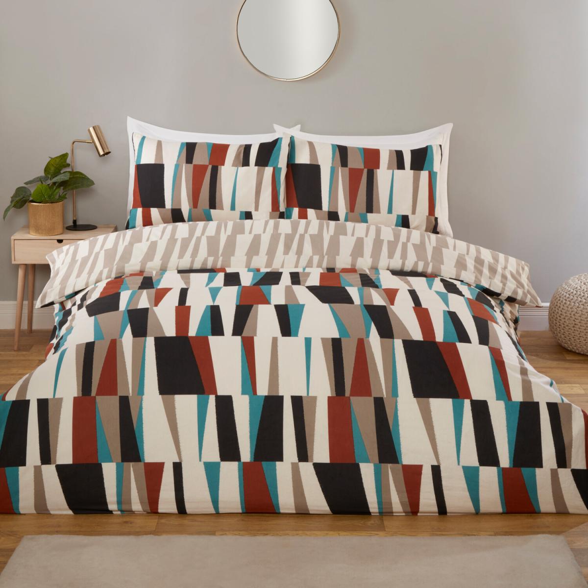 I love the Ezra Geometric duvet set for its bold, contemporary pattern and versatile colour palette. It works well in modern or eclectic interiors, especially those embracing mid-century influences or a monochrome scheme with a pop of colour. To style it effectively, consider pairing it with neutral bedside accessories to let the pattern stand out, or introduce accent cushions in one of the colours from the design for a cohesive look. It's practical too-durable and easy to coordinate with other bedroom elements, making it a smart choice for everyday use. Perfect for adding a touch of modern sophistication to your space without overwhelming the room.