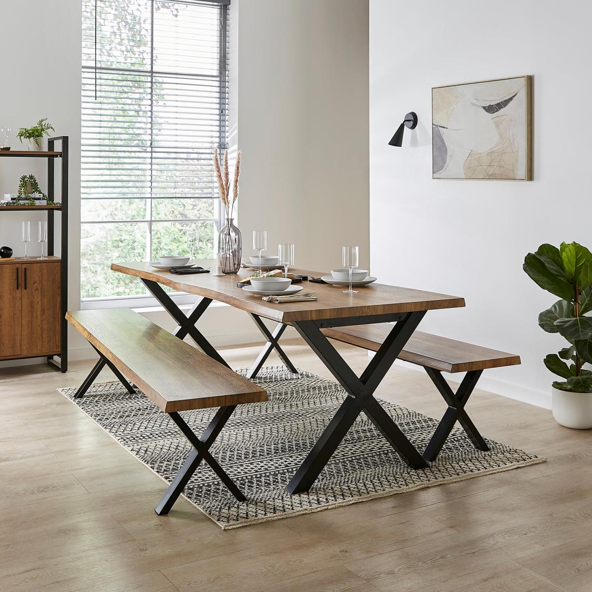 This dining table is a true gem in the collection, offering the perfect balance of sturdy construction, a chic industrial aesthetic, and the ability to cater to all your dining needs. This exceptional set is designed to elevate the ambiance of your home, adding a touch of modern elegance to your dining space. With its robust steel X-formation legs, this table exudes stability, ensuring that every meal is a secure and enjoyable experience. The industrial-inspired design seamlessly integrates with various home decors, while the wood effect surface adds a warm and inviting touch. Every time you gather around this table, you'll feel the unparalleled quality and craftsmanship it brings to your dining area.
