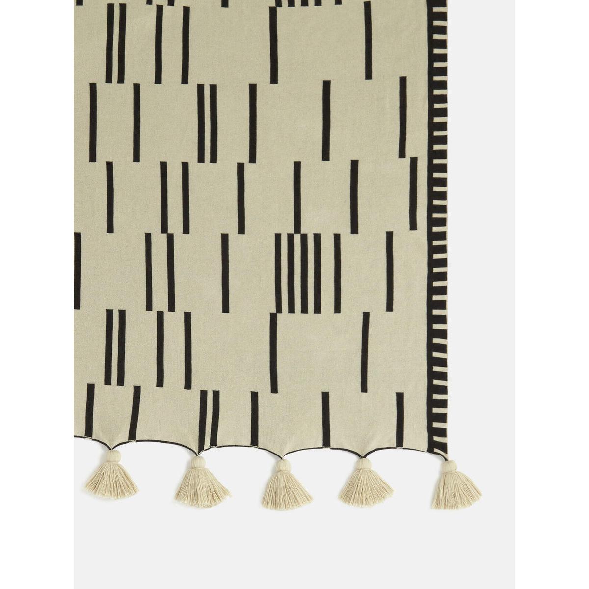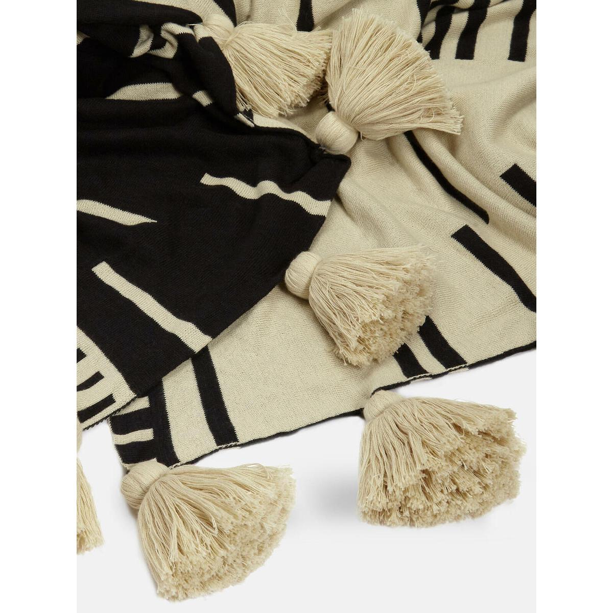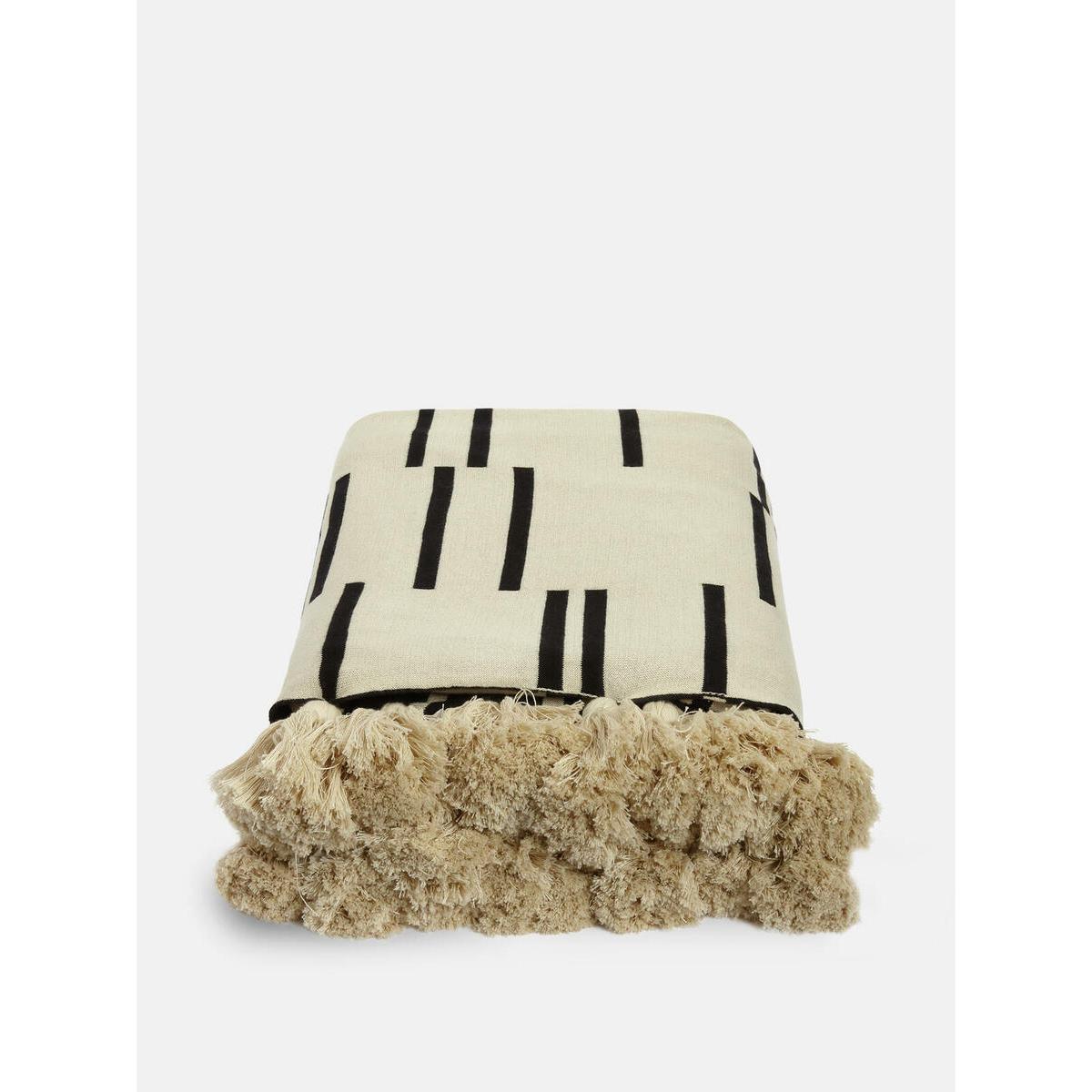 Cotton throw in oatmeal and black. Reversible design. Finished with oatmeal pompom tassels. Perfect size for the end of a bed.