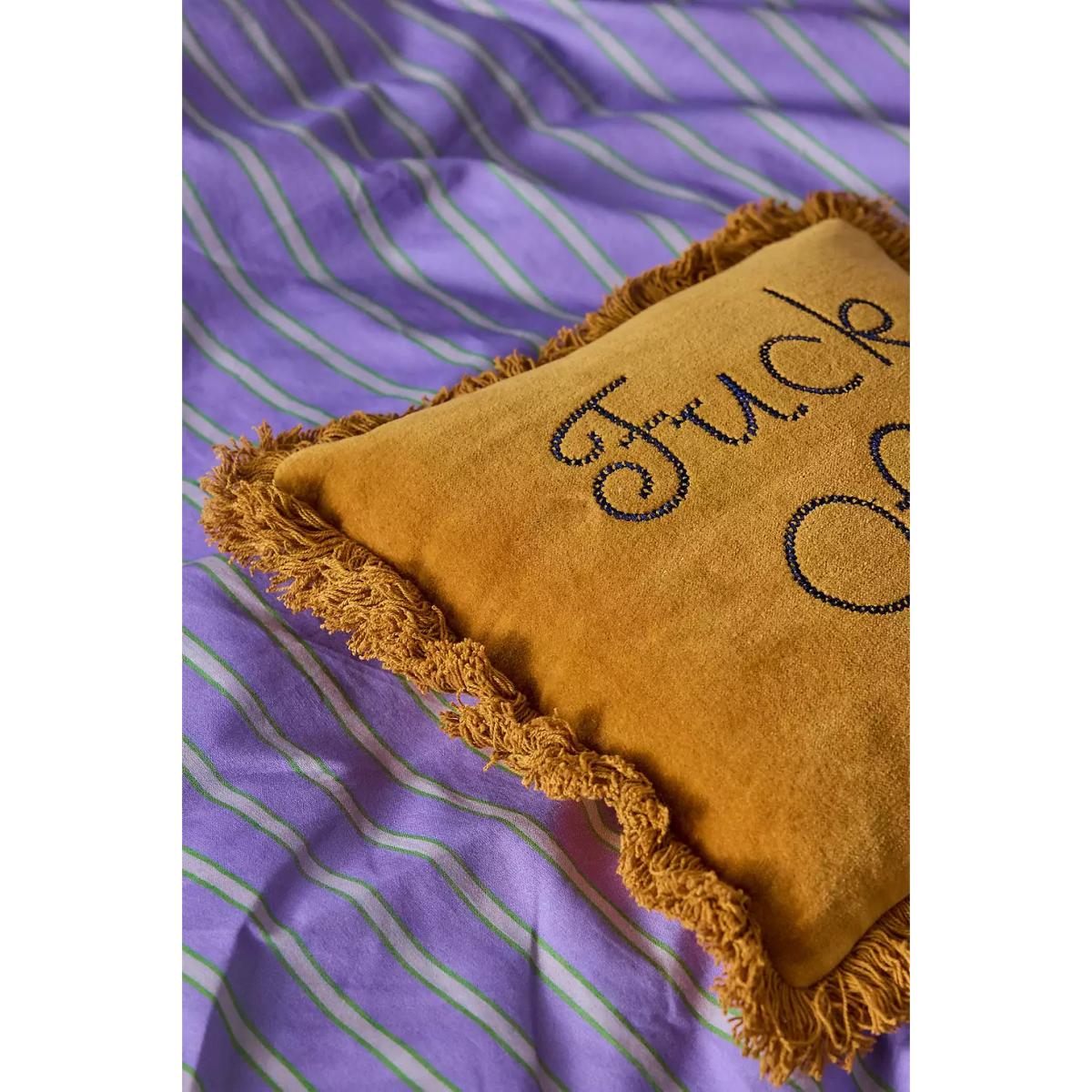 Add a pop of colour to your space with this mini cushion. Soft cotton fabrication complete with a sassy embroidered 'F*ck Off' slogan and fringed trims. **Content + Care** \- 100% Cotton cushion \- 100% Polyester filling \- Spot clean \- No removable inner cushion **Size** \- 25.5 x 25.5cm