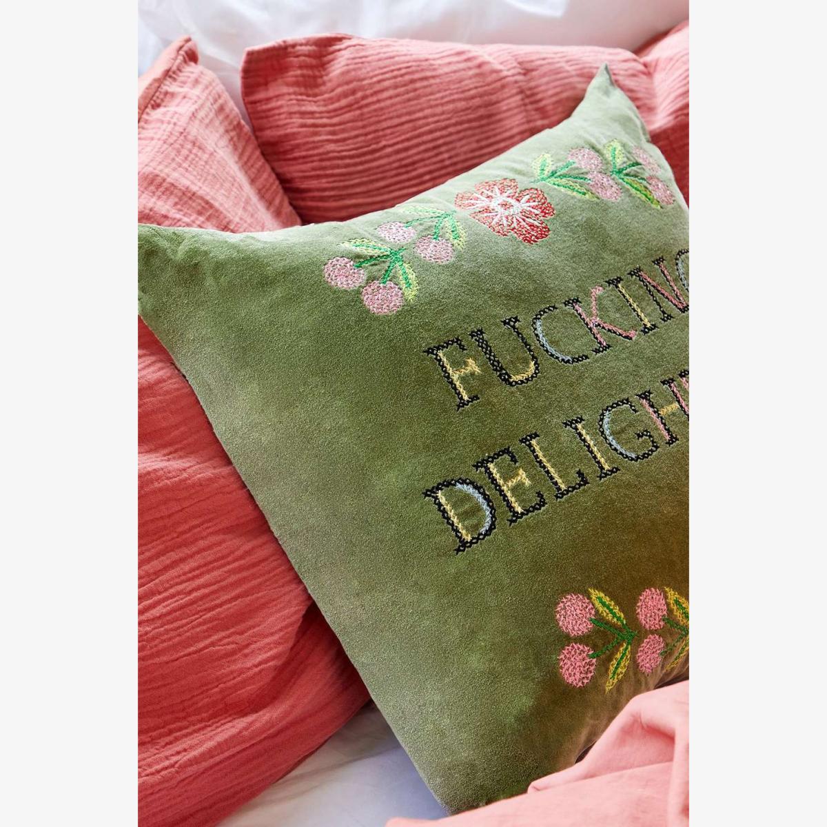 Inspired by the cutest cross stitch accents, this retro-inspired cushion is embroidered with a 'F*cking Delightful' motif and a floral border. Square silhouette cushion filled with a plush interior fill. **Content + Care** \- Main: 100% Cotton \- Fill: 100% Polyester \- Spot clean