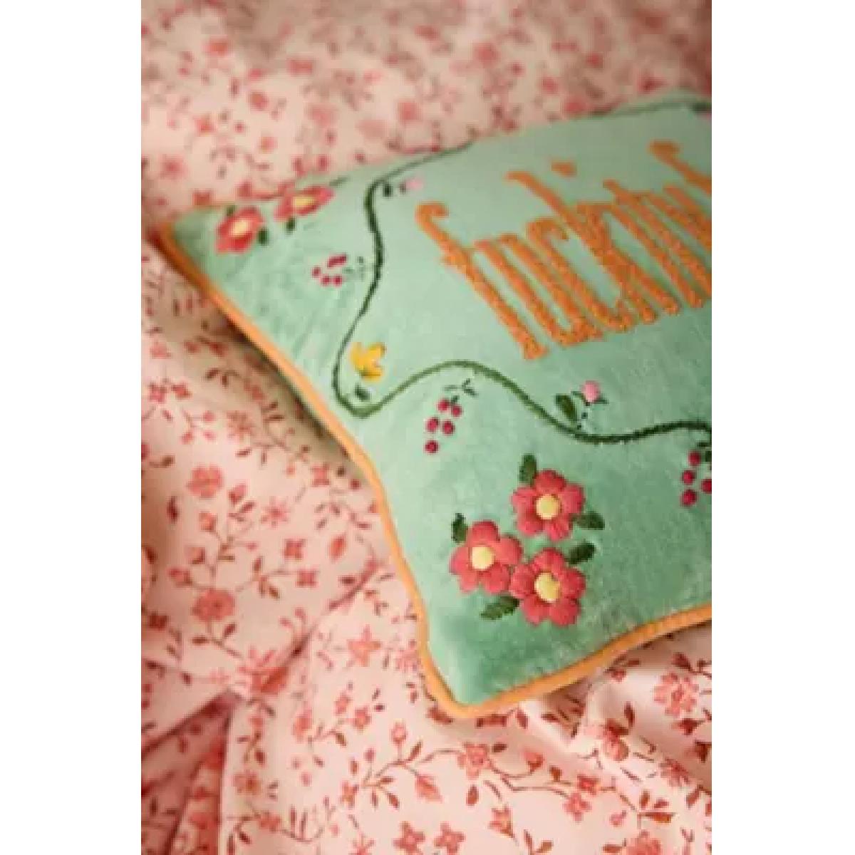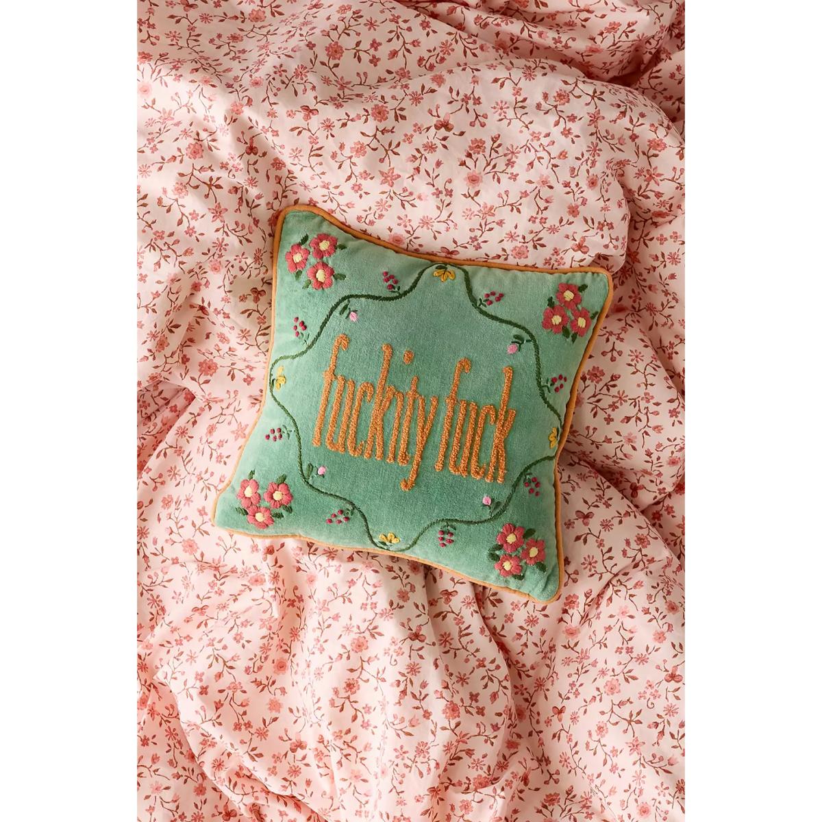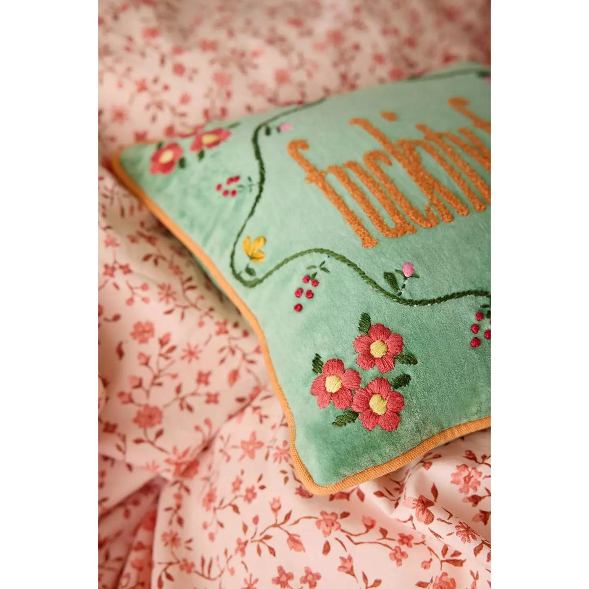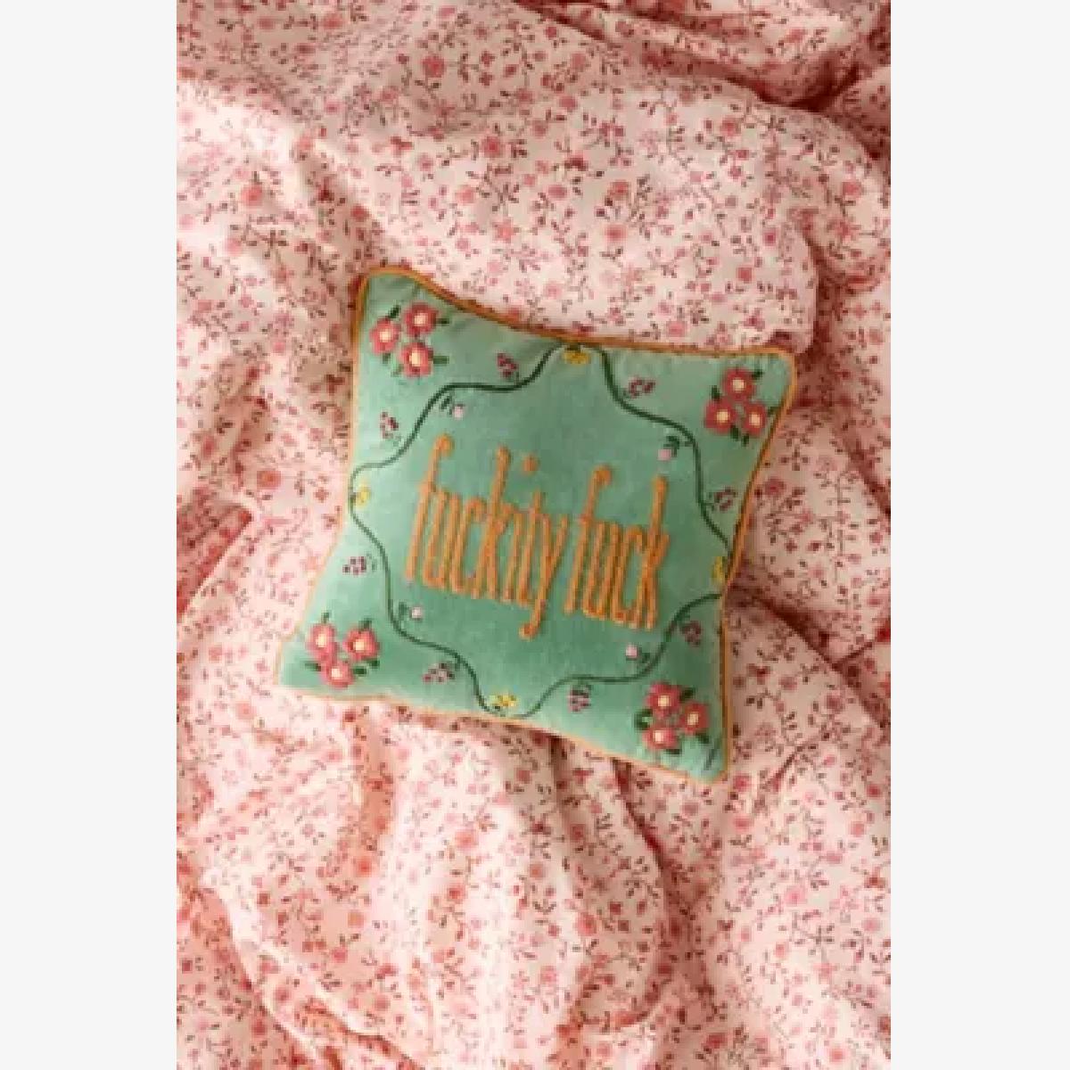 Cheeky statement cushion featuring bold embroidery on a soft green background. Adorned with intricate floral patterns in vibrant hues, framed with contrast piping. Perfect for adding a touch of irreverent charm to any living space. **Content + Care** \- 100% Cotton \- Filling: 100% Polyester \- Removable insert \- Machine wash **Size** \- 30.5cm x 30.5cm