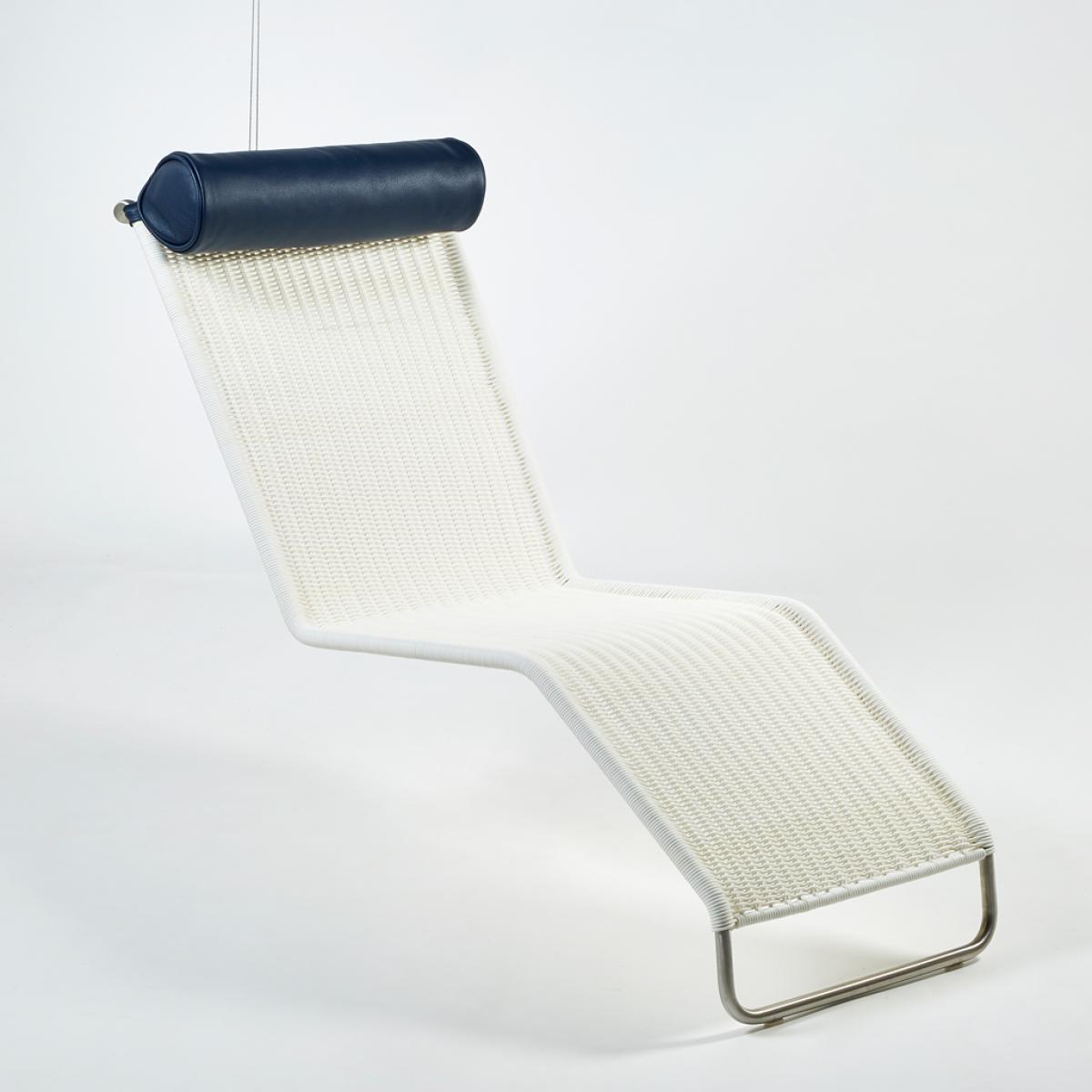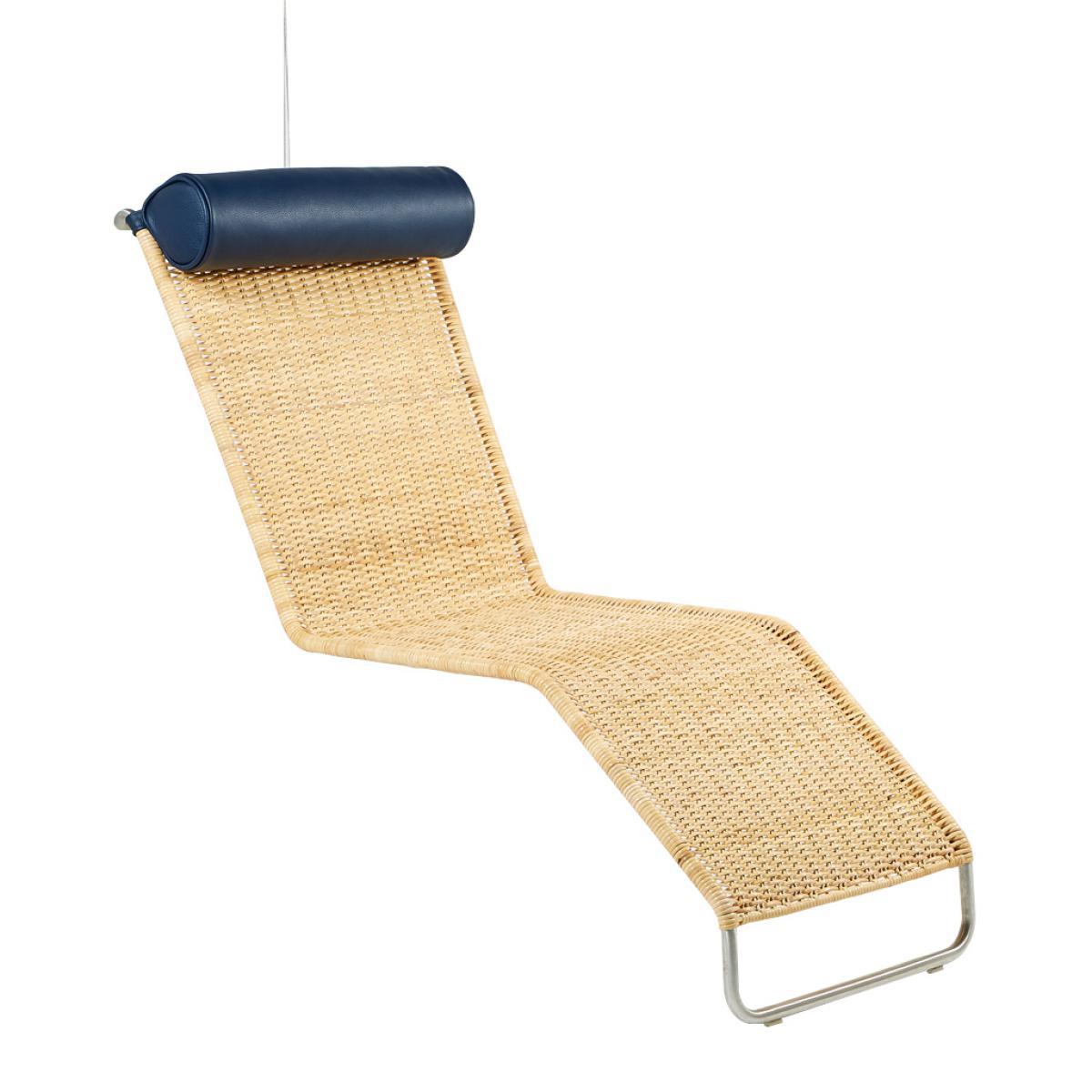 Originally known as the B4 Chair and designed by Ludwig Mies van der Rohe for the Haus Lange in 1931, the F42-E Hanging Outdoor Chaise Longue in white-hued wickerwork with a blue leather headrest is a true design icon that is crafted today by esteemed manufacturer Tecta and is exclusively available at The Conran Shop in the UK. Showcasing a tubular polished stainless steel frame and suspended from the ceiling using a secure fixture and a robust metal cable with spring suspension, the chair can be positioned in both sitting and lying positions to suit your space. Finished with white-hued Tecta wickerwork, that has been specially developped for outside use, and accented with a vibrant blue leather headrest, this chair would make a refined addition to any inside or outdoor space. Championing a 'less is more' approach to design, German-American architect Ludwig Mies van der Rohe is widely regarded as one of the pioneers of modernist architecture. The third and final director of the Bauhaus, he has gone down in history of one of the most important contributors to modern design. Please note: Whilst this chaise longue is suitable for outdoor use, we recommend bringing it inside or covering it between uses.